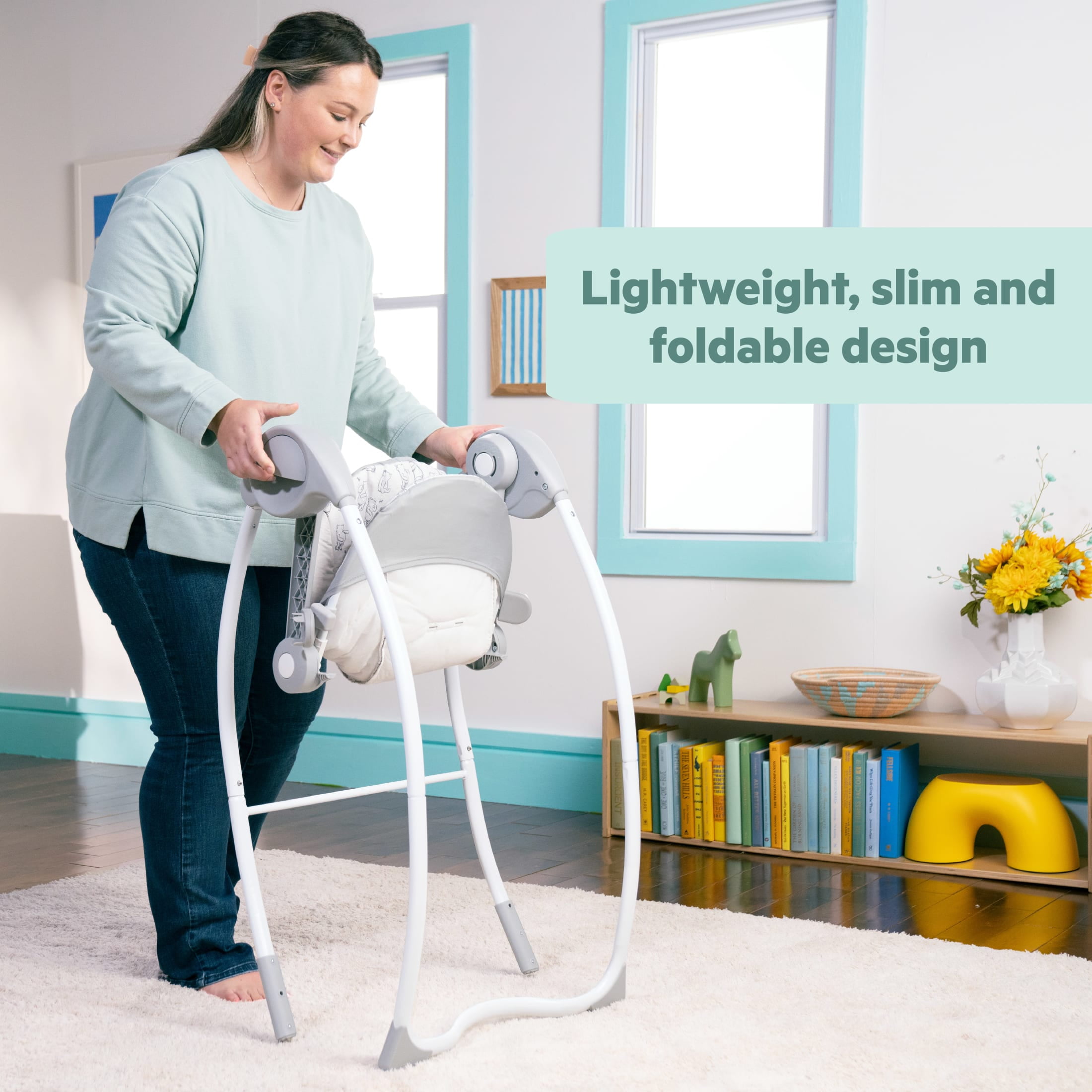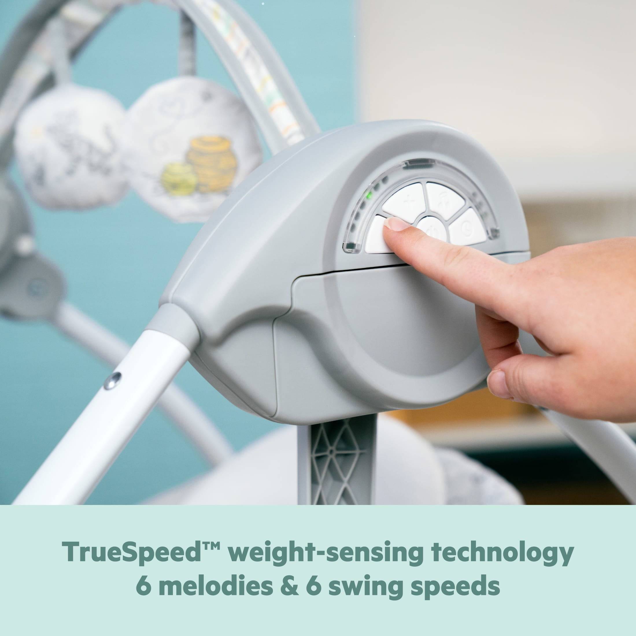 Bright Starts Disney Baby Winnie the Pooh Milestone Swing features 2 stages of interactive play: overhead for reaching/batting and in-front for more advanced activities Newborns can gaze up & bat at the overhead toy bar with Tigger crinkle toy and sun plush toy with tags; older babies can grasp & play with the bead chaser and spinning mirror toys on the lower activity bar Winnie the Pooh themed fabrics and toys introduce baby to the Hundred Acre Wood; 6 Pooh inspired melodies provide extra entertainment 6 swing speeds, 2 recline positions, 30/60/90-second timer & TrueSpeed weight-sensing technology make this the ultimate adaptable swing for baby’s needs Features a 5-point safety harness; this milestone swing is third party tested and approved; slim, foldable design is easy to store and take on the go Cleaning is a breeze with removable seat pad/headrest and wipeable pieces; no tools required for assembly; for babies 0 to 9 months or up to 20lb; 4 C batteries required (not included)