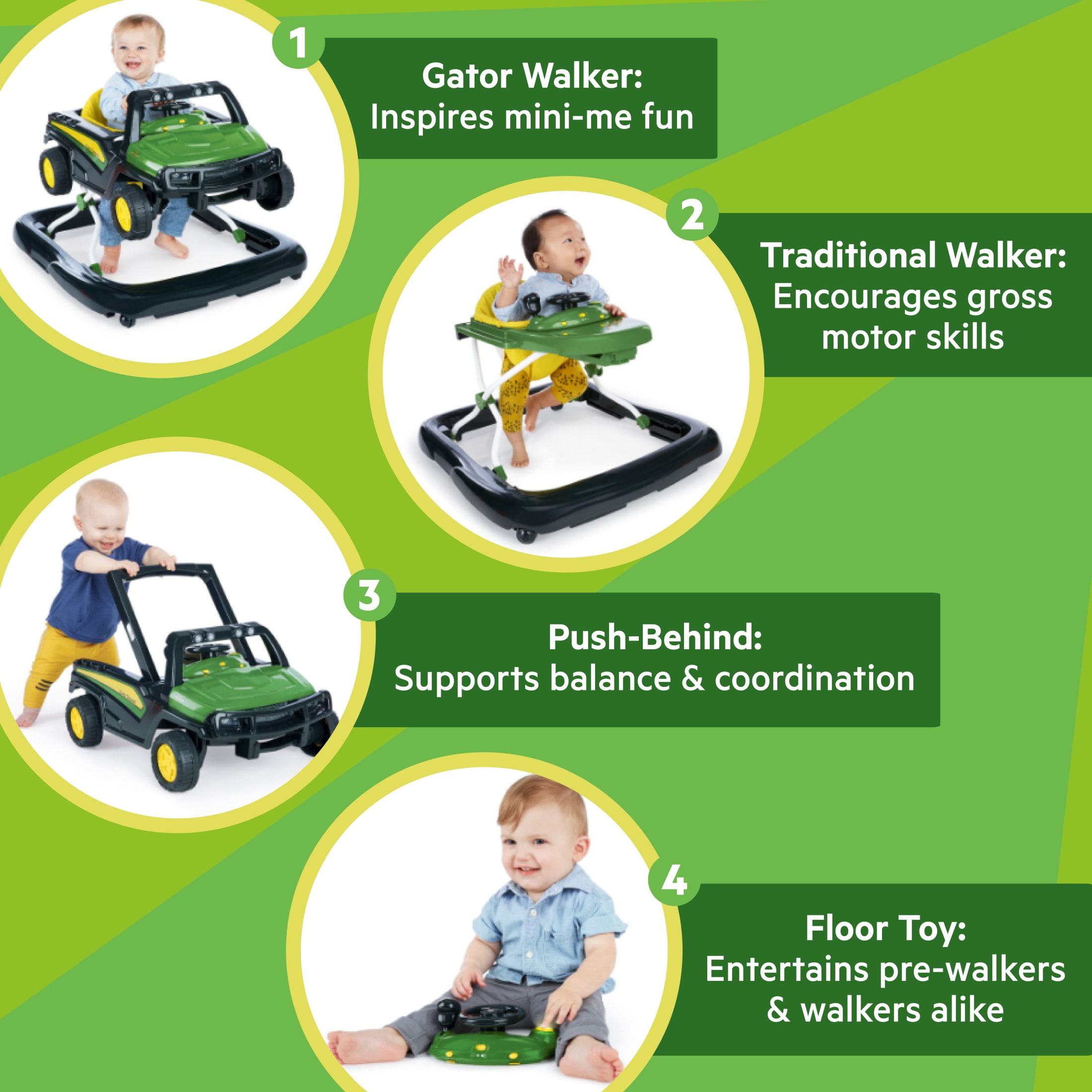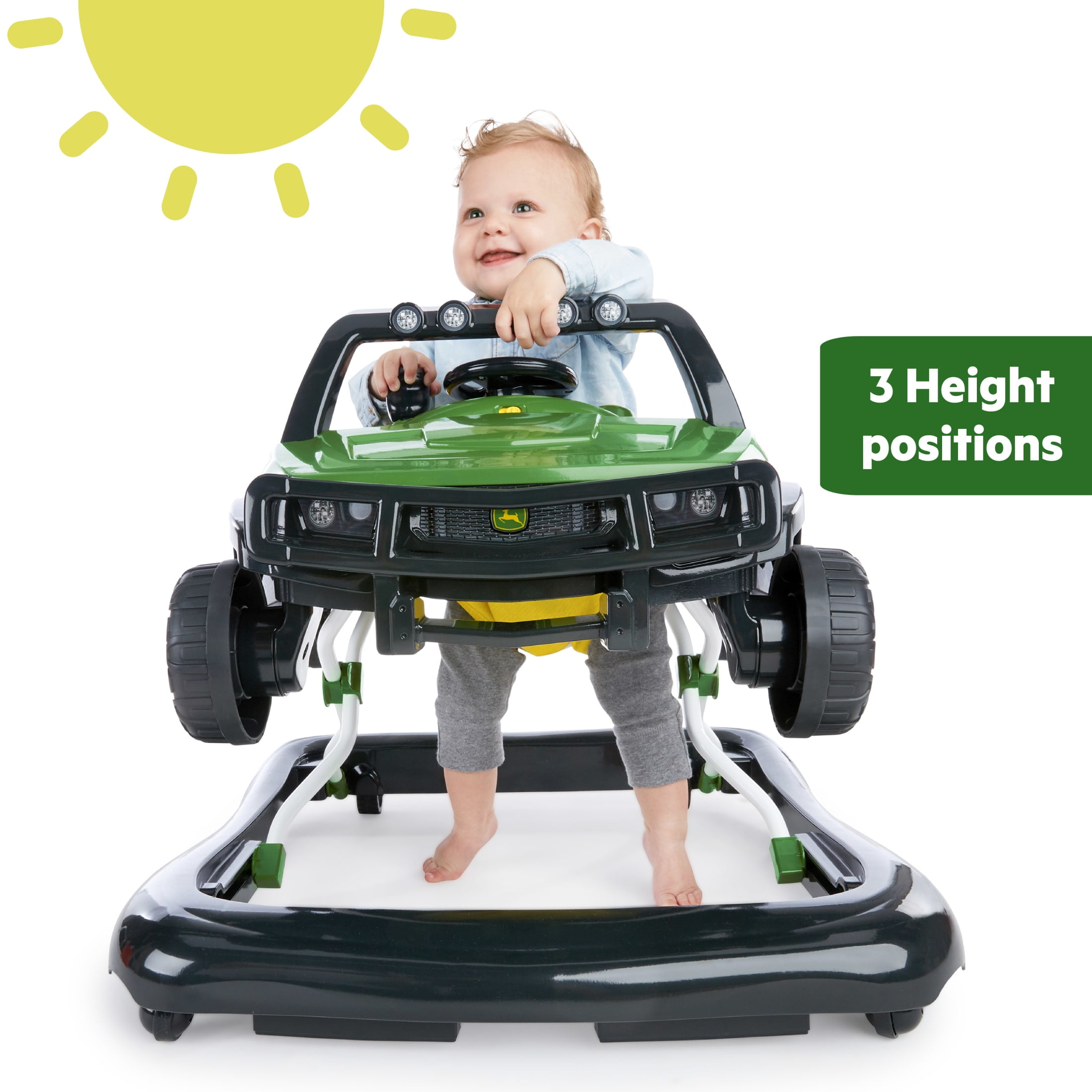 Bright Starts 3 in 1 John Deere Green unisex walker for infant supports both pre-walkers and more experienced walkers Plow ahead into walking with baby’s own Gator! Authentic John Deere details & sounds 3 Modes: Grows with baby’s development and multiple kids can play at once Folds easily for storage and portability