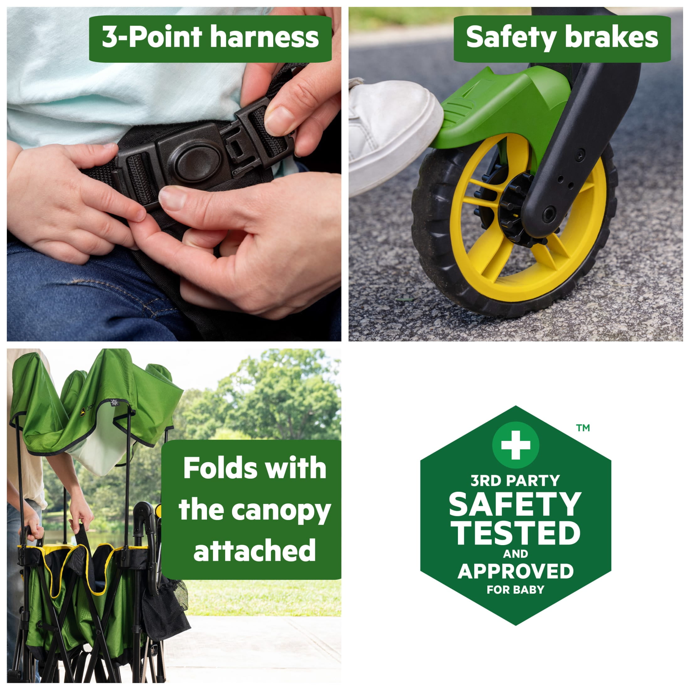 Weighing less than 25 pounds, the compact Bright Starts John Deere Stroller Wagon is easy to fold and unfold; perfect for your family’s everyday adventures 3-point safety harnesses for each seat keep your little farmers safe and secure; fits two children comfortably from ages 6 months and up to 50 pounds each Collapsible canopy helps protect your little one’s delicate skin with UPF 50+ sun protection Make the choice to push or pull with the height adjustable handles; four-wheel suspension and cushioned seat pad provide your little passengers with a smooth ride Enjoy many of the features of a premium wagon such as easy maneuverability, a rear storage pocket, and a parent cup holder in one lightweight model; John Deere theme