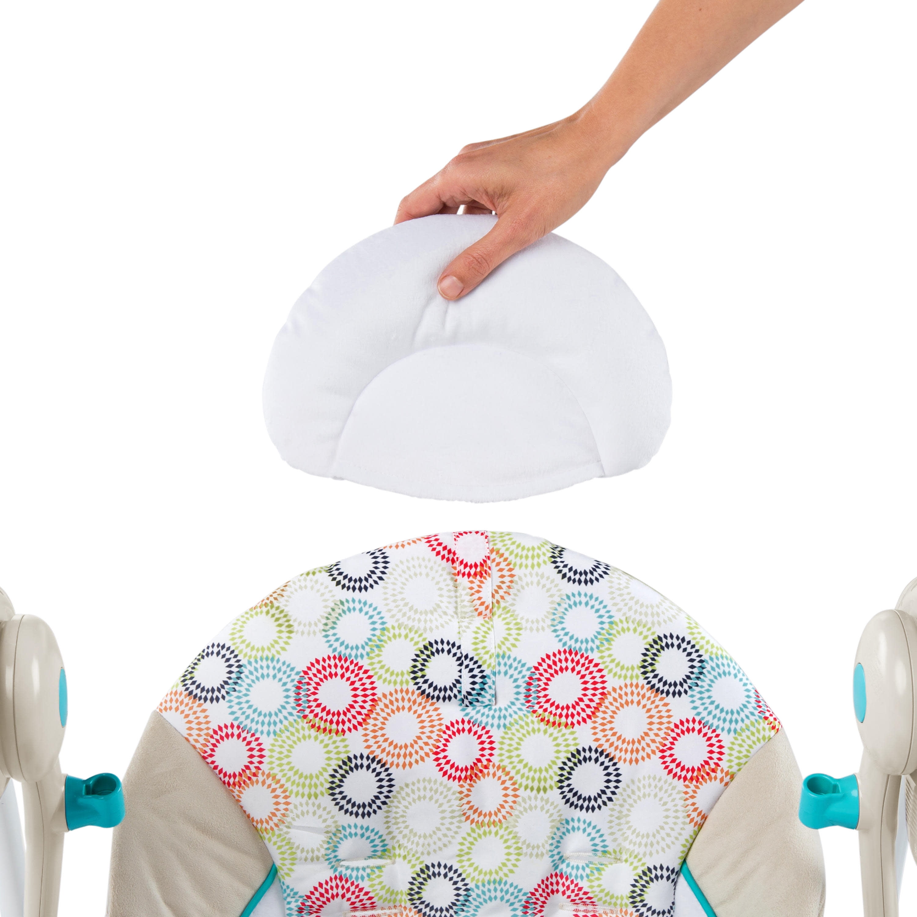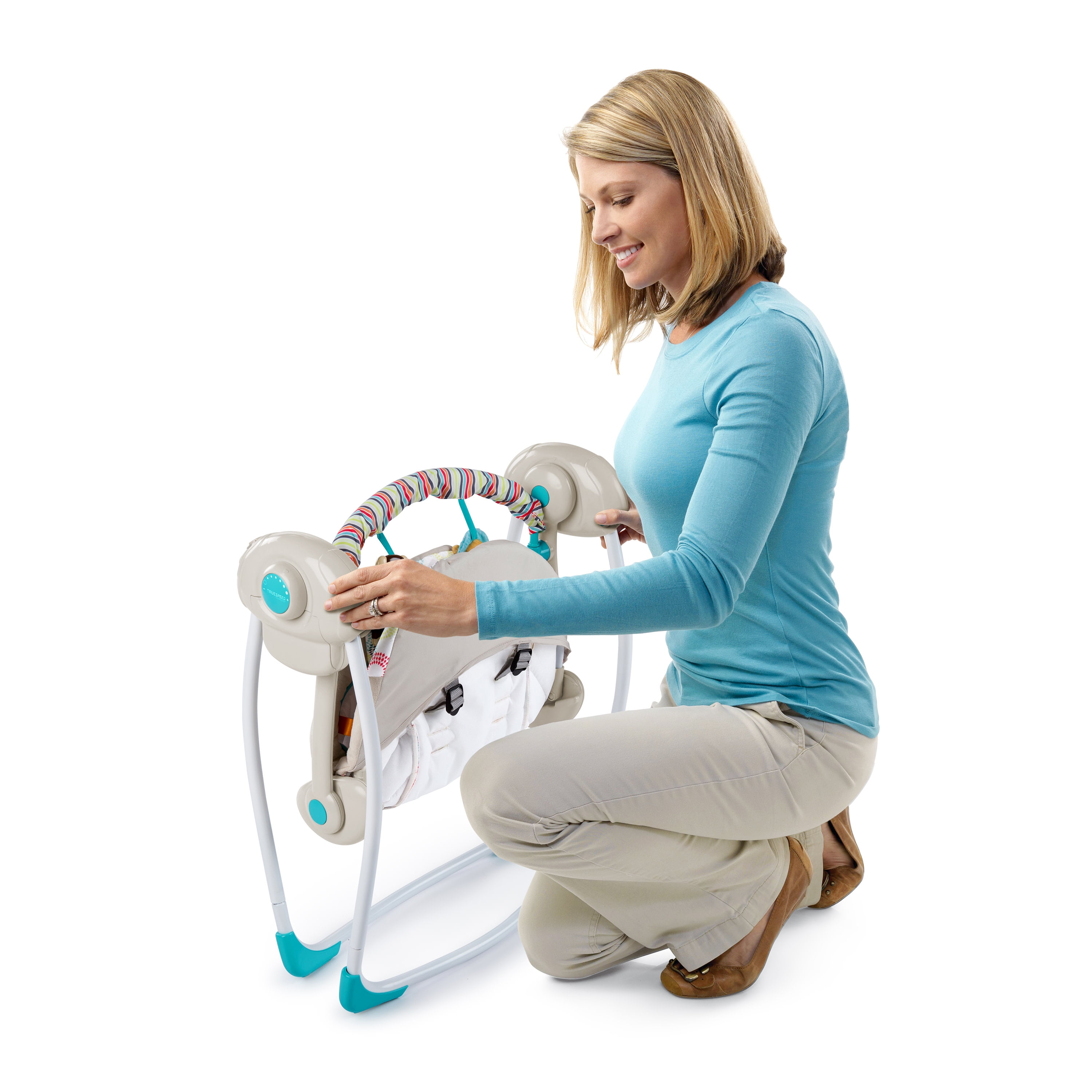 All the conveniences of a full-size swing in a portable, space-saving size Weight-adapting technology means baby’s favorite speed will remain consistent, even as baby gets bigger 6 original melodies with volume control and auto shut-off Bright, engaging Taggies tags Easily folds for travel & storage WhisperQuiet operation for a virtually noiseless experience Removable toy bar for easy access to baby includes 2 engaging toys Adjustable 5 point harness keeps baby secure