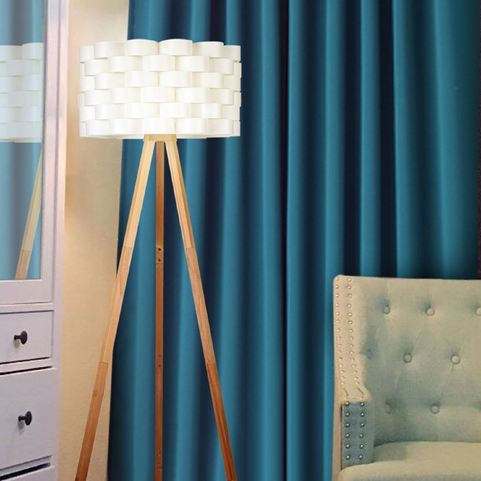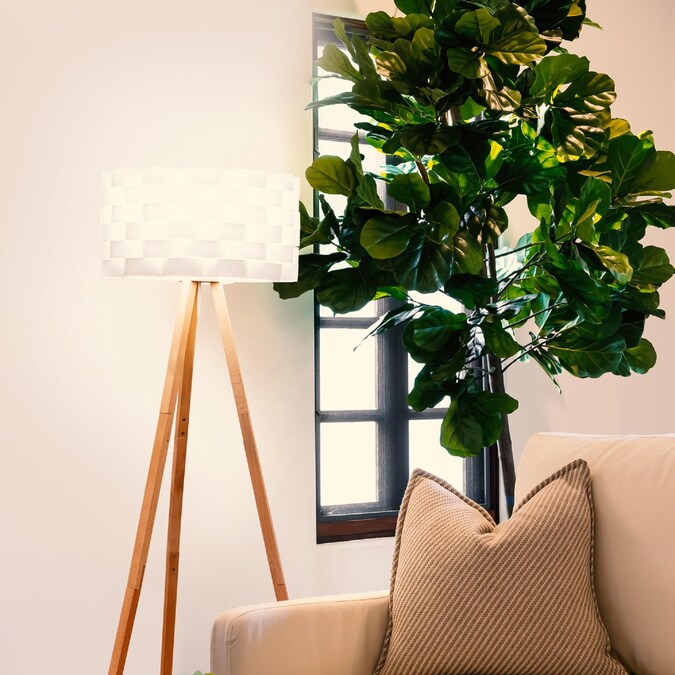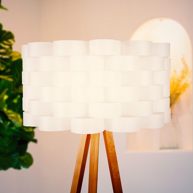 • The 10-inch cylindrical lampshade’s unique weave of interlacing ribbons complements the natural wooden tripod base