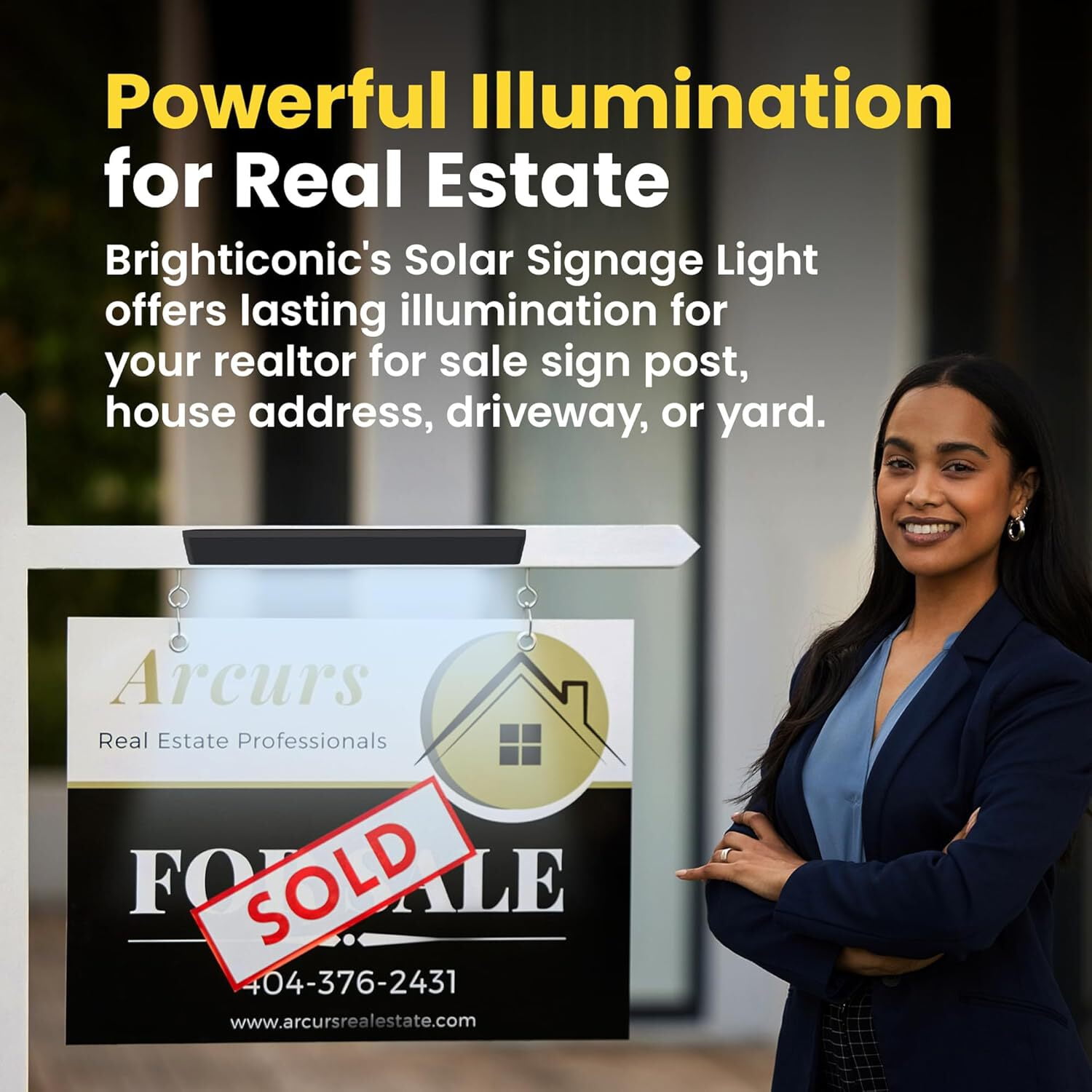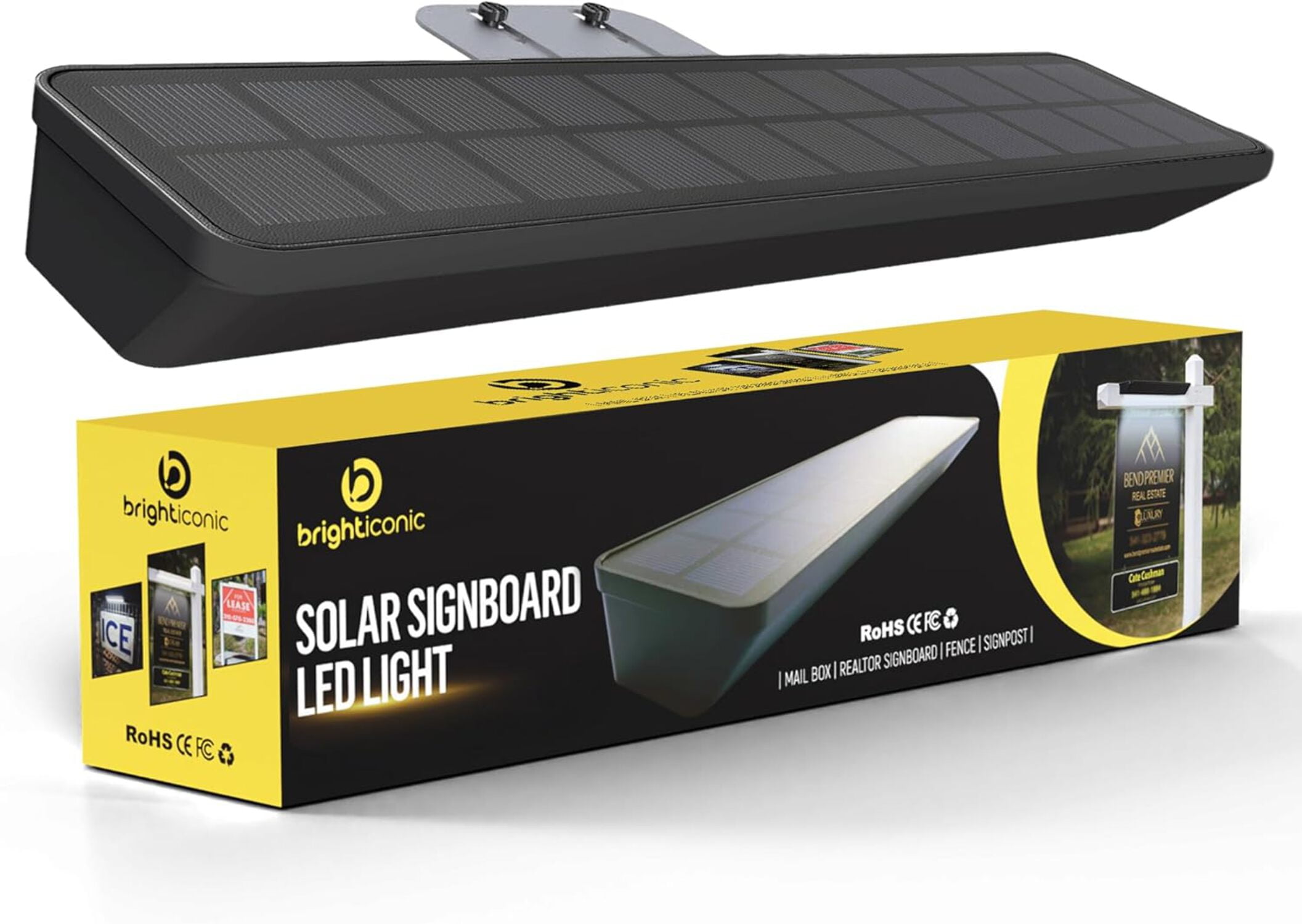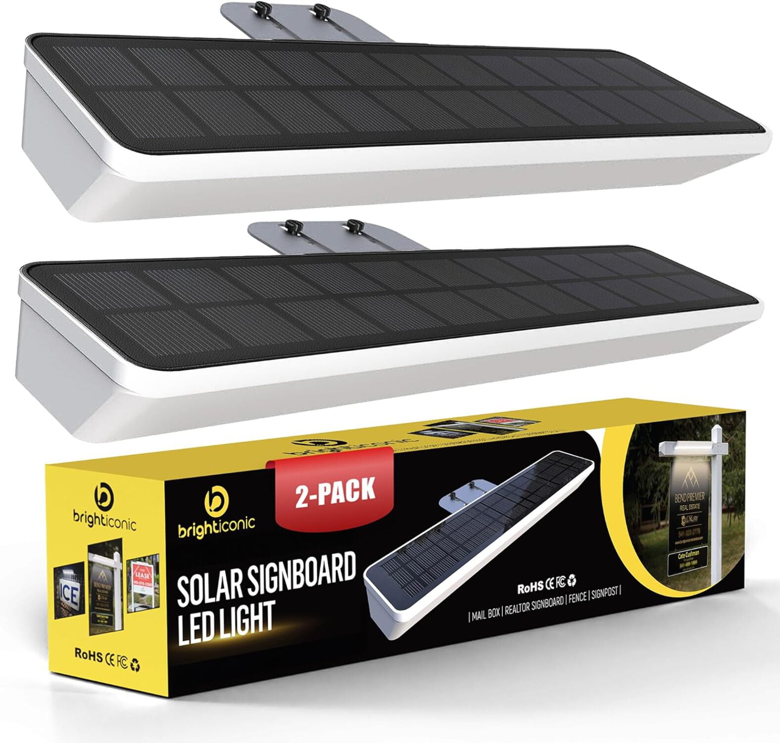 Illuminate Your Message Efficiently Effortlessly elevate your advertising and real estate visibility with Brighticonic Solar Sign Lights. These premium LED lights are designed for maximum impact, ensuring your signs remain visible and compelling day and night. Applications: Billboard Lighting Real Estate Signage Business Signs Address Number Illumination Door Number Lighting Small Signboards Solar-Powered display Lights and More Key Features: Superior Illumination: Provide ultra-bright illumination, doubling the visibility time of your signs. Weather-Resistant Design: Engineered to withstand diverse weather conditions for longevity and consistent performance. Dusk to Dawn Operation: Automated functionality turns the lights on at dusk and off at dawn, providing maintenance-free outdoor sign lighting. Easy Installation: Comes with adjustable mounting brackets, 2 rectangle white lights, and all necessary hardware. Activate effortlessly with the provided pin-button mechanism. Energy-Friendly & Cost-Efficient: Harness the power of the sun, minimizing energy costs and reducing environmental impact. Enhanced Visibility: Whether lighting up a billboard or real estate signs, ensure your message stands out, improving readability and brand recognition. Community Safety & Marketing: Well-lit signs aid emergency responders, while businesses benefit from enhanced visibility, fostering a professional image and positive customer experience. Illuminate your signs with confidence using our advanced solar sign post lights. Whether advertising along a bustling highway or guiding customers to your business location, ensure your message shines bright with our reliable lighting solutions. Illuminate your signs with confidence using our advanced solar sign post lights. Whether you’re advertising along a bustling highway or guiding customers to your business location, ensure your message shines bright with our reliable lighting solutions. Specs: Color Temperature: PURE WHITE LED: 15pcs, IP Rating: IP65, Lamp Body Material: Aluminum Alloy, Material: ABS, Battery: Li-ion battery 3.7V 2600mAh, Input Voltage: 3.7V, Charging Time: 7-8H, Lighting Time: 2-3 days once fully charged, Working Mode: Constant lighting, Working Lifetime: 50000hrs, Working Temperature: -13 – 149 Fahrenheit Lamp Luminous Efficiency: 100, Color Rendering Index: 80, Certification: CE, FCC, RoHS 1 Year Warranty User Guide Solar Sign Lights for Advertising & Real Estate | Brighticonic