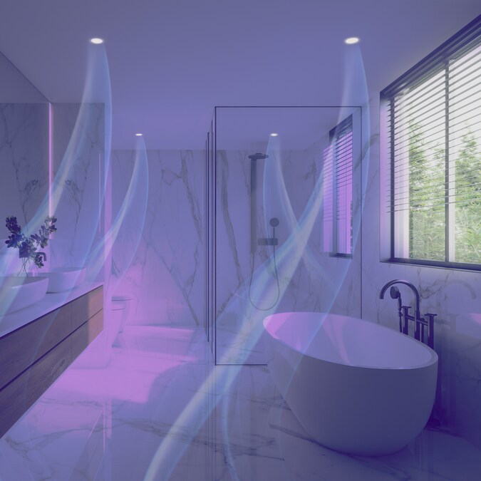 Testing on a non-enveloped virus (MS2 bacteriophage) showed a 99.985% reduction in controlled laboratory testing in 6 hours on hard surfaces. MRSA and E. coli showed 90+% reduction in controlled laboratory testing in 24 hours on hard surfaces. Results may vary depending on the amount of light that is reaching the surfaces in the space where the product is installed and the length of time of exposure. Use of Vyv antimicrobial light is not intended to replace manual cleaning. Discover the Brilli Bright Clean recessed shower light. The Brilli Bright Clean Antimicrobial Recessed LED Light Fixture (formerly known under the Ellumi brand) uses patented Antimicrobial LED technology to kill and stop the growth of viruses, bacteria, mold, mildew and fungi. Brilli Bright Clean technology doesn’t use ultraviolet (UV) light; so you can use it continuously around your family without worry. This technology is powered by Vyv, the market leader in UV-free Antimicrobial LEDs. Vyv provides solutions in many industries, including: health care, food safety and preparation, pharmaceutical and biotech manufacturing, consumer products and services, travel and hospitality, athletics and agriculture. This antimicrobial fixture is wet-rated, meaning it can be used above a shower or bath. It’s perfect for bathrooms, kitchens, laundry rooms, mud rooms, and basements. While surfaces in these spaces may look clean; cold and flu viruses, mold, fungi and bacteria such as E.coli and MRSA may be lurking around. This fixture has two lighting modes: Standard Lighting Mode, featuring a soft white light with an output of 1000 lumens, 3000K, and a color rendering of 90+, and violet antimicrobial mode, which features a purple light that stops the growth of, and kills microorganisms on surfaces. For best results, install the fixture up to nine feet from target surfaces. The retrofit kit makes this an easy installation for any DIY project for replacing your current recessed light.