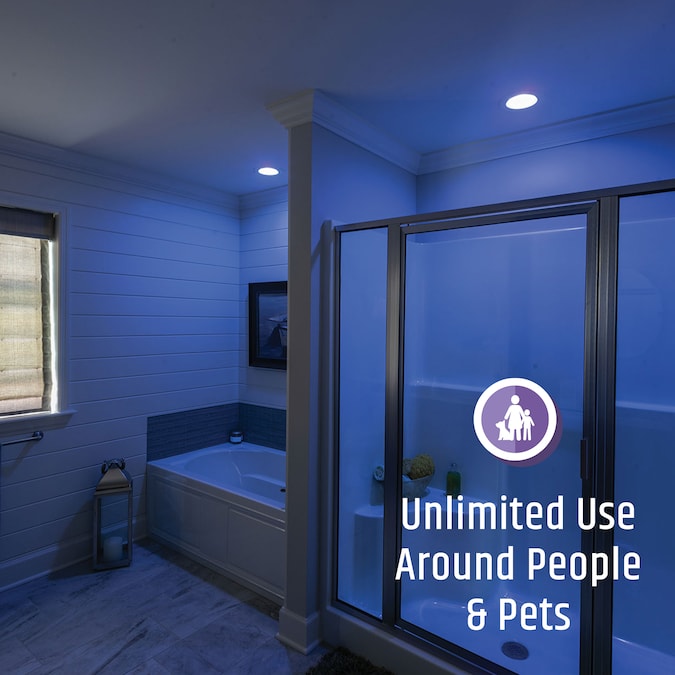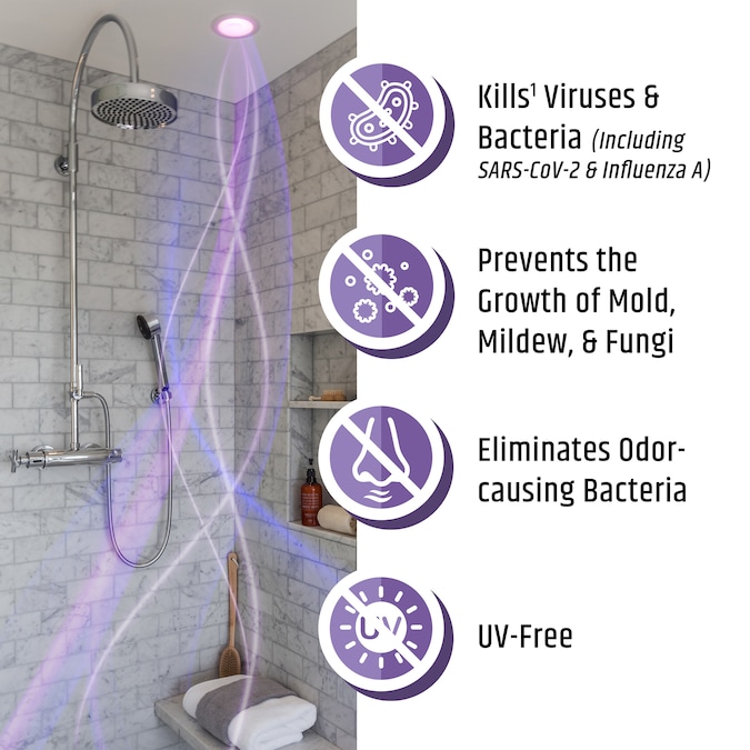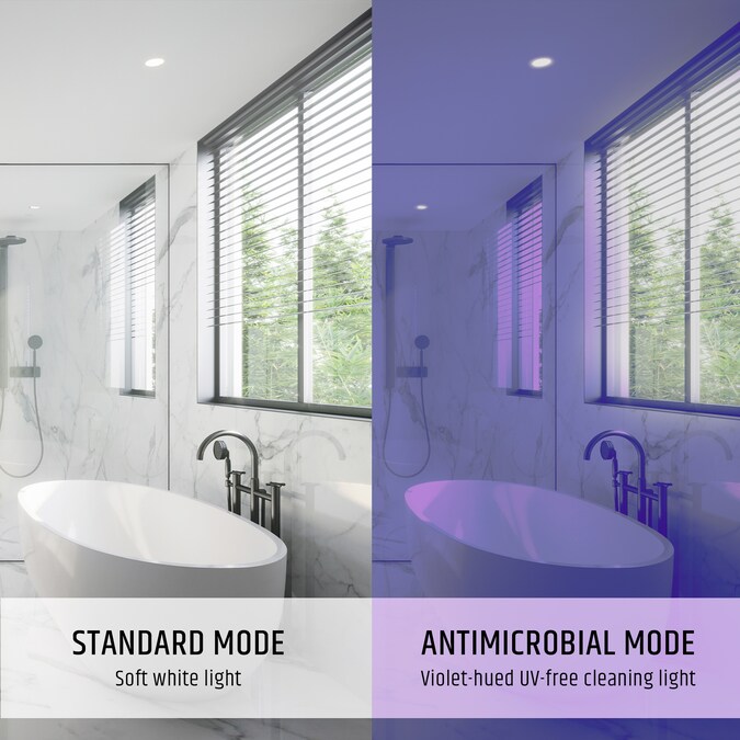 - Two light modes: Antimicrobial Mode (purple-hued cleaning light) and Standard Mode (soft white light). Shift between modes easily by flipping wall switch