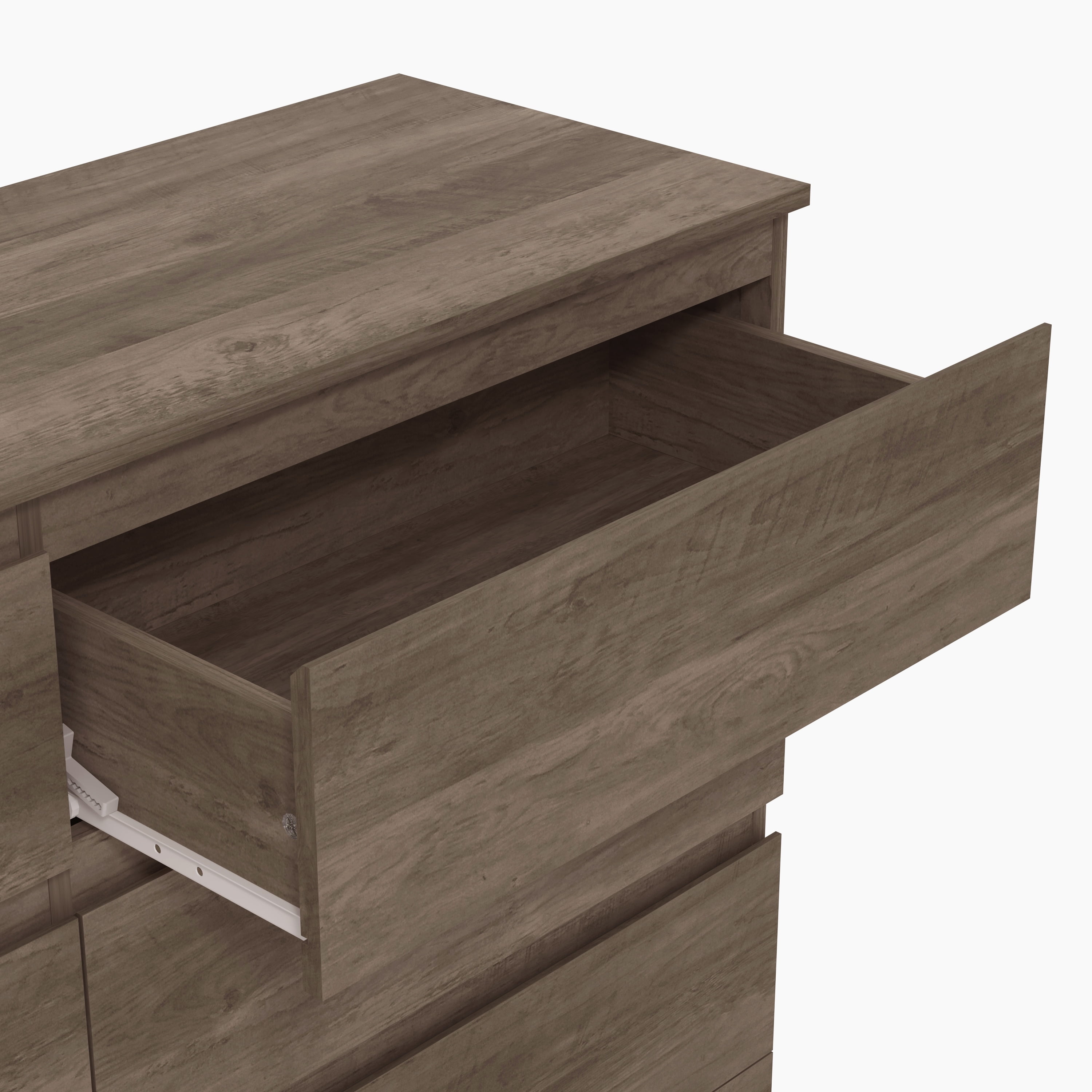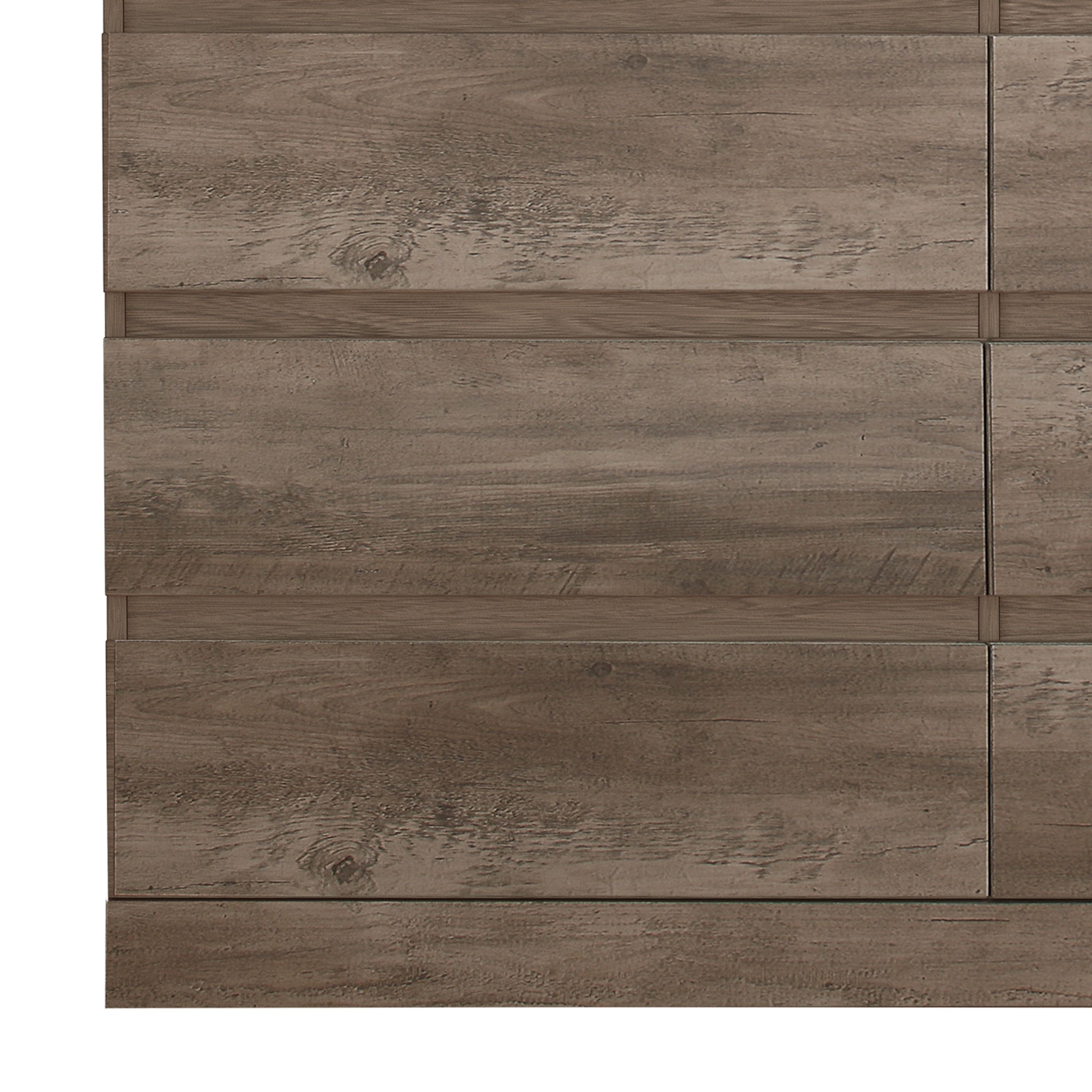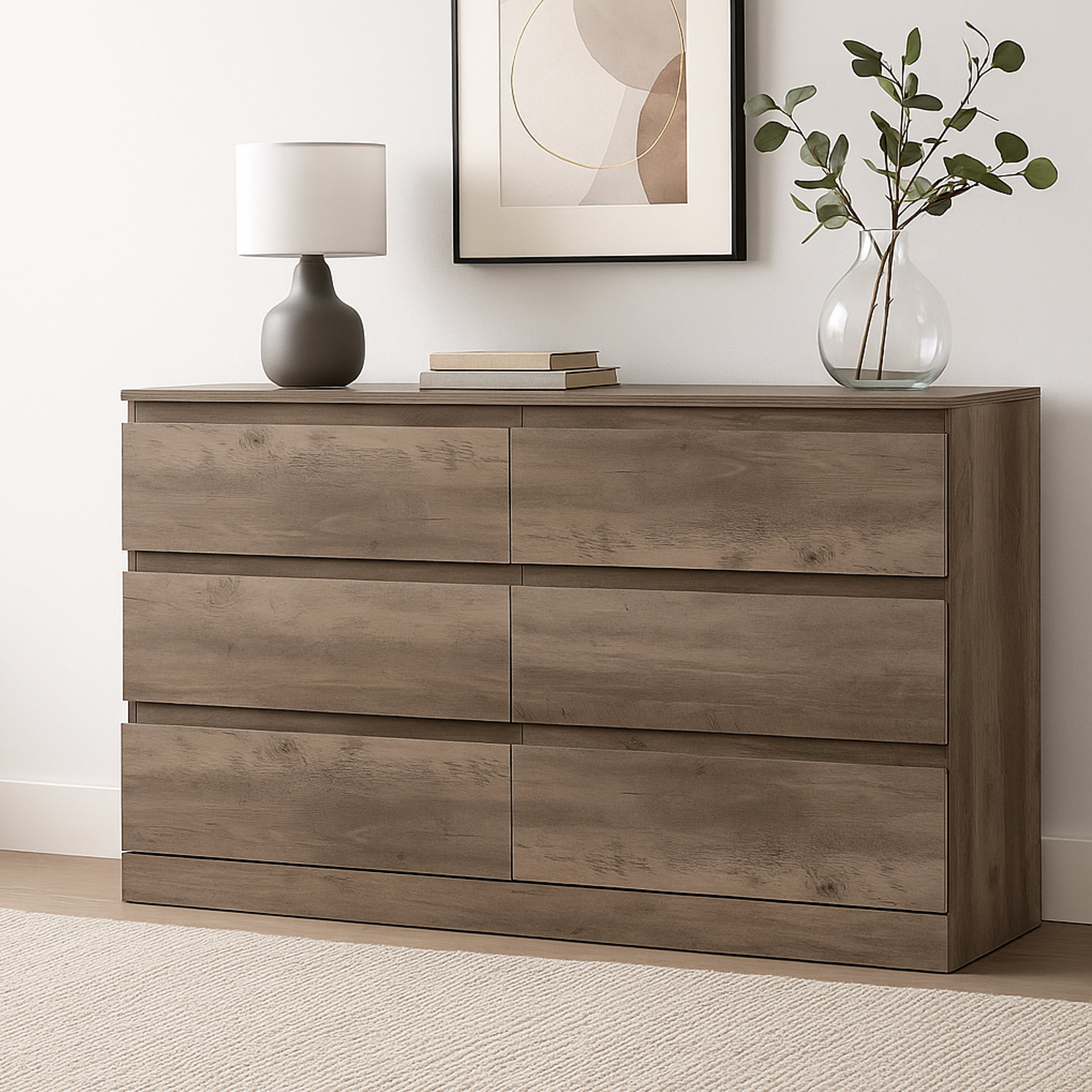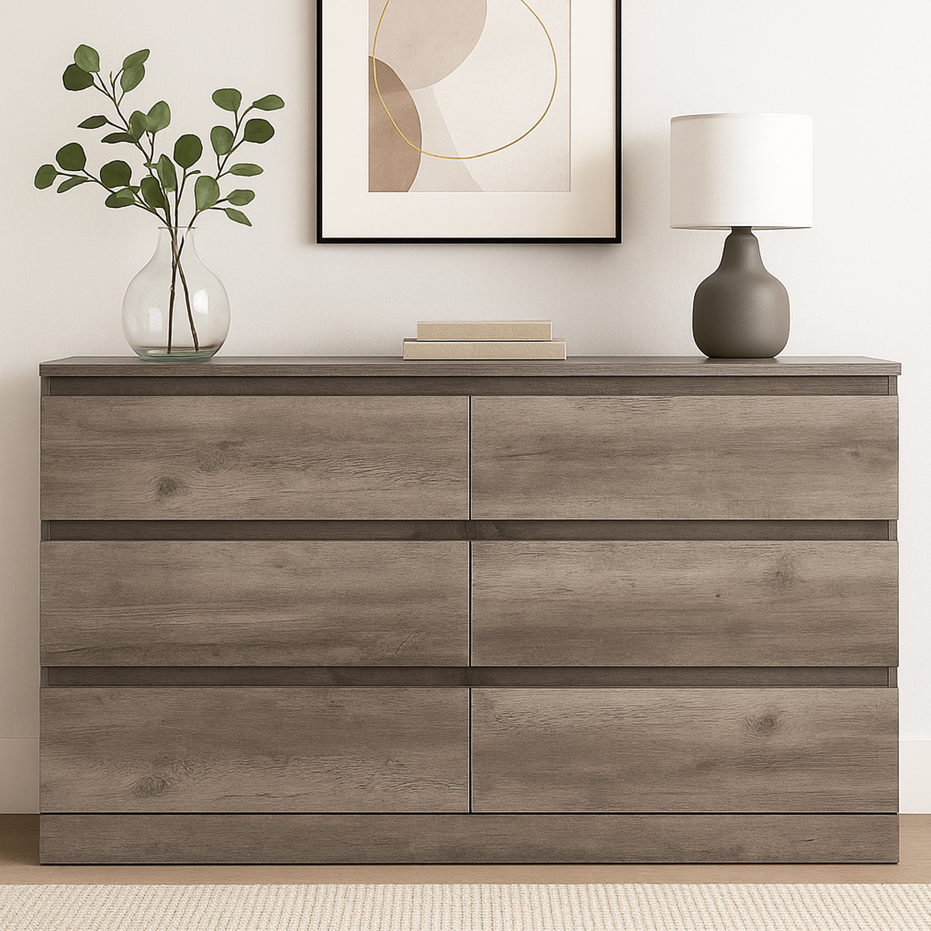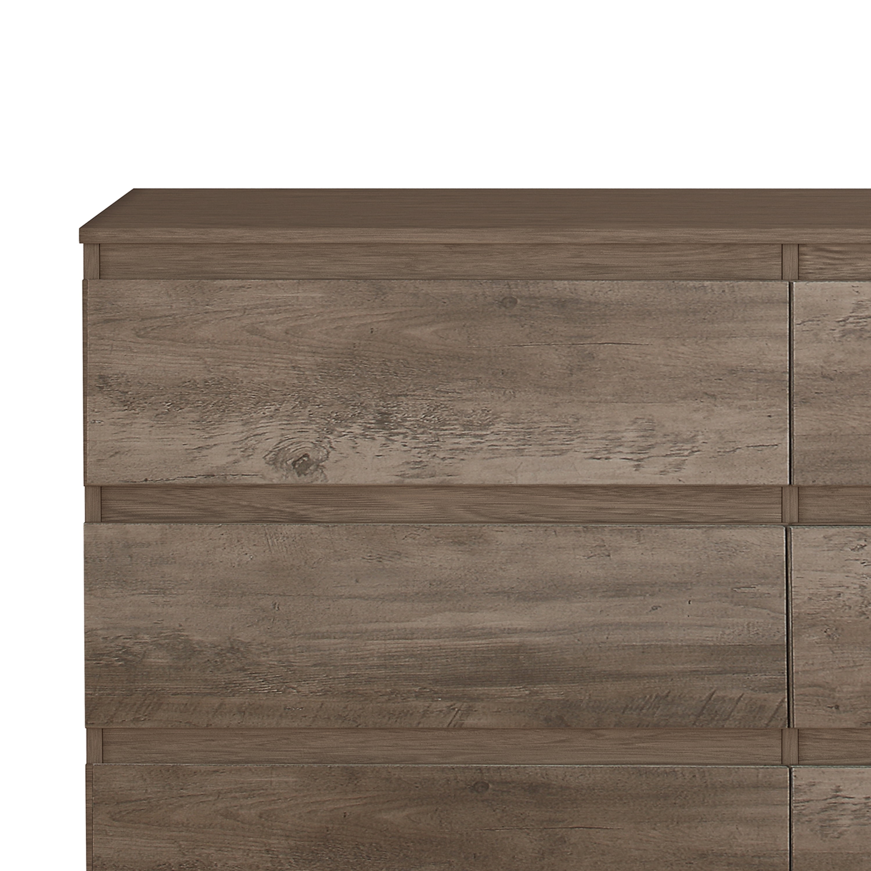 Gray Oak finish Made of composite wood and MDF This adult dresser includes 6 drawers Assembled dimensions: 30.5H x 51.25W x 15.5D Drawer dimensions: 4.25H x 22.5W x 12.5D Open shelf dimensions: 8.5H x 14W x 11.25D Item will ship in one box Complies with current “Standard Safety Specification for Clothing Storage Units”; Includes anti-tip hardware for added safety Assembly required. Estimated assembly time is 2 hours.