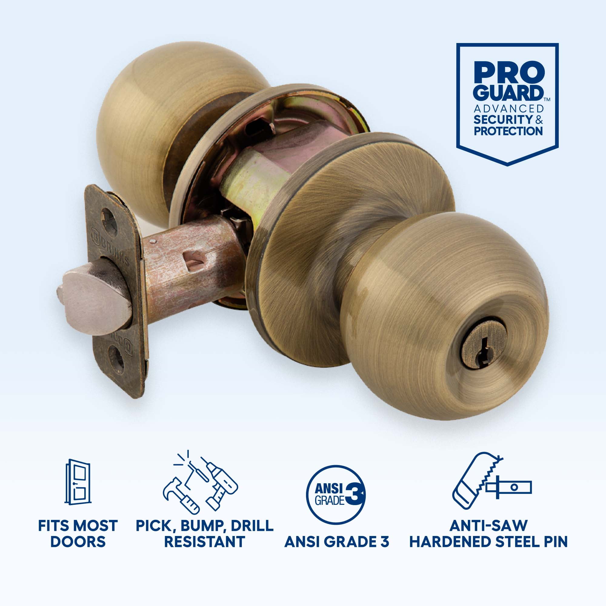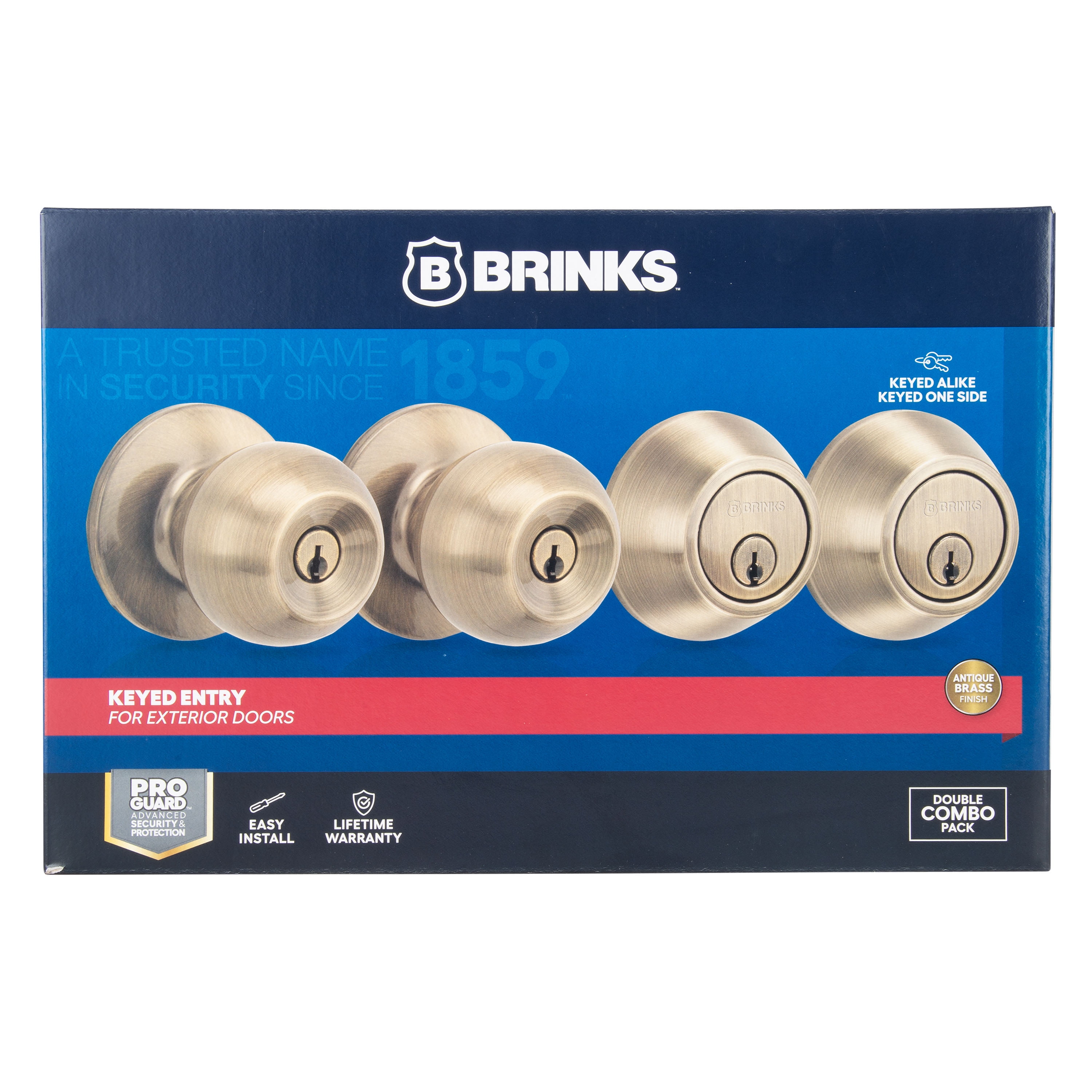 Brinks keyed entry ball doorknob and deadbolt are the perfect enhancement to your home. Rest assured with the peace of mind that Brinks door hardware is keeping your home safe and secured. ‘A Trusted Name in Security since 1859’ Designed for convenience and versatility, the lock fits exterior residential and light commercial doors with knob and deadbolt keyed alike. Door lock and deadbolt are both pick, bump, and drill resistant with an anti-pry shield. The knob and deadbolt combo pack are ideal for doors that need to be locked and unlocked. Operate the locking mechanism from the interior by thumb turn and lock and unlock from the exterior by key. It features a single cylinder, one-inch deadbolt with anti-saw pins. This combo pack meets ANSI Grade 3 standards. The keyed entry function is best for the front, back, and side doors. As a global leader in security-related products and services, the Brink’s name is synonymous with top quality merchandise.