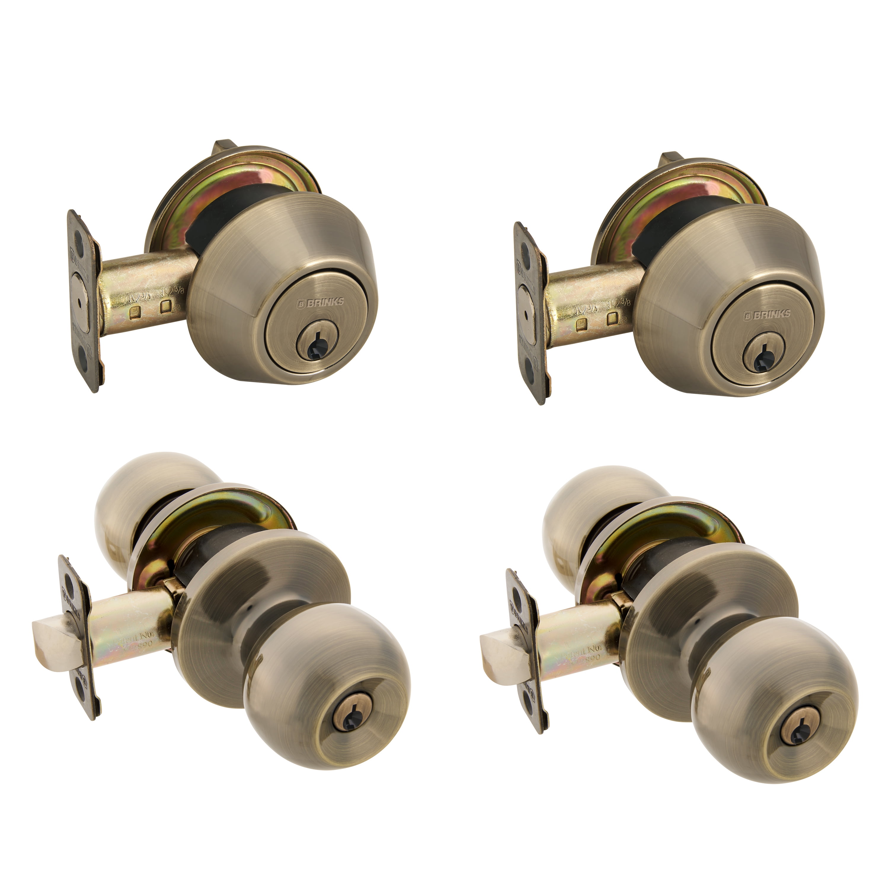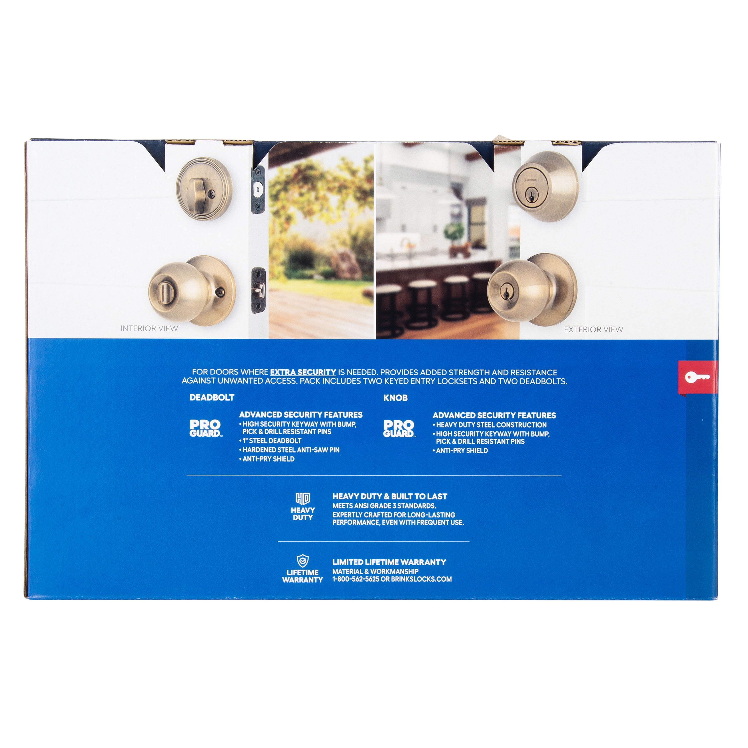 4-way adjustable latch fits 2-3/8″ or 2-3/4″ back-set Fits standard doors 1-3/8″ to 1-3/4″ thick Included (2) deadbolts, (2) doorknobs High security, pick, bump, and drill resistant with an anti-pry shield 1″ single cylinder deadbolt with steel anti-saw pin Meets ANSI grade 3 standards Easy to install new knob with only a Phillips screwdriver Brinks lifetime warranty