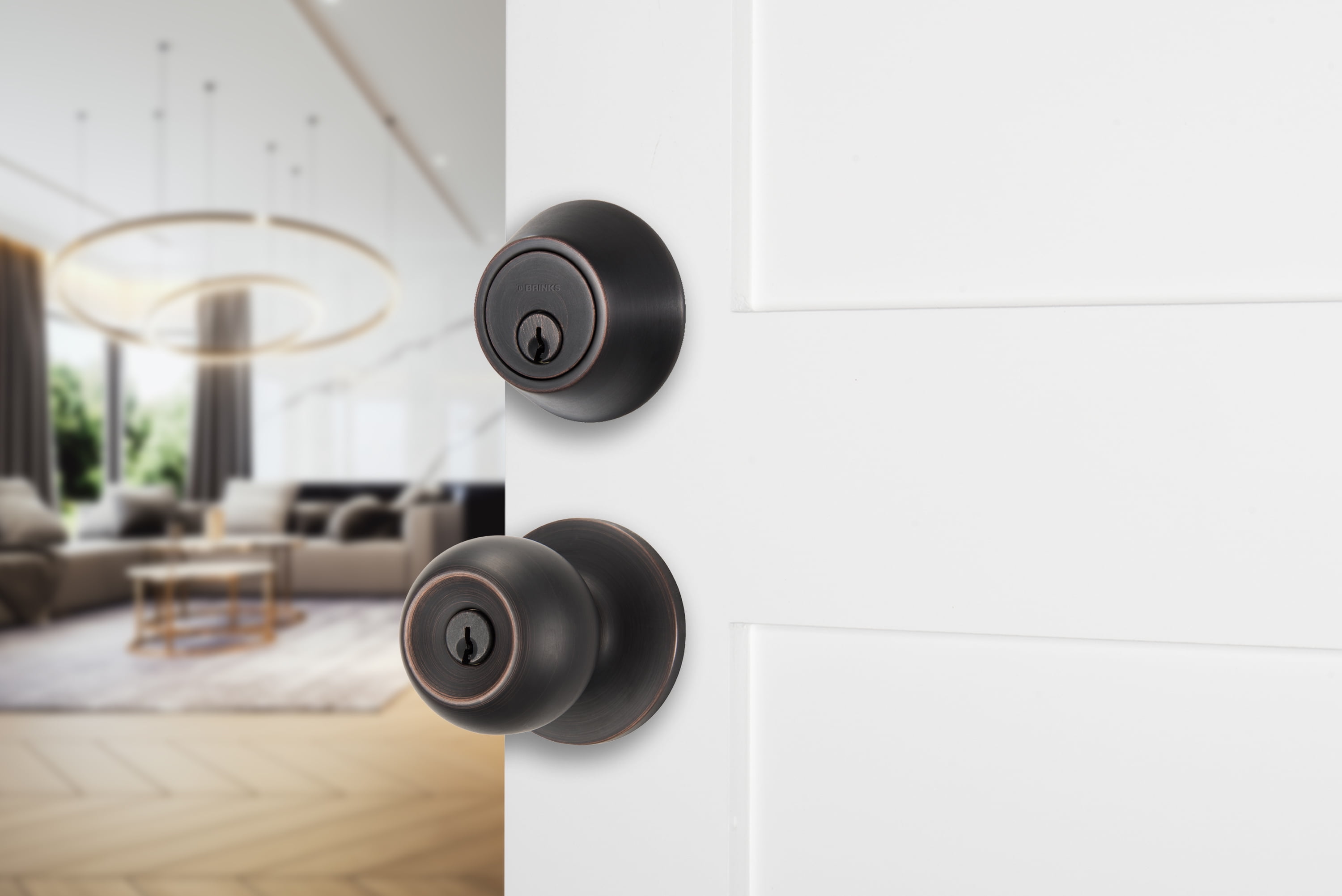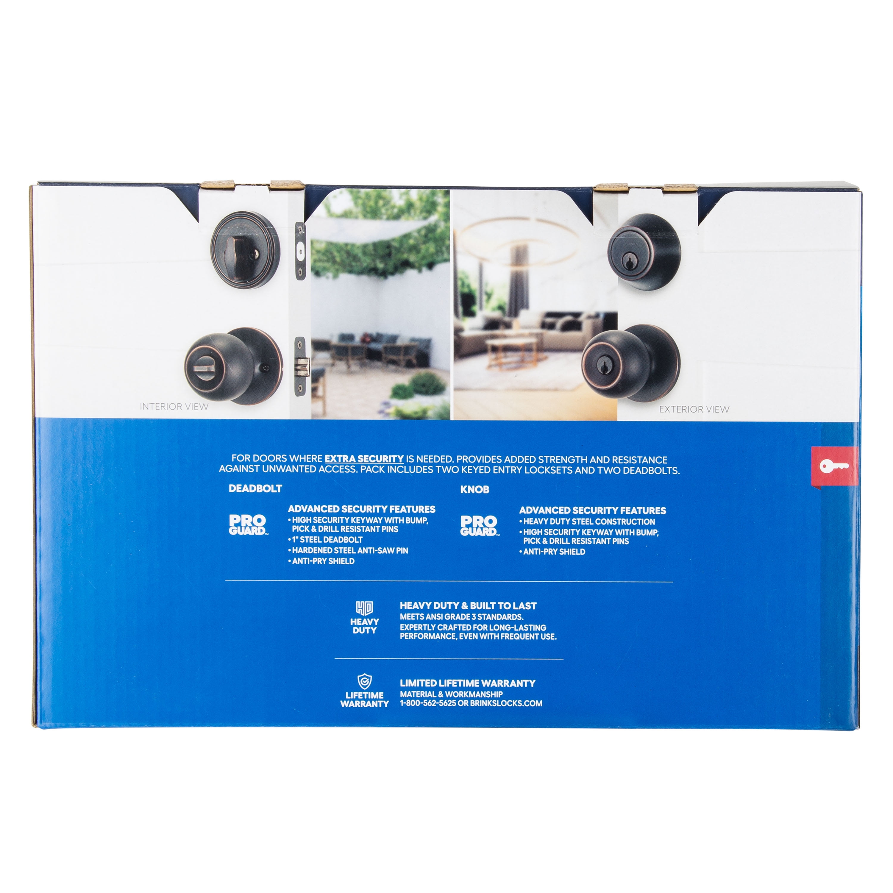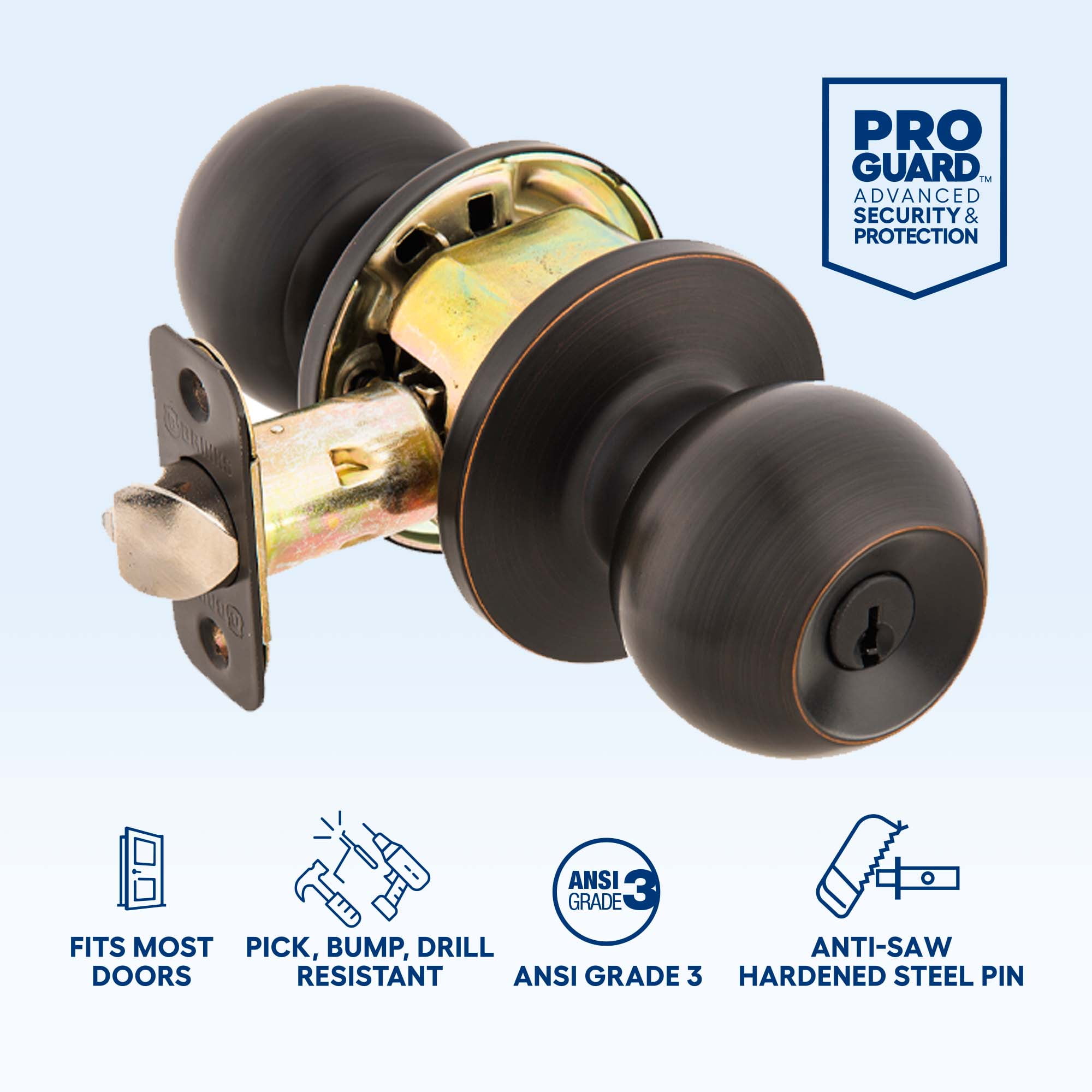 Brink’s Keyed Entry Ball Knob and Deadbolt features Pro-Guard for advanced security and protection. Both the knob and deadbolt have a pick, bump, and drill-resistant keyway and an anti-pry shield to help prevent brute force tampering. The single-cylinder deadbolt features an anti-drill plate, and the one-inch deadbolt latch has a hardened steel anti-saw pin. Additionally, this combo pack meets ANSI Grade 3 standards. Designed for convenience and versatility, this combo is keyed alike and fits most standard doors measuring 1-3/8” to 1-3/4” thick and has an adjustable latch that fits 2-3/8” or 2-3/4” backsets. The knob and deadbolt combo pack are ideal for doors that need to be locked and unlocked. Operate the locking mechanism from the interior by thumb turn and lock and unlock from the exterior with the key.