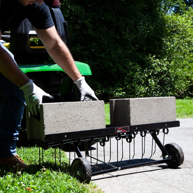 - Long-Lasting Construction: All steel design with heavy-duty tray holds up to 70 lbs. of additional weight. Tines are made of spring steel; in the unlikely event of a breakage, a safety rod is included to prevent contact with mower blades
