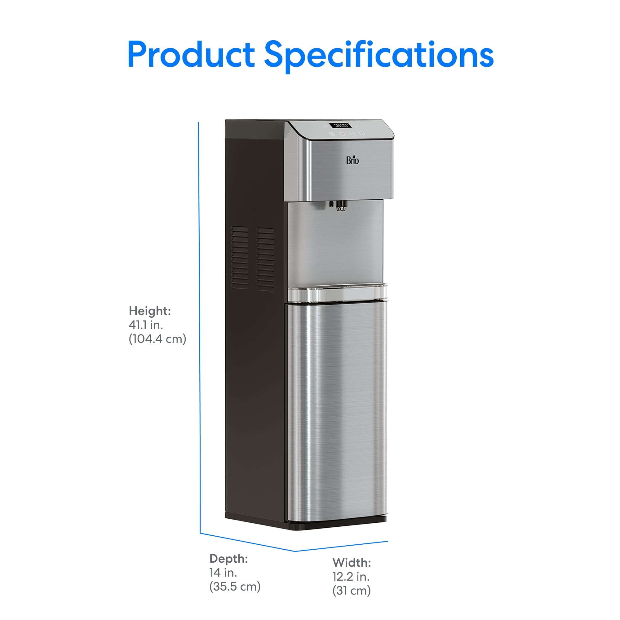 Brio 4-Stage Reverse Osmosis Bottle-Less Water Cooler Hot & Cold, 40.5″ Bottleless design: Connects directly to a water line for unlimited access to purified water Dualtemperature dispensing: Easily select between cold and hot water for your beverage needs Advanced filtration system: Utilizes reverse osmosis to effectively remove contaminants, unpleasant tastes, odors, and colors Replacement filters available: For replacement filters, search for √¢¬Ä¬úMIB400PKUF” 4Stage Filter Replacement Kit The illuminated display panel enhances usability, offering controls for water temperature, a clock, a nightlight, and a child lock for added safety