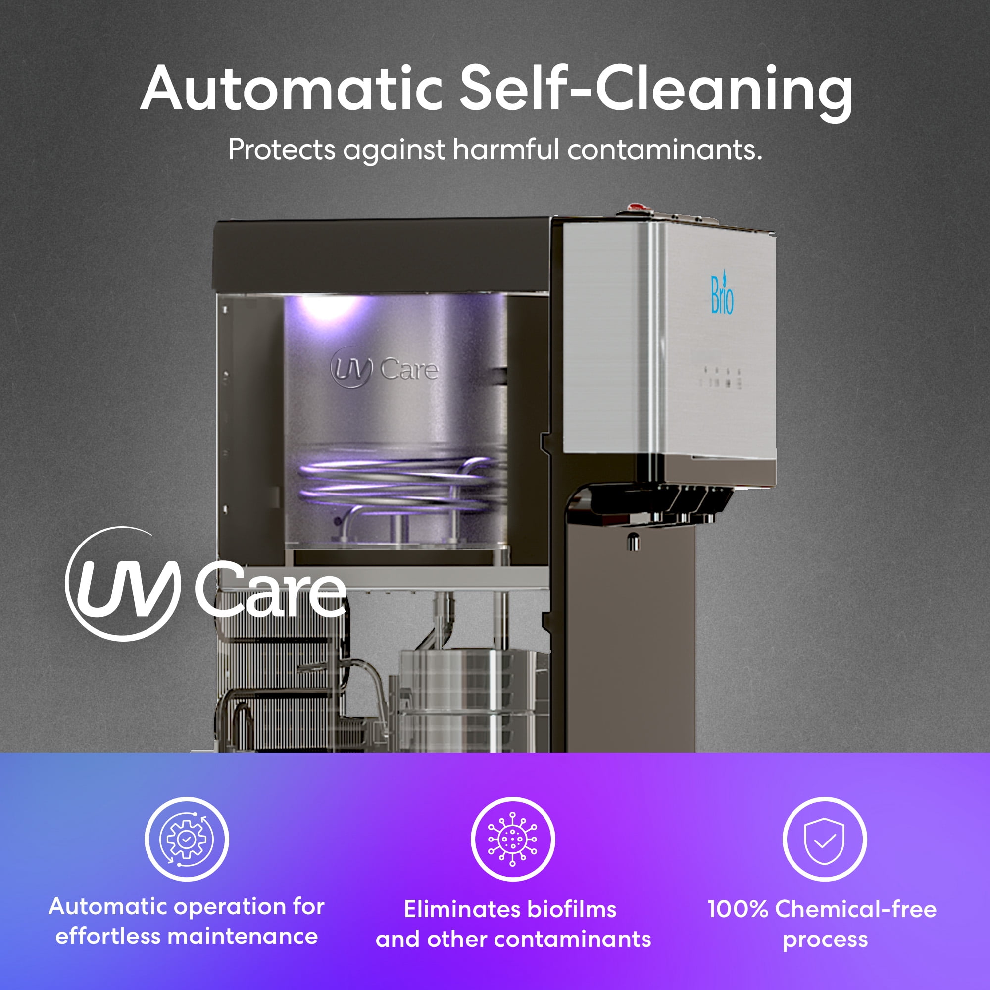 For our consumer’s convenience, this Brio 500 series cooler is compatible with 3-5-gallon capacity water bottles, net content 1 Self-cleaning ozone at the touch of a button, harmlessly sanitize the dispenser by eliminating bacteria in the water tanks and lines, it also offers a blinking light indicator and night light Tri-temperature: This cooler features tri-temperature push button faucets that makes it easy to dispense cold water as low as 39 degrees, hot water up to 198 degrees and room-temperature water Empty bottle indicator lets you know when it’s time for a new bottle of water It features 100 percent stainless steel cold and hot reservoirs protect water purity, cooler longevity, and taste of water UL/listed and energy star approved, Product net content quantity 1 unit