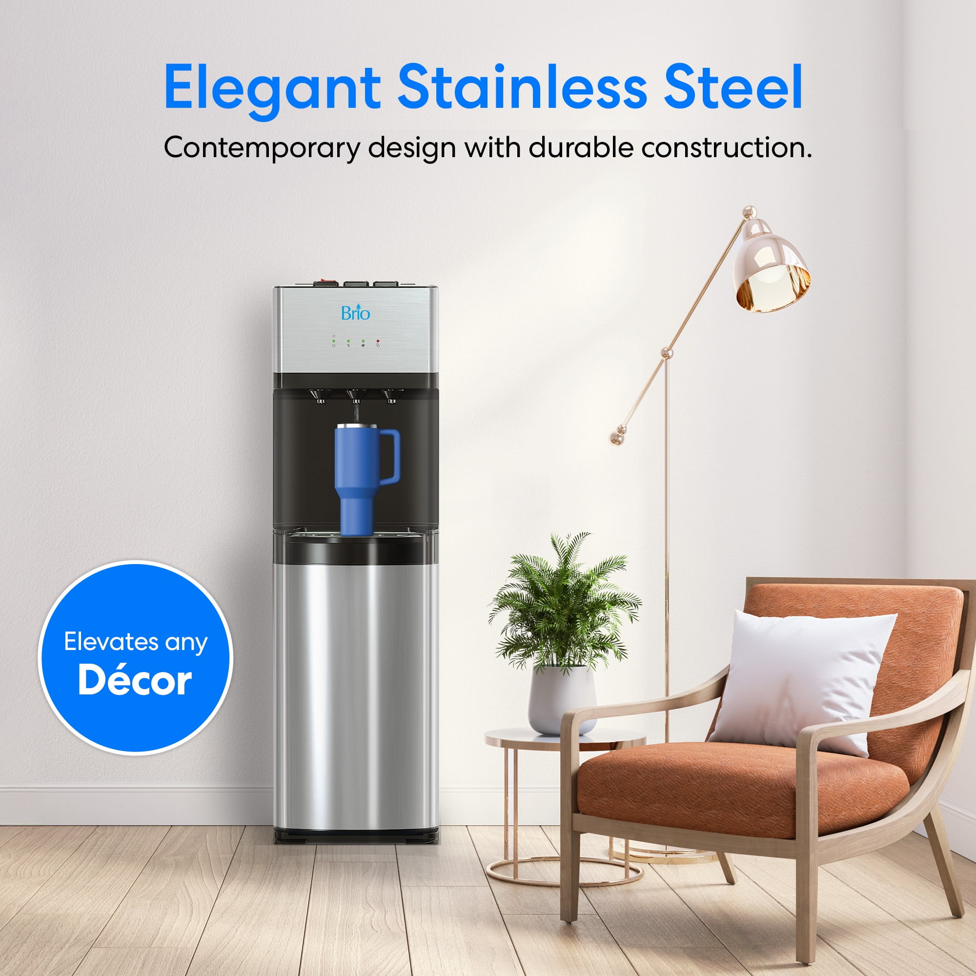 This popular Brio 500 bottom loading 5 gallon capacity series bottom-load water cooler dispenser offers virtually everything consumers may want in a water cooler. This unit features a smooth, stainless-steel design that brings contemporary style to any size home, office, or breaks room. This cooler is also equipped with tri-temp faucets, so consumers are gifted the luxury of enjoying soothing hot water up to 198 degrees Fahrenheit, invigorating cool water as cold as 39 degrees Fahrenheit or room-temperature water instantly. Built to last a lifetime, this unit is compatible with 3-5-gallon capacity water bottles. Maintenance of the CLBL520SC is also a breeze with its self-cleaning feature with blinking light indicator. Product net content 1 unit.