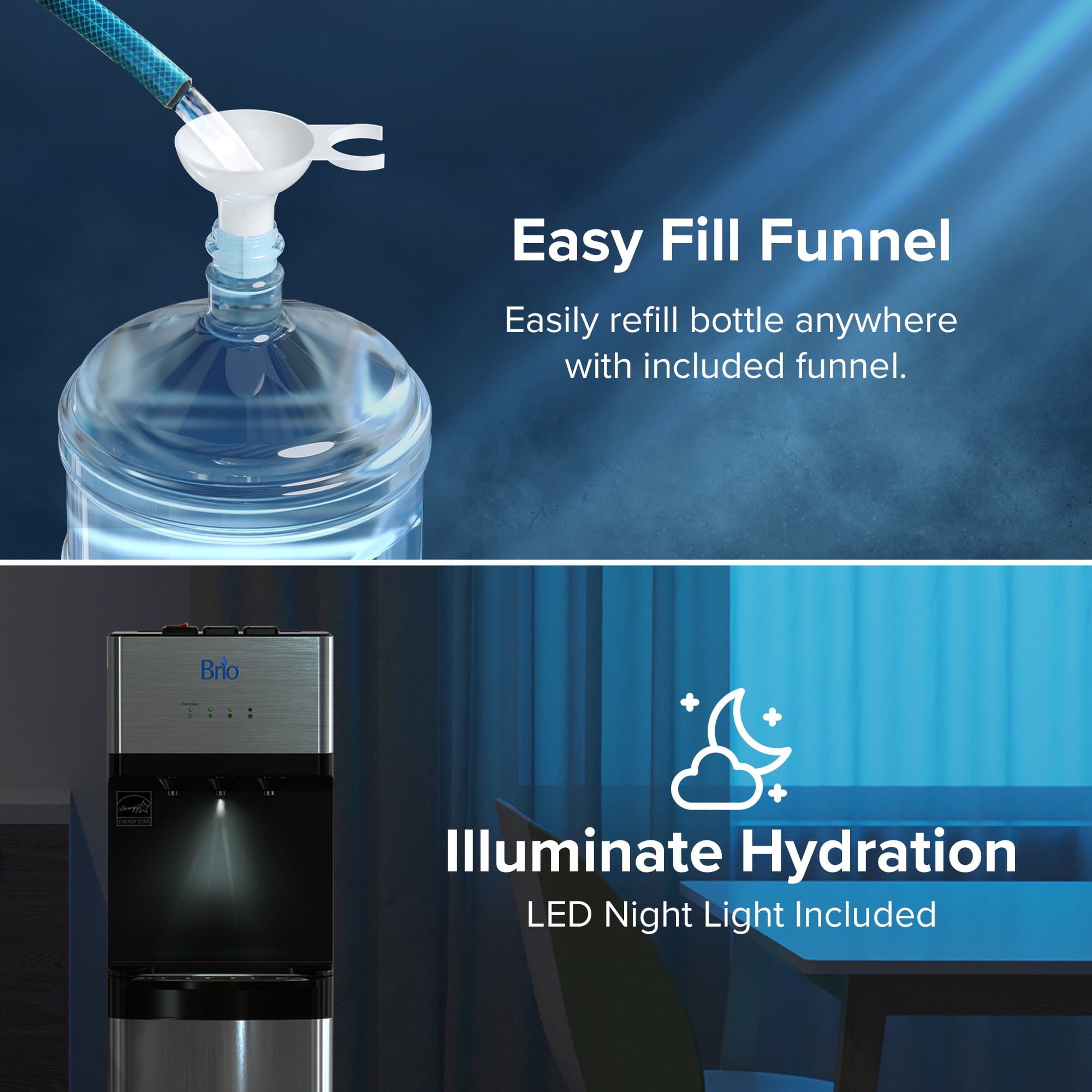 No lines. No plumbing. No hassle. The Brio 520 series self-cleaning bottom loading 2 stage filtration capacity no-line tri-temperature water up to 176-198 degrees hot and cold water ranging from 37-59 degrees fahrenheit water cooler dispenser offers all the convenience of a filtered cooler without the need for a plumbing hook-up. The bottom-load design accommodates long-lasting 5-gallon jugs, and when refill time comes, just slide the replenished bottle into the cabinet. You and your family can enjoy filtered hot, cold, or room temperature water with the dual-filtration process delivering consistently pure water by removing sediments, chlorine taste, and harmful contaminants before they reach glasses and water bottles. The hot water button has a child safety switch that prevents accidental dispensing. Bright LED icons indicate when your water is at the right temperature, and when filters need to be replaced and your bottle needs to be refilled. The cleaning process is a breeze—with the press of a button, the self-cleaning ozone feature thoroughly sanitizes the entire dispenser. A twenty-first-century essential, the Brio 520 water dispenser comes in a sleek and durable black stainless steel design that will complement any home’s interior.