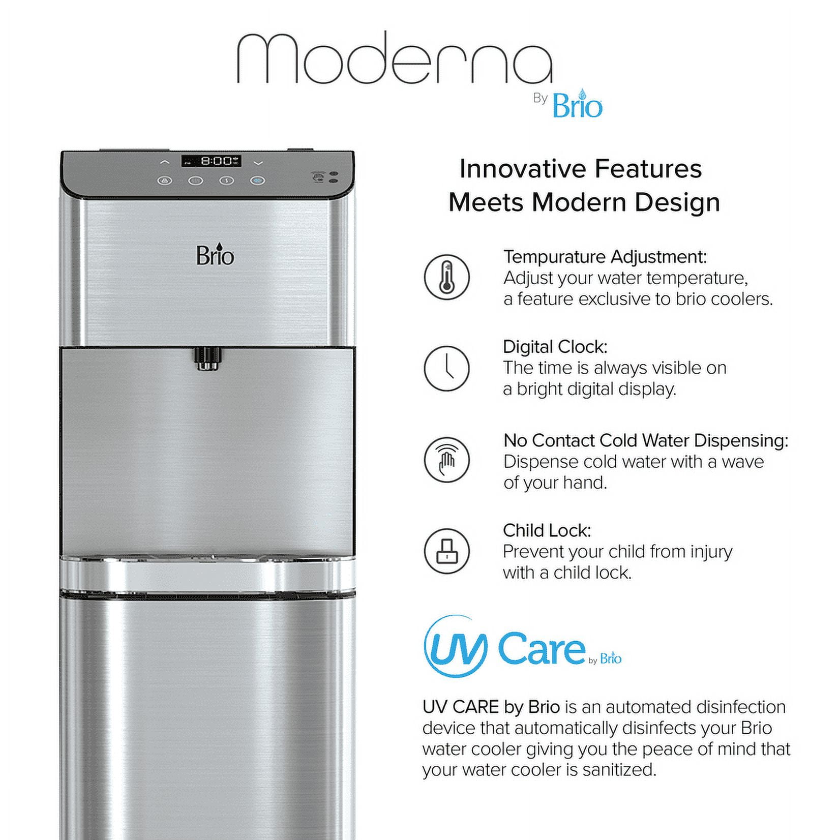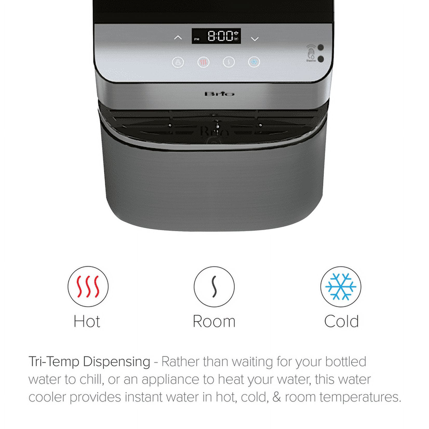 Revitalize with clean water from the Brio Moderna 700 series 3 stage capacity touch-less water cooler dispenser. Refueling with fresh, clarified water has never been easier; simply wave your hand in front of the digital control panel to activate the single-sensor technology to dispense crisp water. Enjoy refreshing cool water as low as 39 degrees, soothing hot water up to 194 degrees and room temperature water at any time. Dispensing water has never been more convenient and sanitary. Three powerful filters eradicate harmful contaminants most commonly found in tap water to bring you clean drinking water. The illuminated display panel allows you to control water temperature, a clock, nightlight, and child lock to ensure everyone’s safety while utilizing the Brio Moderna. Trust in a water system that leads in innovation and health.