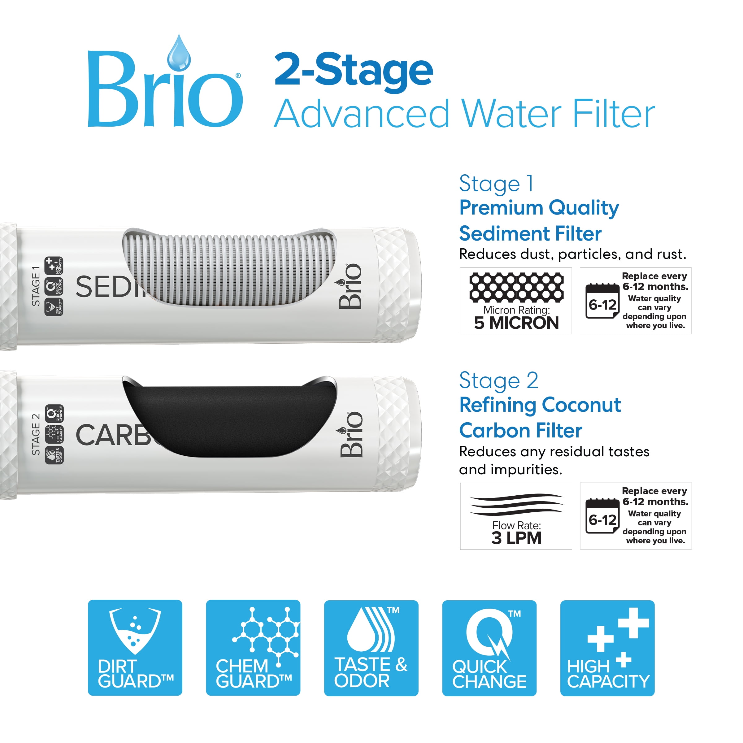 NO-CONTACT DISPENSING: Unlike a typical paddle water cooler, the Brio bottleless water cooler features innovatively designed dispense paddles that minimize contact, significantly reducing the chance of container cross-contamination for peace-of-mind dispensing REPLACEMENT FILTERS: For replacement filters search for “MIB200PKF” 2-Stage Filter Replacement Kit WHAT’S INCLUDED: Point-of-use water dispenser, sediment filter, carbon block filter, installation kit, user manual SELF-CLEANING UV: An automatic process uses ultraviolet light to reduce biofilm buildup and other accumulated impurities in dispenser’s water and reservoirs. Keeps water consistently delicious and minimizes cooler maintenance HOT & COLD W/ 3-STAGE FILTRATION: Enjoy piping hot and crisply cold water on-demand. Sediment, granular activated carbon, and carbon block filters are certified to NSF 42 and significantly reduce suspended solids, chlorine and chlorine byproducts, and other unpleasant tastes and odors, leaving water looking great and tasting delicious. Includes child safety lock on hot water so the whole family stays safe SLIM BOTTLELESS DESIGN: Less than 11 inches wide, this point-of-use water dispenser easily fits in small kitchens and spaces. With its sleek aesthetic that adds a modern touch to homes and offices, it conveniently connects directly to your home or office’s own cold water line with no need for a 5-gallon bottle, so an endless supply of clean, filtered water is always available CONVENIENT LED LIGHTS: Bright indicator lights alert you when water is heating and cooling, when the self-cleaning UV cycle is underway, and when filters are nearing end of life and need to be replaced, so your always on top of your water’s status