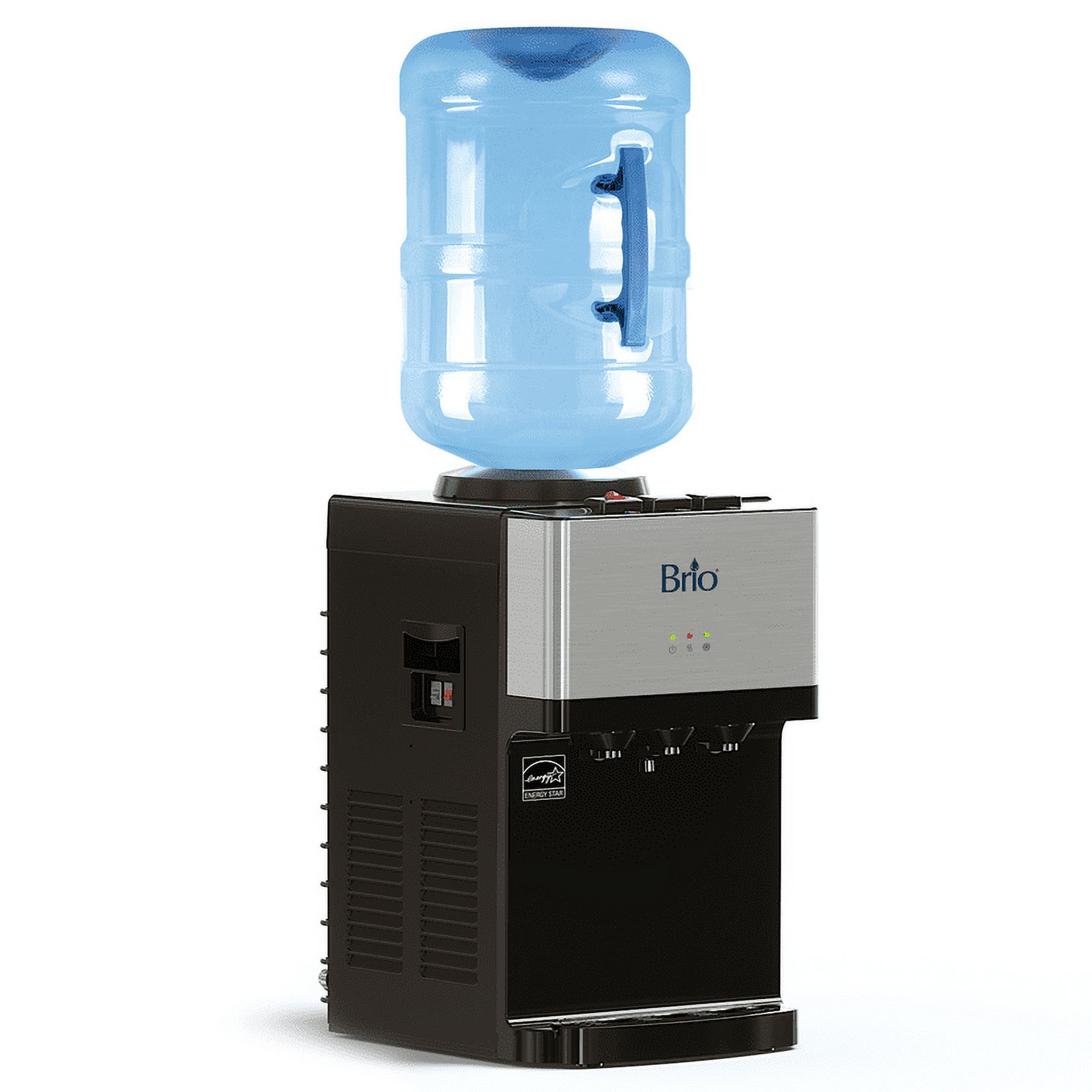 Brio 5 gallon capacity Tri-temp mode provides instant access to hot, cold, and room temperature water on demand Safety: Child safety lock features prevent accidental dispensing of hot water, so the entire family can use it worry-free Drip tray: removable drip tray can quickly be taken out to provide users with an easy way to clean Design: 100% stainless steel protects water purity in hot and cold reservoirs while maintaining cooler longevity