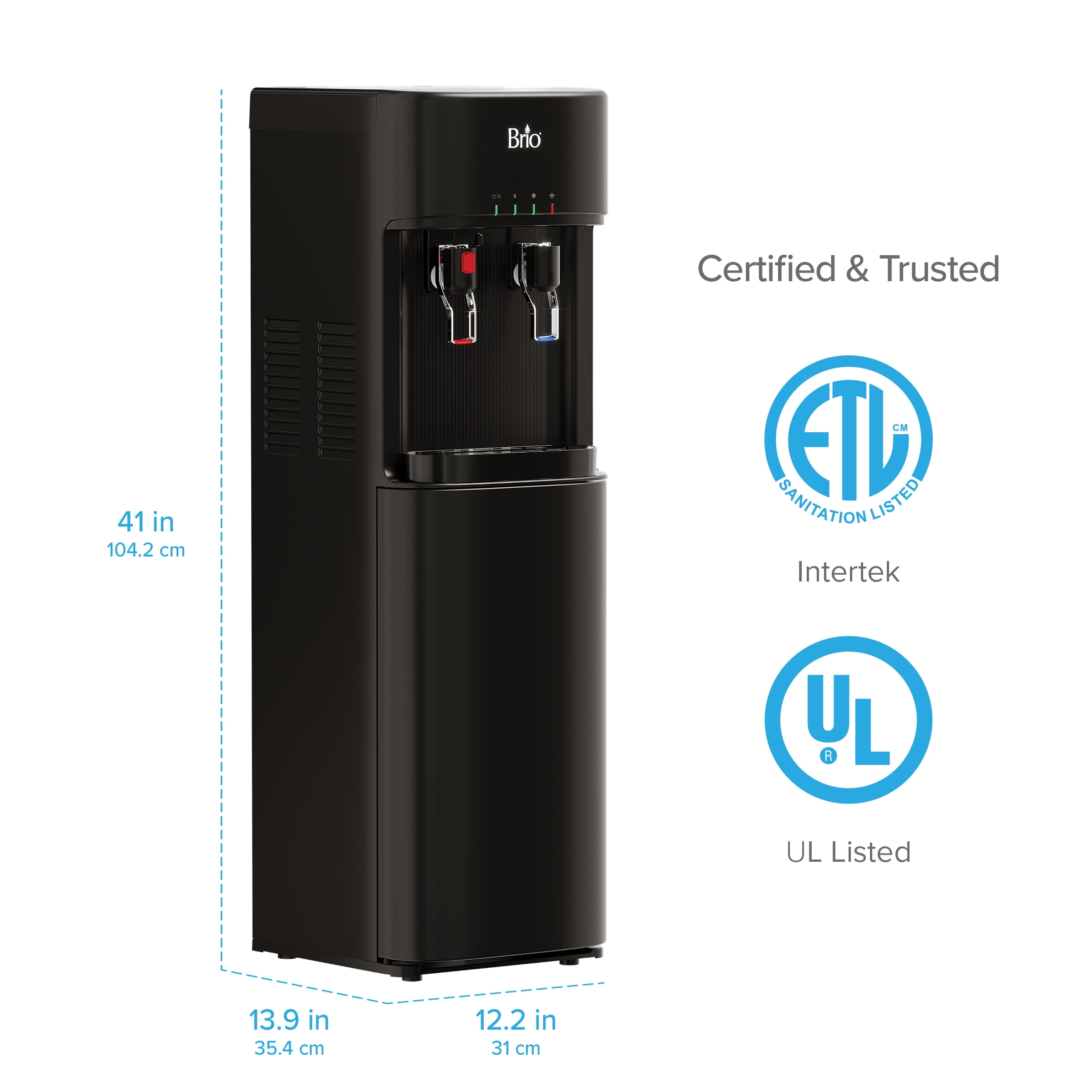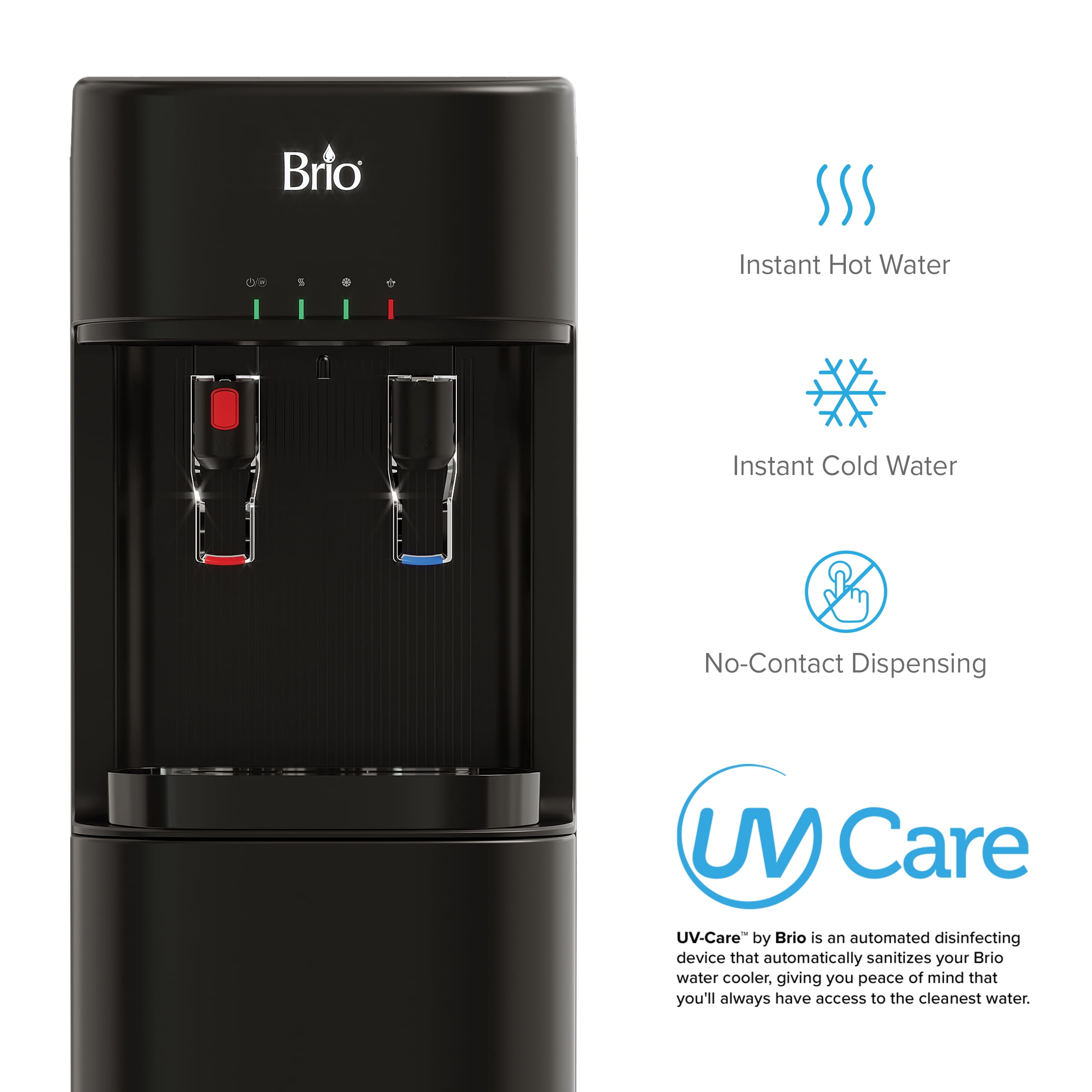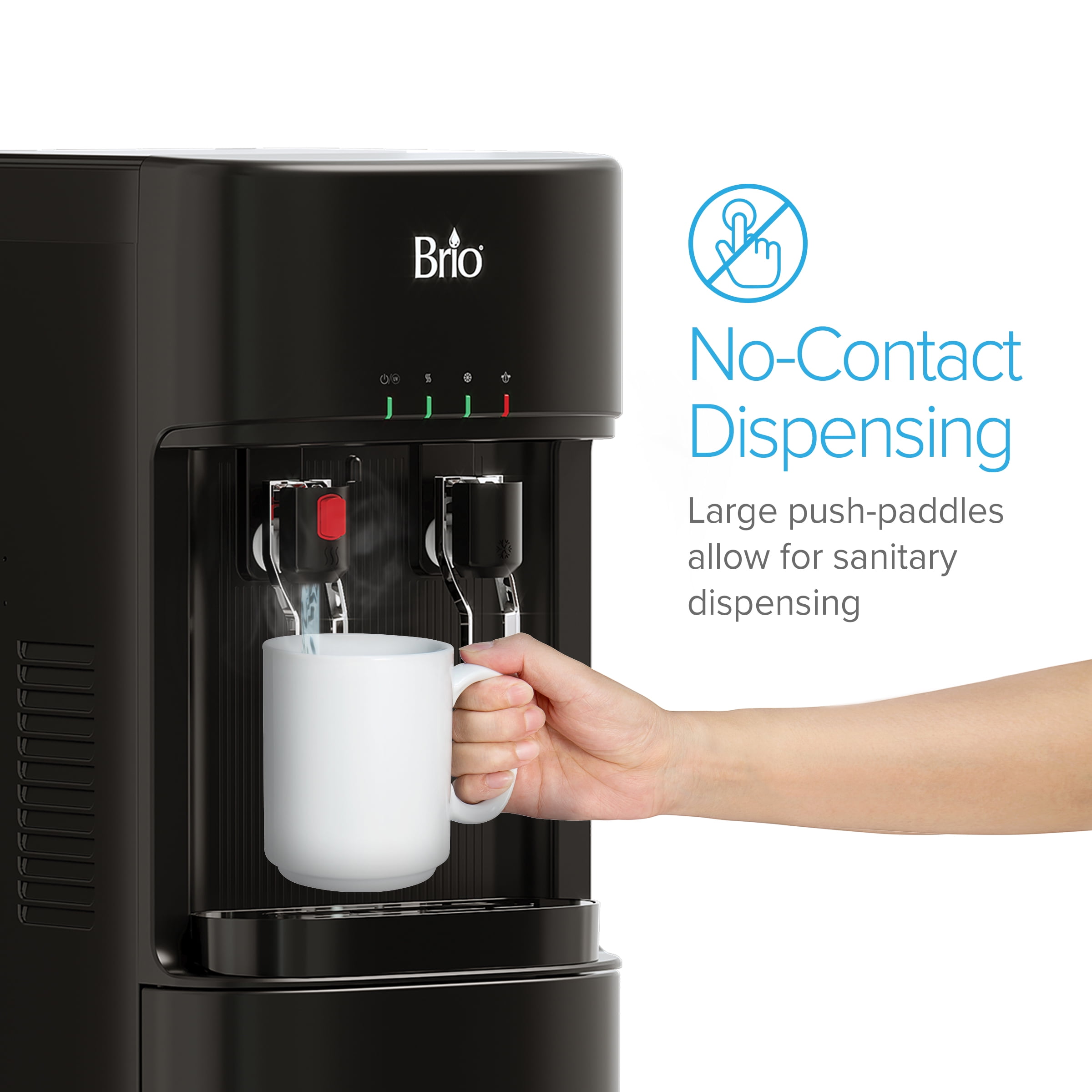 Brio Self-Cleaning Bottom Loading Water Cooler No-contact dispensing minimizes contact, reducing the chance of container cross-contamination Hot and cold water on-demand with 3-stage filtration: sediment, granular activated carbon, and carbon block filters Filters certified to NSF 42, significantly reducing suspended solids, chlorine, and unpleasant tastes and odors Child safety lock on hot water for added family safety Convenient LED lights indicate when water is heating, cooling, or when filters need replacement