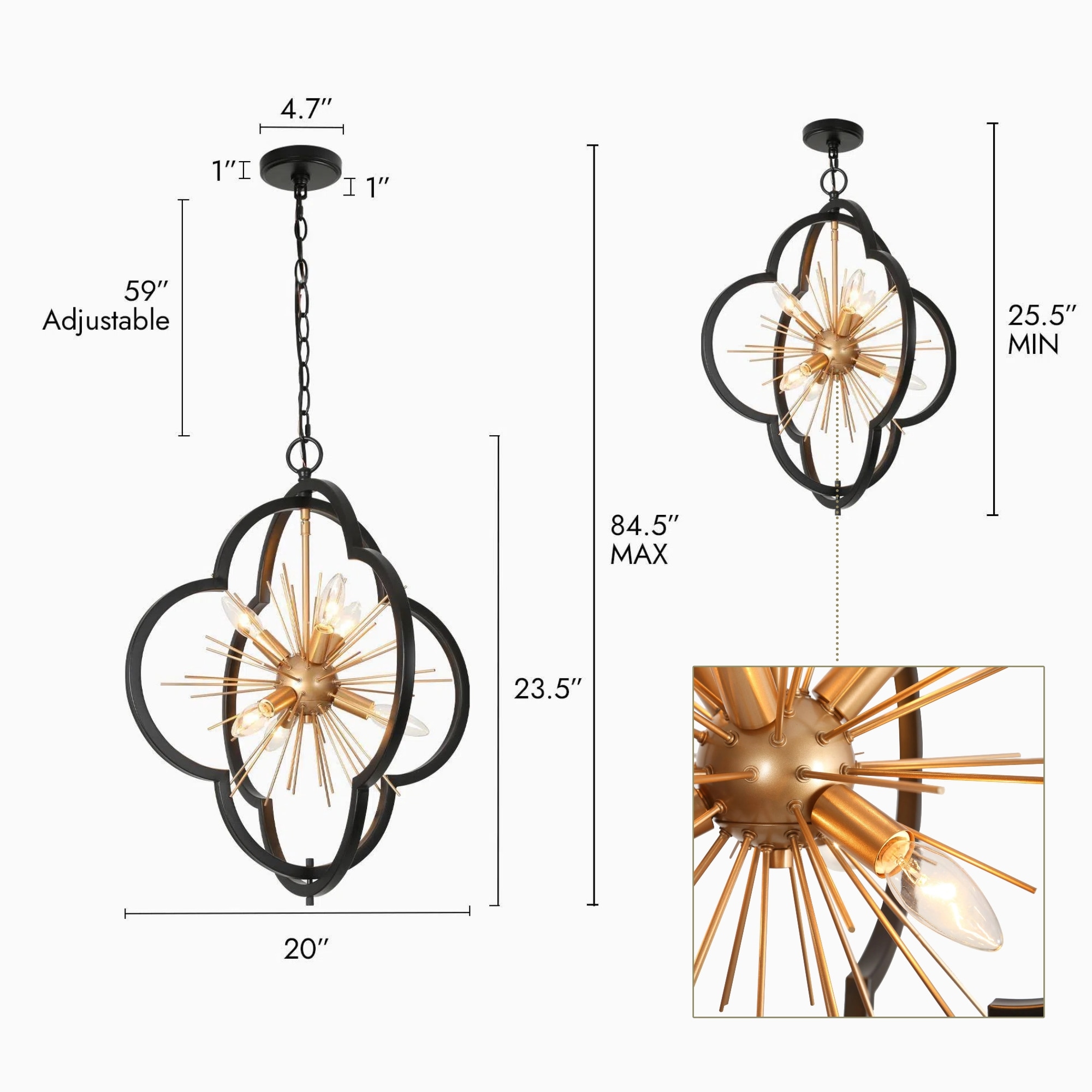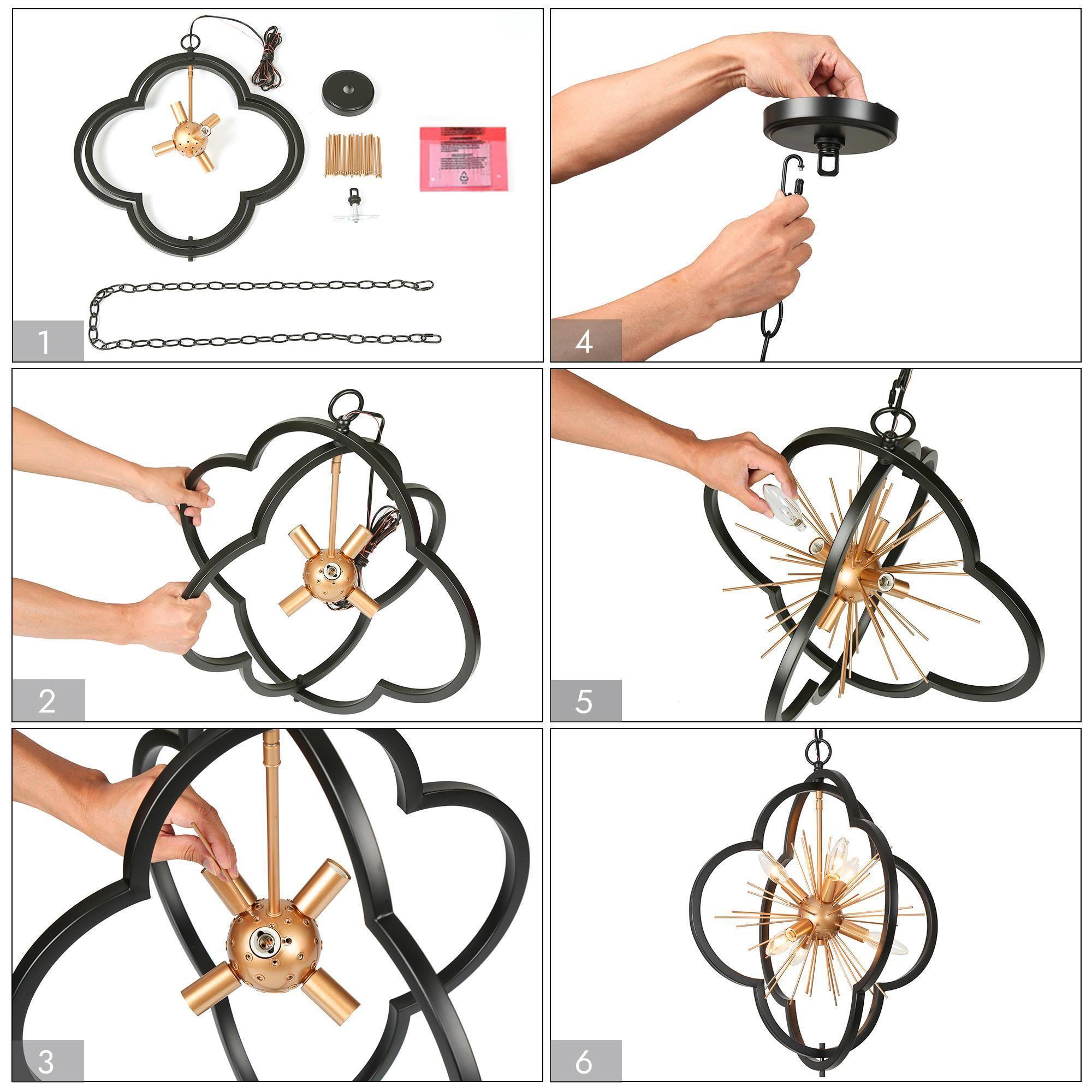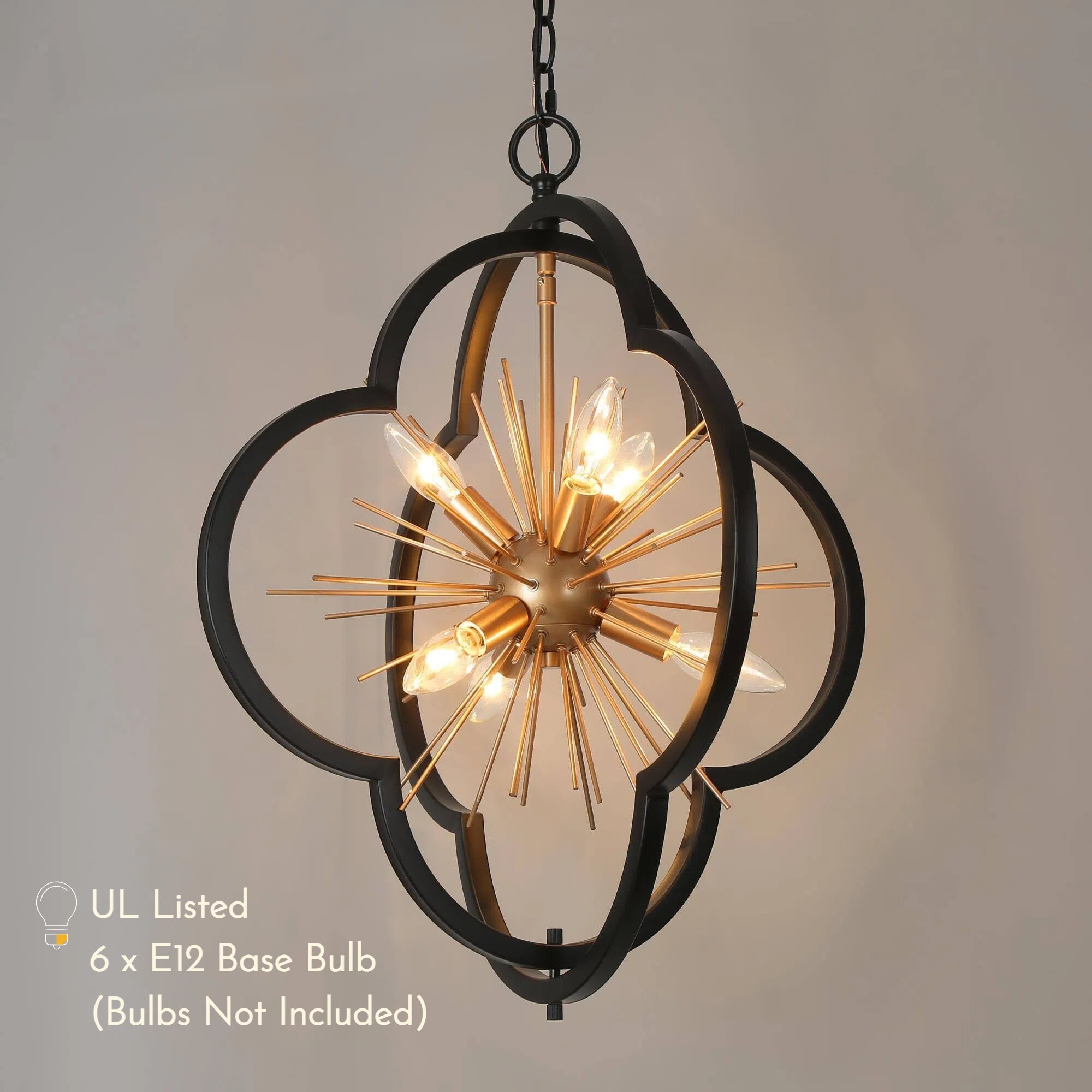 This chic 6-light chandelier dazzles with a flower-inspired, starburst design that captures the eye. A striking combination of matte black and gold finishes lends a modern yet sophisticated aesthetic, making it a versatile choice for various decor styles. It has a compact size at L20″ x W20″ x H23.5″ and boasts an adjustable height ranging from 25.5″ to 84.5″, making it suitable for both intimate settings and grandiose rooms with high ceilings. The dining room chandelier requires E12 Type B max 40W bulbs to shine at its best, the bulbs are not included, allowing for personal customization. The kitchen chandelier is UL listed, ensuring compliance with safety standards, and it’s compatible with dimmers and dimming bulbs for adjustable ambiance (not included). A 2-year warranty backs it, with free replacements for any damage or missing parts upon delivery. Easy to install, this pendant light fixture is a stylish statement piece that will elevate the elegance of any space.