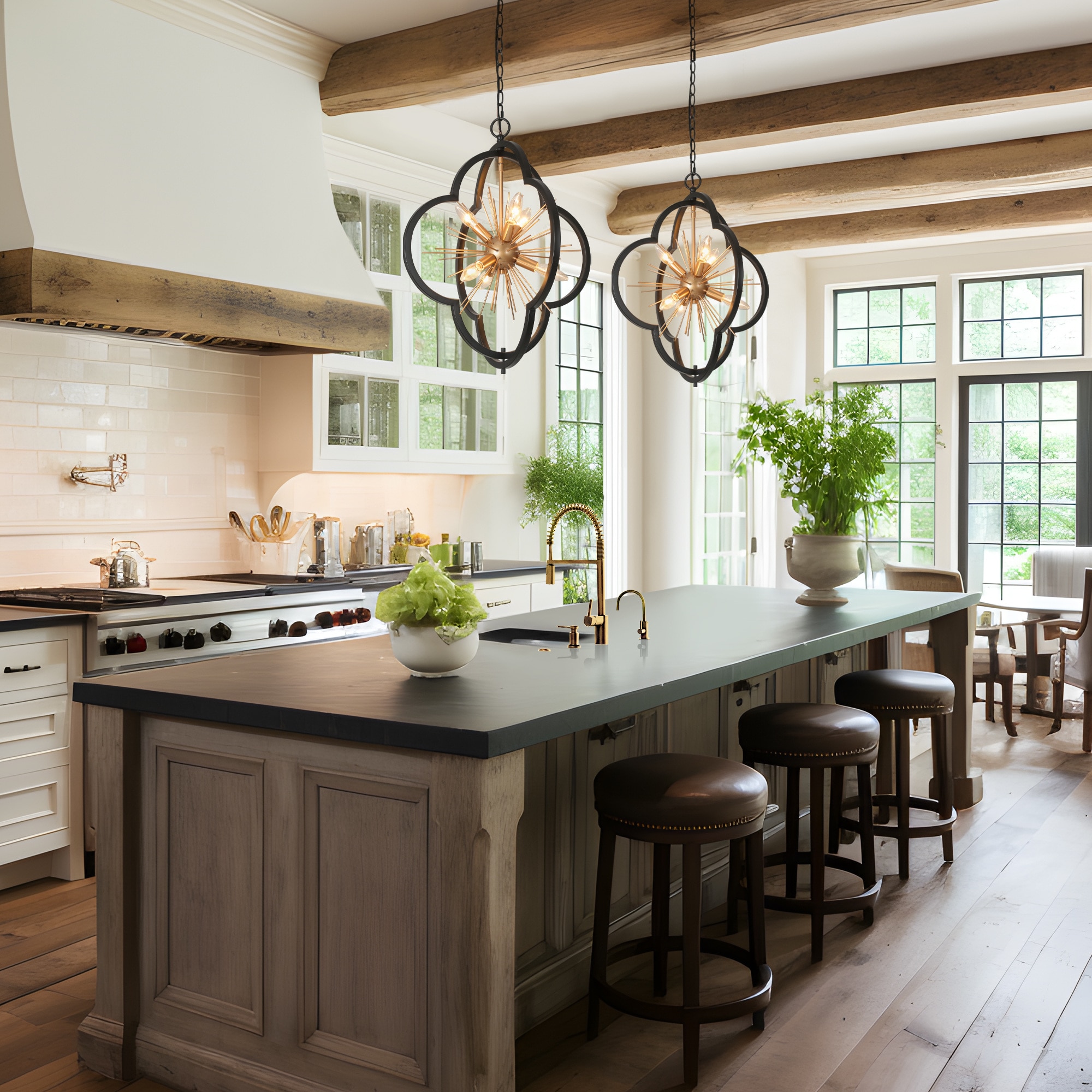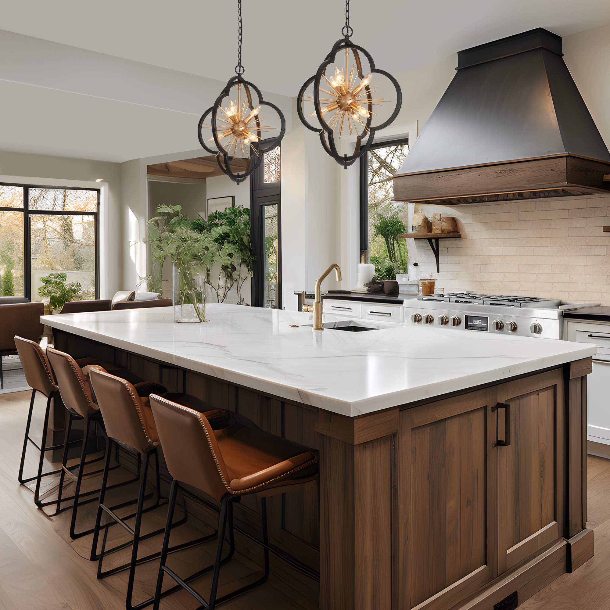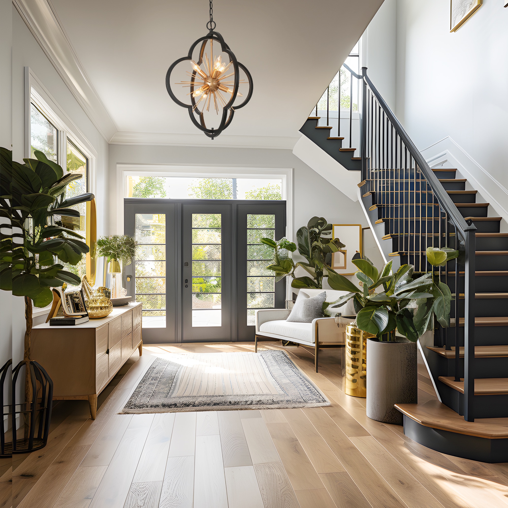 This chic 6-light chandelier dazzles with a flower-inspired, starburst design that captures the eye. A striking combination of matte black and gold finishes lends a modern yet sophisticated aesthetic, making it a versatile choice for various decor styles. It has a compact size at L20″ x W20″ x H23.5″ and boasts an adjustable height ranging from 25.5″ to 84.5″, making it suitable for both intimate settings and grandiose rooms with high ceilings. The dining room chandelier requires E12 Type B max 40W bulbs to shine at its best, the bulbs are not included, allowing for personal customization. The kitchen chandelier is UL listed, ensuring compliance with safety standards, and it’s compatible with dimmers and dimming bulbs for adjustable ambiance (not included). A 2-year warranty backs it, with free replacements for any damage or missing parts upon delivery. Easy to install, this pendant light fixture is a stylish statement piece that will elevate the elegance of any space.