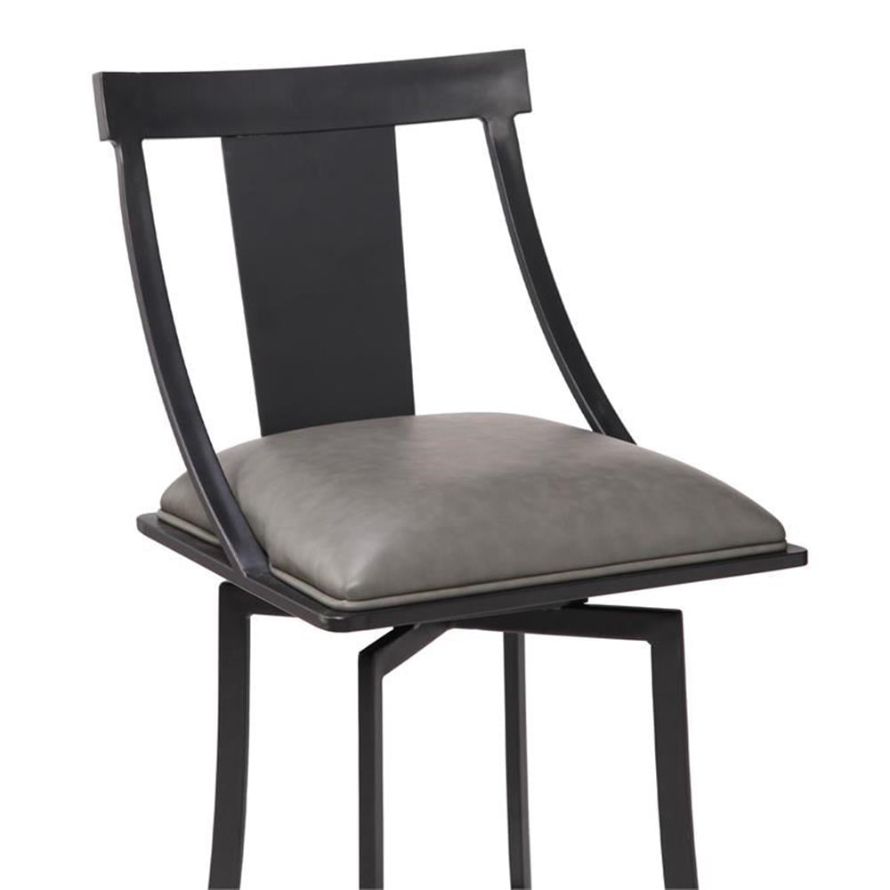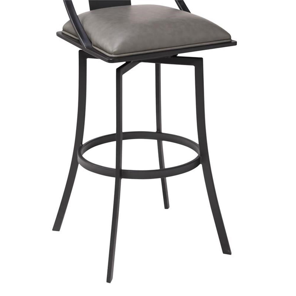 Materials: Faux leather, metal Finish: Matte black, vintage gray 360 degree swivel seat function allows for a wide range of user mobility Durable metal frame design assures quality construction without compromising on aesthetic appeal Tall back design and padded cushion provide excellent user support and are appealing to the eye NOTE: Fabric color and saturation may vary due to lighting and monitor/phone screen settings.