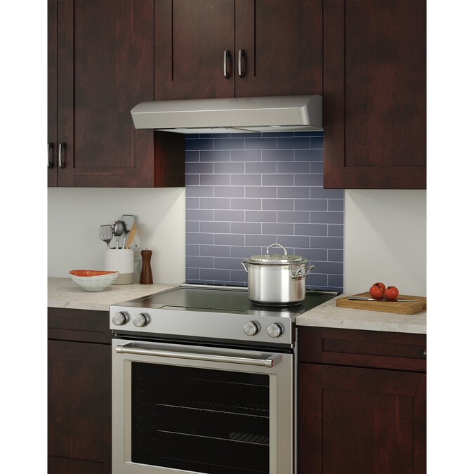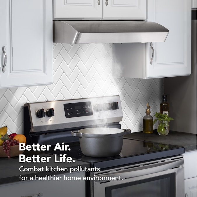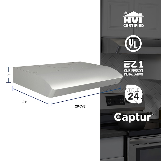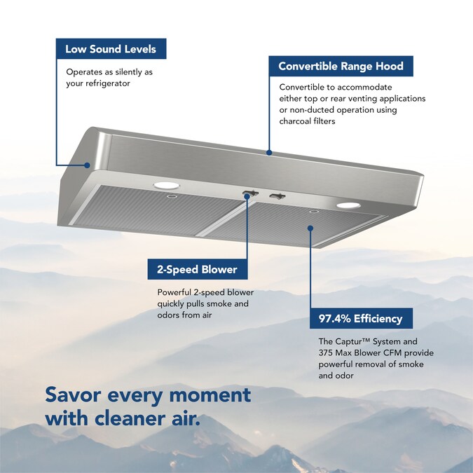 - Hidden louvers on top of hood exhaust away from cabinetry