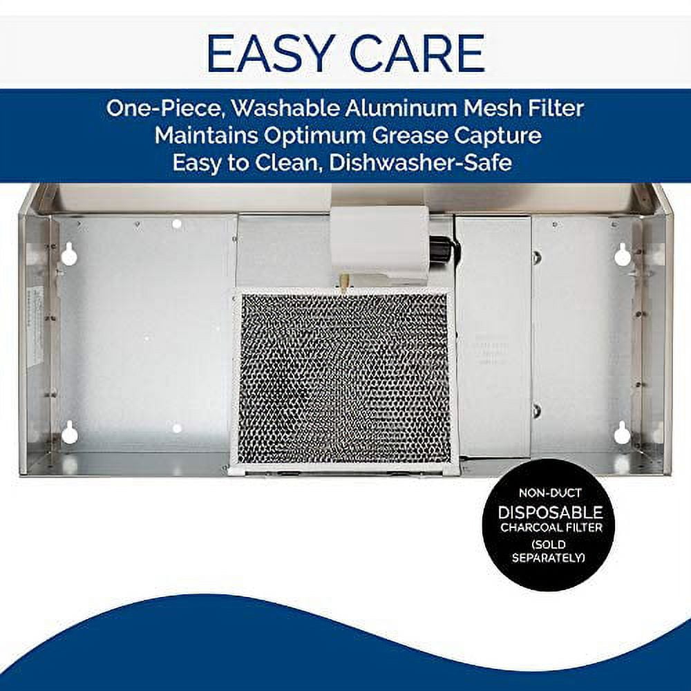 Easy to install, the Broan 30W in. Ventless Under Cabinet Range Hood is a non-ducted solution to improve your kitchen’s ventilation. It simply pulls the air in with its durable fan, traps unwanted pollutants in its combination grease-charcoal filter, and recirculates the air for a fresher, cleaner kitchen. A protective lamp lens is a bonus feature and, just like the fan, turns on with a simple flip of a switch. Available in a variety of colors, you’ll find that this hood not only improves air quality in your kitchen, but also enhances its décor.