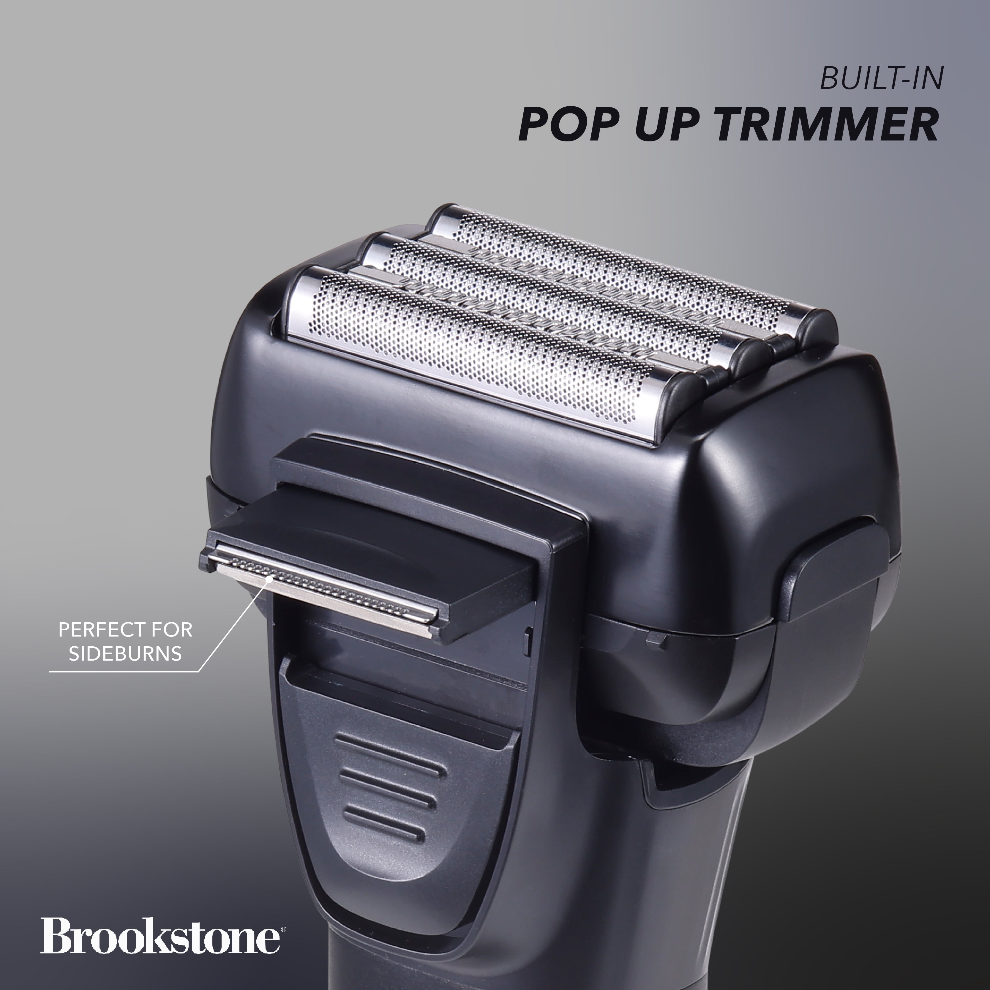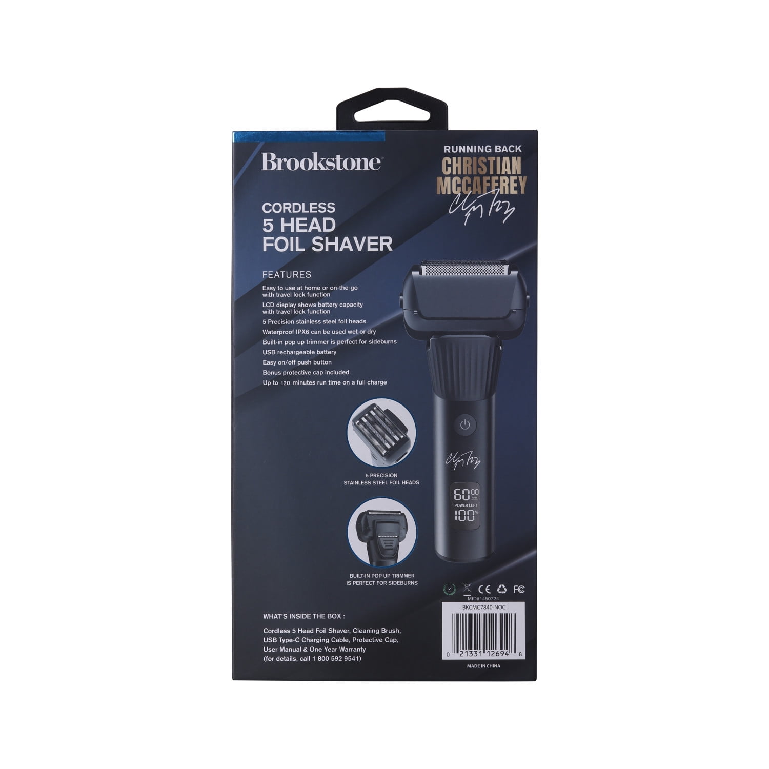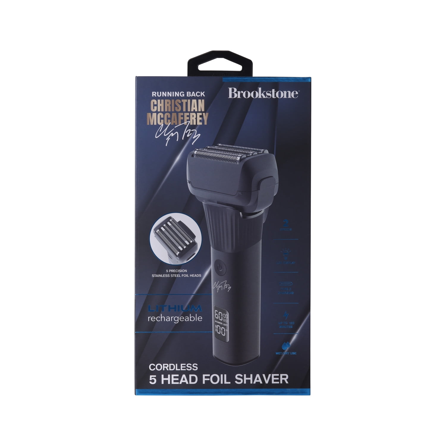 All-Pro Running Back Christian McCaffrey Special Edition with his signature Men’s Electric shaver is Cordless and rechargeable with an LED that shows battery capacity Brookstone 5 Precision stainless steel blades Built-in Pop up trimmer for sideburns IPX6 waterproof for wet or dry shaving Weight 0.62 lbs