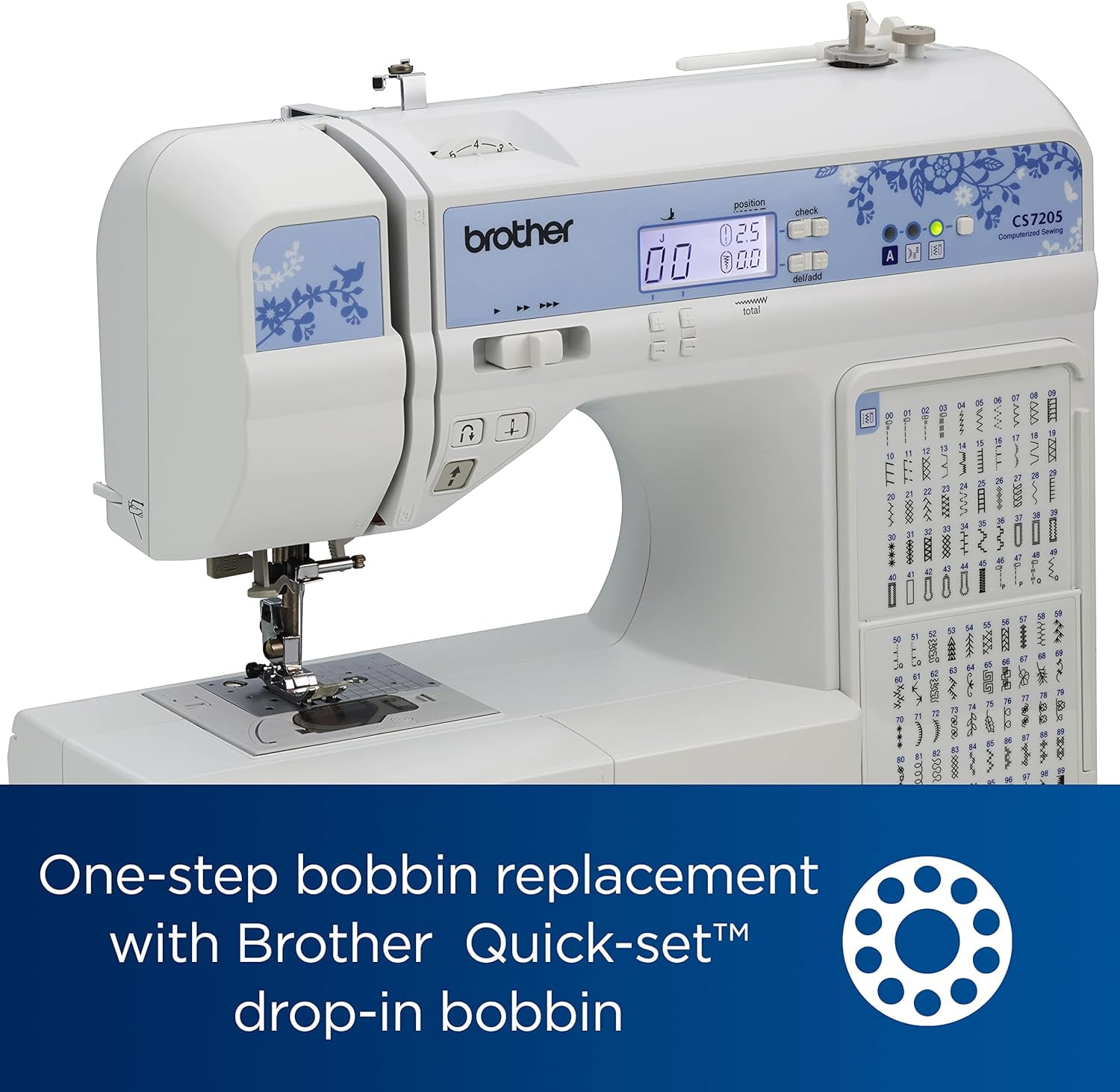 150 UNIQUE BUILT-IN STITCHES: The Brother CS7205 sewing and quilting machine includes 150 built-in stitches including utility, decorative, heirloom, 1 alphanumeric font, and 8 1-step auto-size buttonholes AUTOMATIC NEEDLE THREADER: This sewing and quilting machine includes an automatic needle threader that perfectly pushes thread through the needle QUICK-SET DROP-IN BOBBIN: Features a convenient, jam-resistant 1-step bobbin replacement and fast, automatic bobbin winding INCLUDED ACCESSORIES: The CS7205 includes a wide table, 11 sewing feet plus a quilt guide, a bilingual English/Spanish user manual and more LCD SCREEN: View your stitch selections on the easy view LCD display