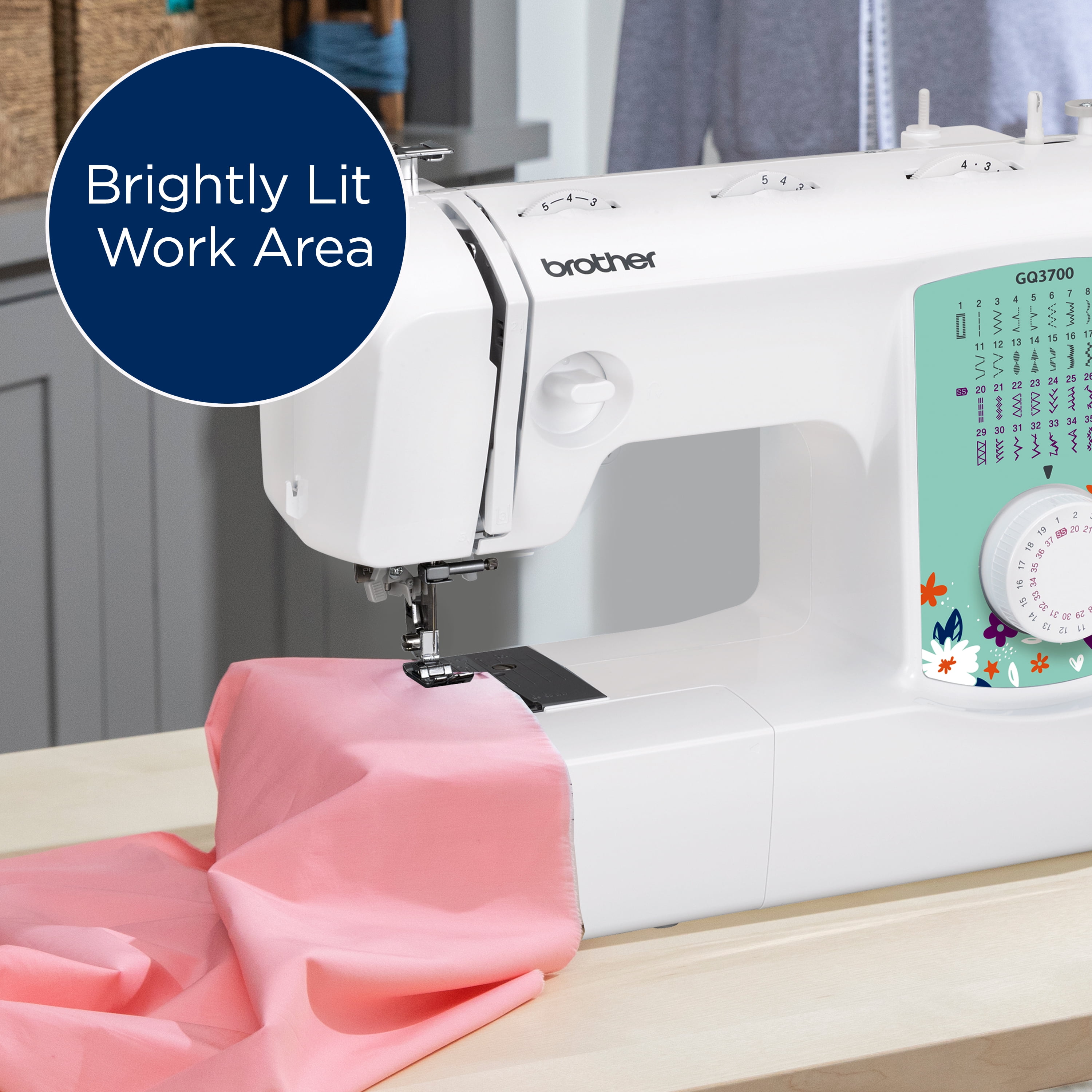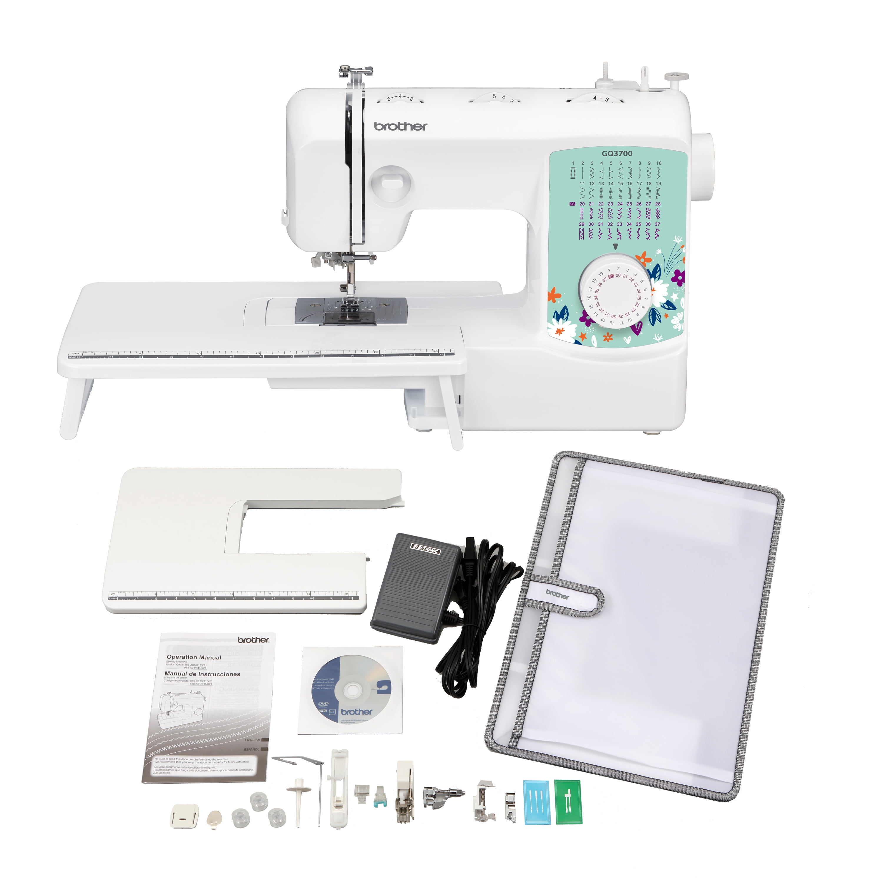 37 UNIQUE BUILT-IN STITCHES: The Brother GQ3700 includes 37 built-in stitches, including including a blind hem, decorative, and quilting stitches and an simple stitch selector for ease of use. FREE-ARM SEWING: Enjoy the ease of sewing cuffs, sleeves, and pant legs with the built-in free arm. BRIGHTLY LIT WORK AREA: The GQ3700 has brightly lit LED work area so you can see stitches on dark fabrics. USER-FRIENDLY FEATURES: Designed for ease of use, the GQ3700 also has a built-in easy needle threader, jam-resistant Quick-Set top drop-in bobbin, and an automatic bobbin winding system. A LARGE TABLE FOR BIGGER PROJECTS: The oversized table makes it easy to maneuver larger quilting projects, and the walking foot allows for smoother feeding of multiple layers. INCLUDED ACCESSORIES: Includes a Buttonhole Foot, Zipper Foot, Zigzag Foot, Blind Stitch Foot, Button Sewing Foot, Narrow Hemmer Foot, Walking Foot, and Quilting Foot. Condition: New AT YOUR SIDE SUPPORT: The GQ3700 sewing and quilting machine comes with Brother At Your Side support offering free technical support via online, live chat or phone for the life of your machine