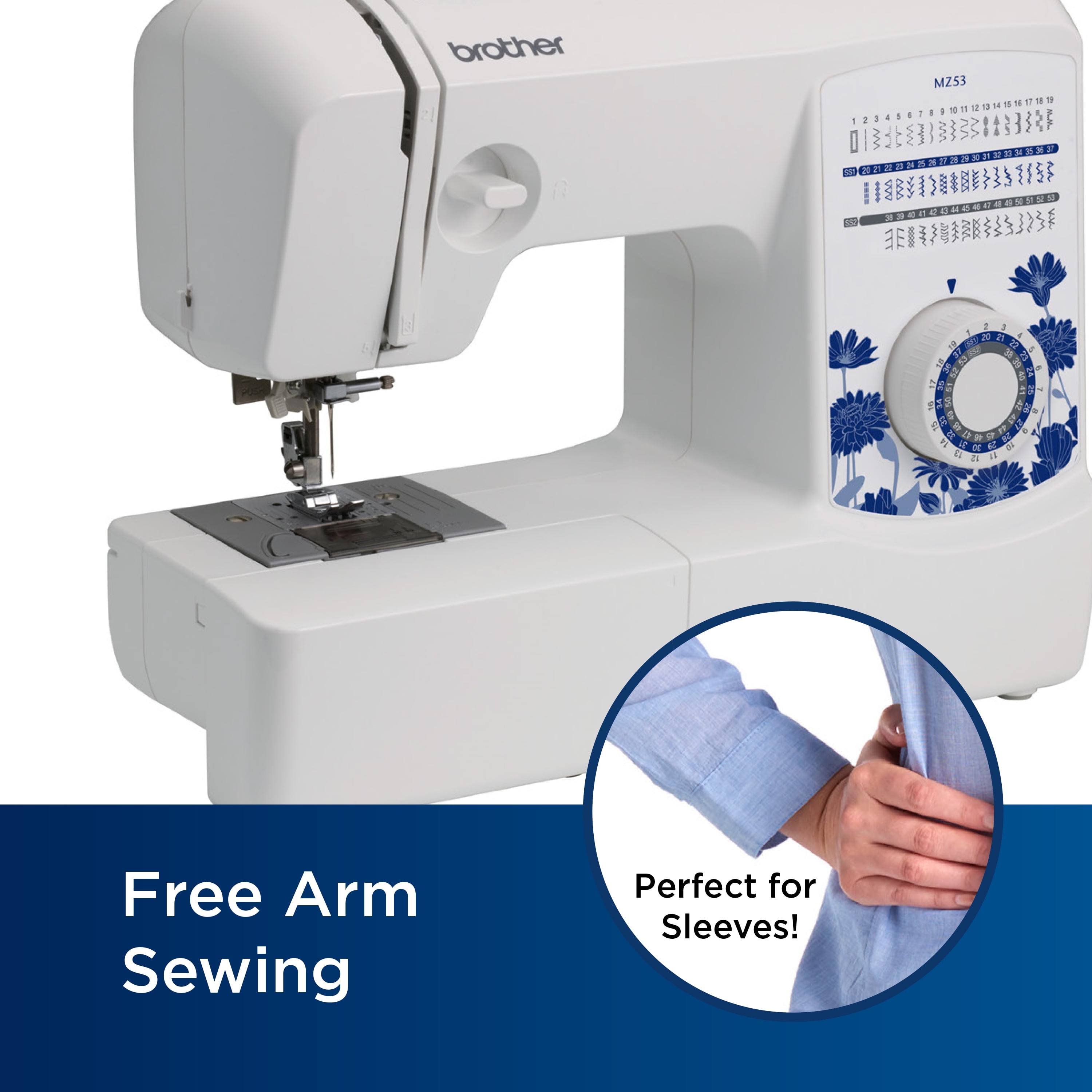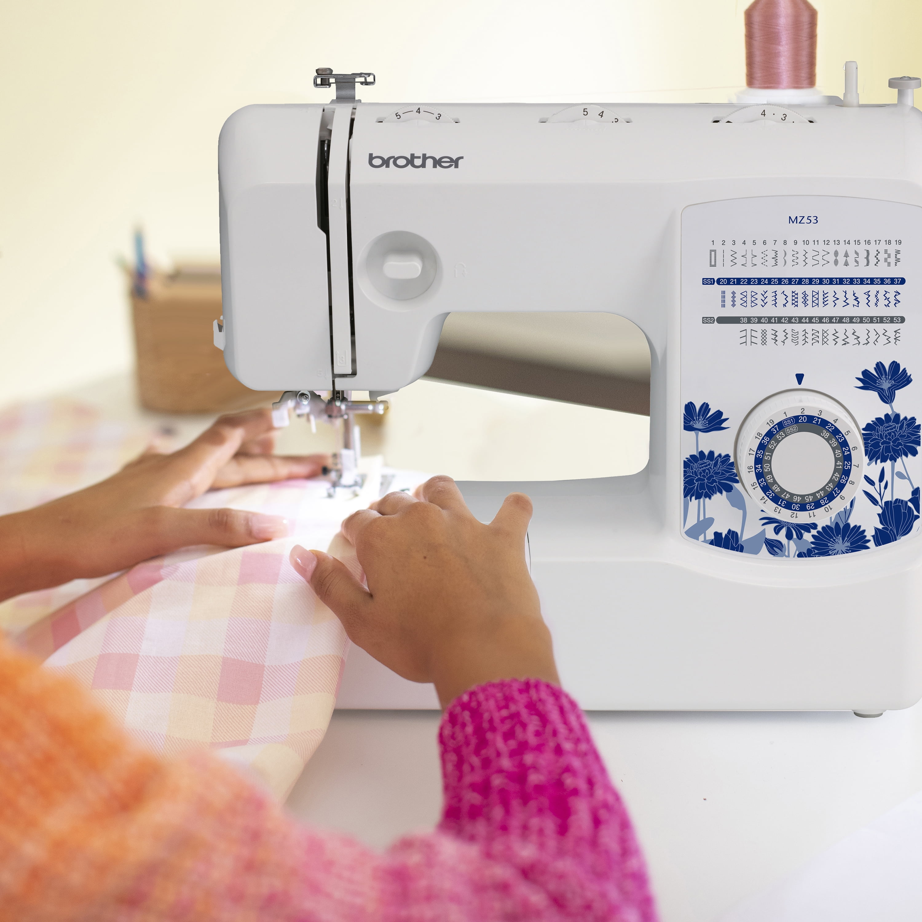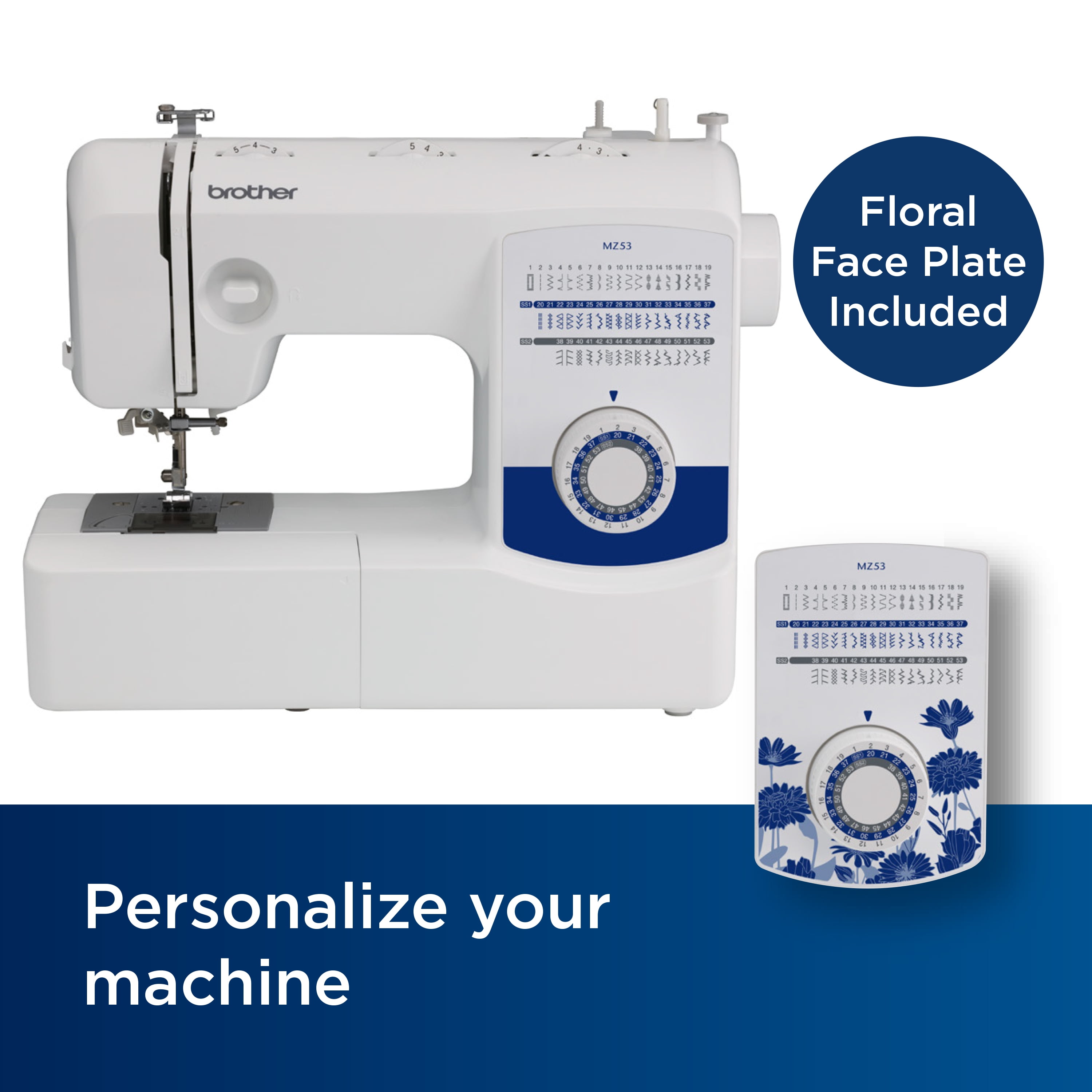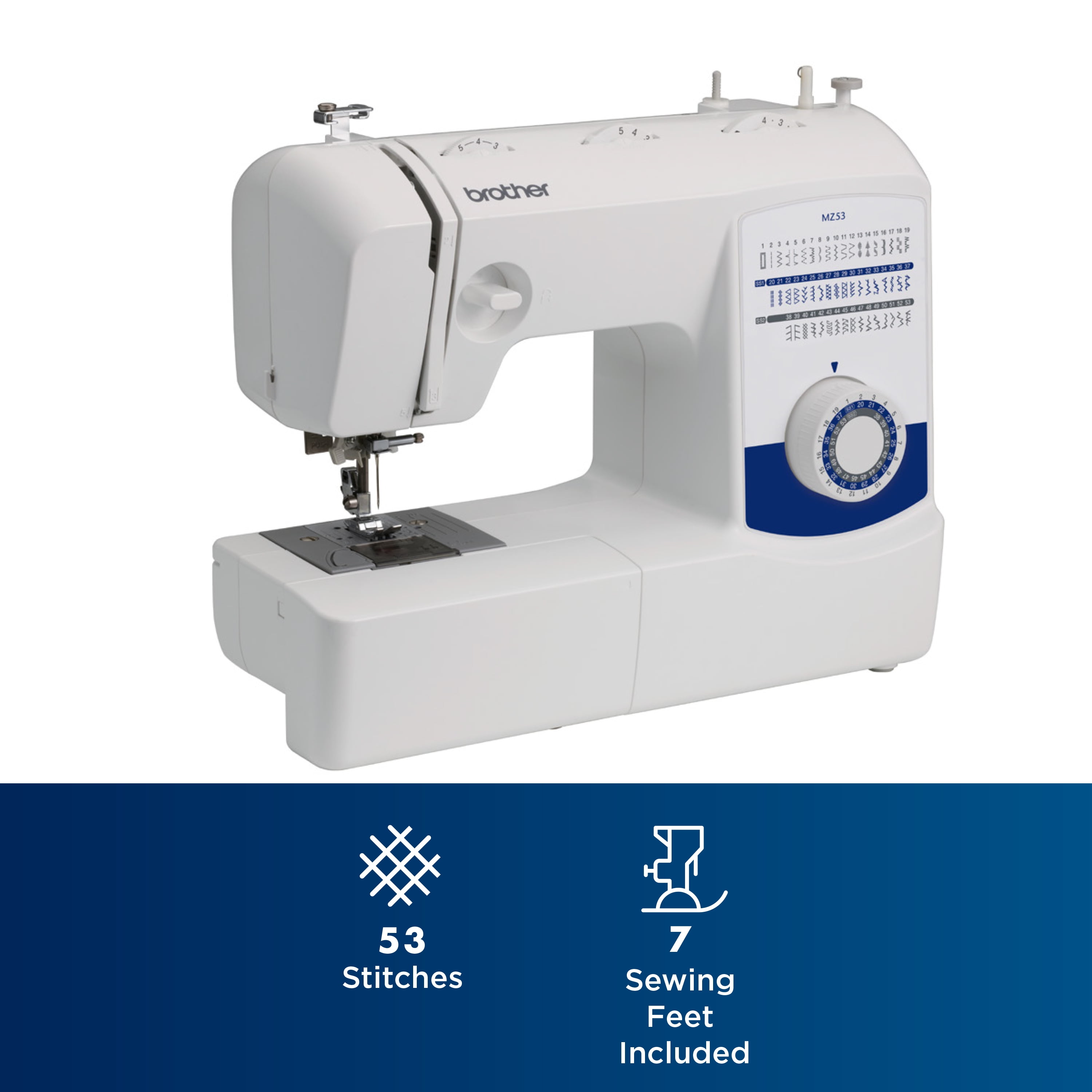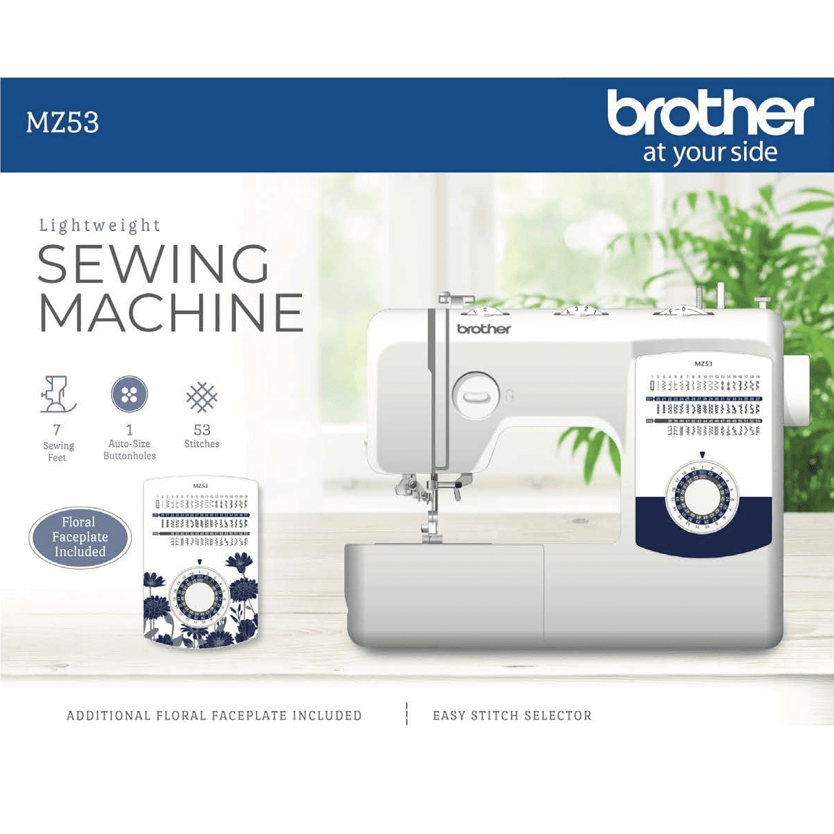 The MZ53 Mechanical Sewing Machine includes 53 built-in stitches including decorative, blind hem, zigzag, and stretch stitches and an auto-size buttonhole, great for sewing and mending! Condition: New Machine Type: Mechanical Sewing Machine At your side support: The MZ53 sewing machine comes with Brother At your side support offering free technical support via online, live chat or phone for the life of your machine This product is intended for sale only in the US at 120 volts, and any other use or sale voids the warranty. Added finger guard for additional safety to prevent touching the needle unintentionally while sewing. Additional floral face plate to personalize your machine Includes 7 versatile sewing feet: buttonhole, overcasting, monogramming, zipper, spring action zigzag, blind stitch and button sewing foot. Suggested User: Beginner to Advanced Weight: 12.324 lbs