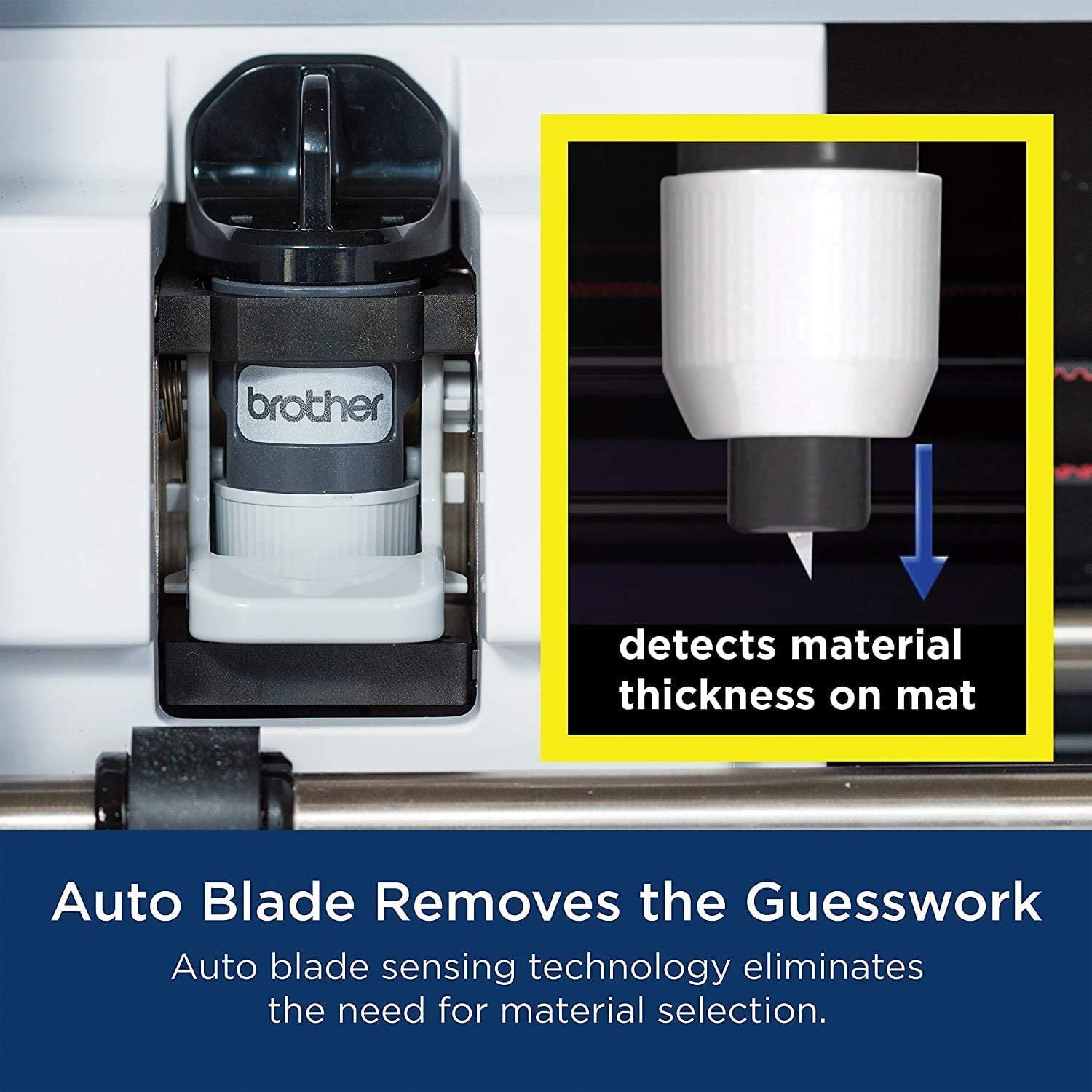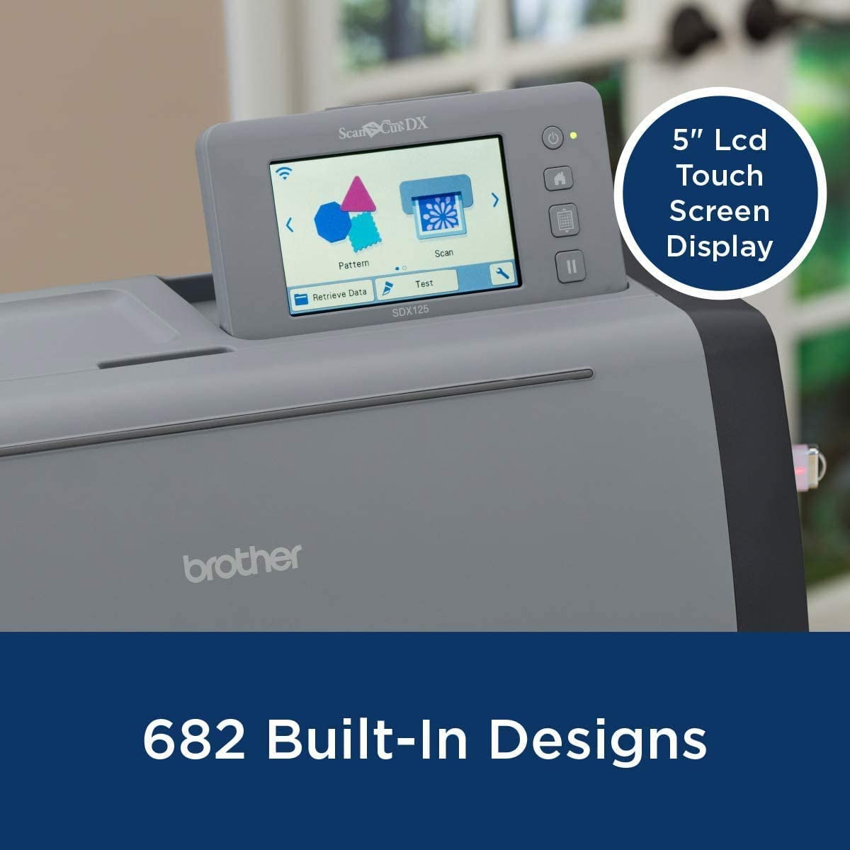 SCAN DRAWINGS AND MATERIALS: Brother ScanNCut is the only cutting machine series with a built-in scanner. Scan your drawing to convert it to a cut file, directly cut printed stickers, and precisely place designs without counting blocks STUNNING DIY PROJECTS: Craft with 682 built-in designs including 100 quilting patterns and 9 fonts. Add custom designs and additional free patterns with the USB port and wireless capability, and customize and combine your projects with the easy-to-use 5 in touchscreen LCD display NO MATERIAL SELECTION REQUIRED The included ScanNCut DX auto blade and auto blade holder uses true automatic material sensor technology to detect the thickness of the material with no blade adjustment or material selection required. Always perform a trial/test cut to confirm a successful cut CUTS UP TO 3 millimeter (0.1 in) THICKNESS: The Brother Home Electronic Cutting Machine effortlessly cuts materials up to 3mm thick such as paper, vinyl, fabric, balsa wood, chipboard, foam and felt BUNDLE INCLUDES: Brother ScanNCut SDX125EGY machine, and 6 replacement blades CADXBLD1 (1 standard tack mat, black pen, pen holder, touch pen, spatula, accessory pouch, pattern collection, auto blade, auto blade holder, Getting Started guide and 1pc sample cardstock come in the SDX125EGY box too)