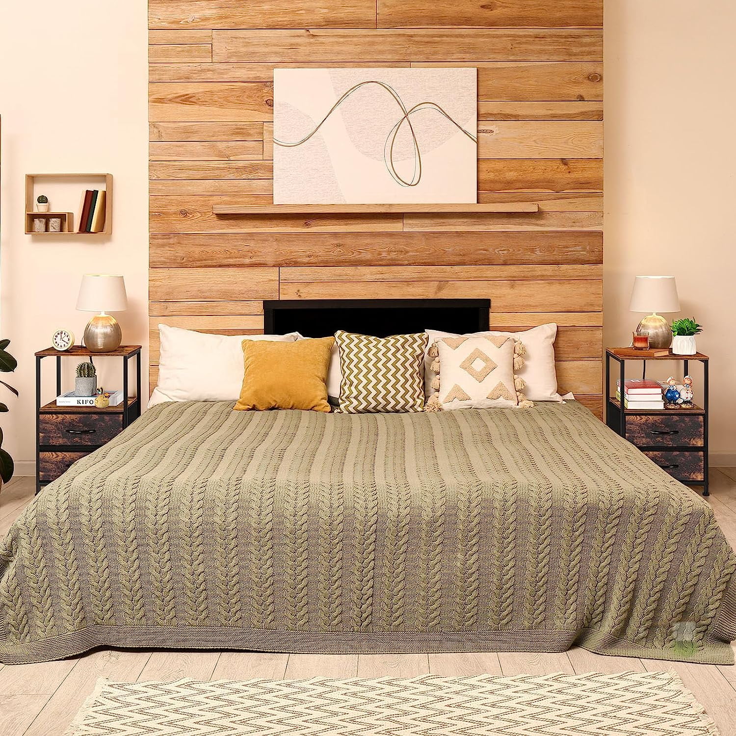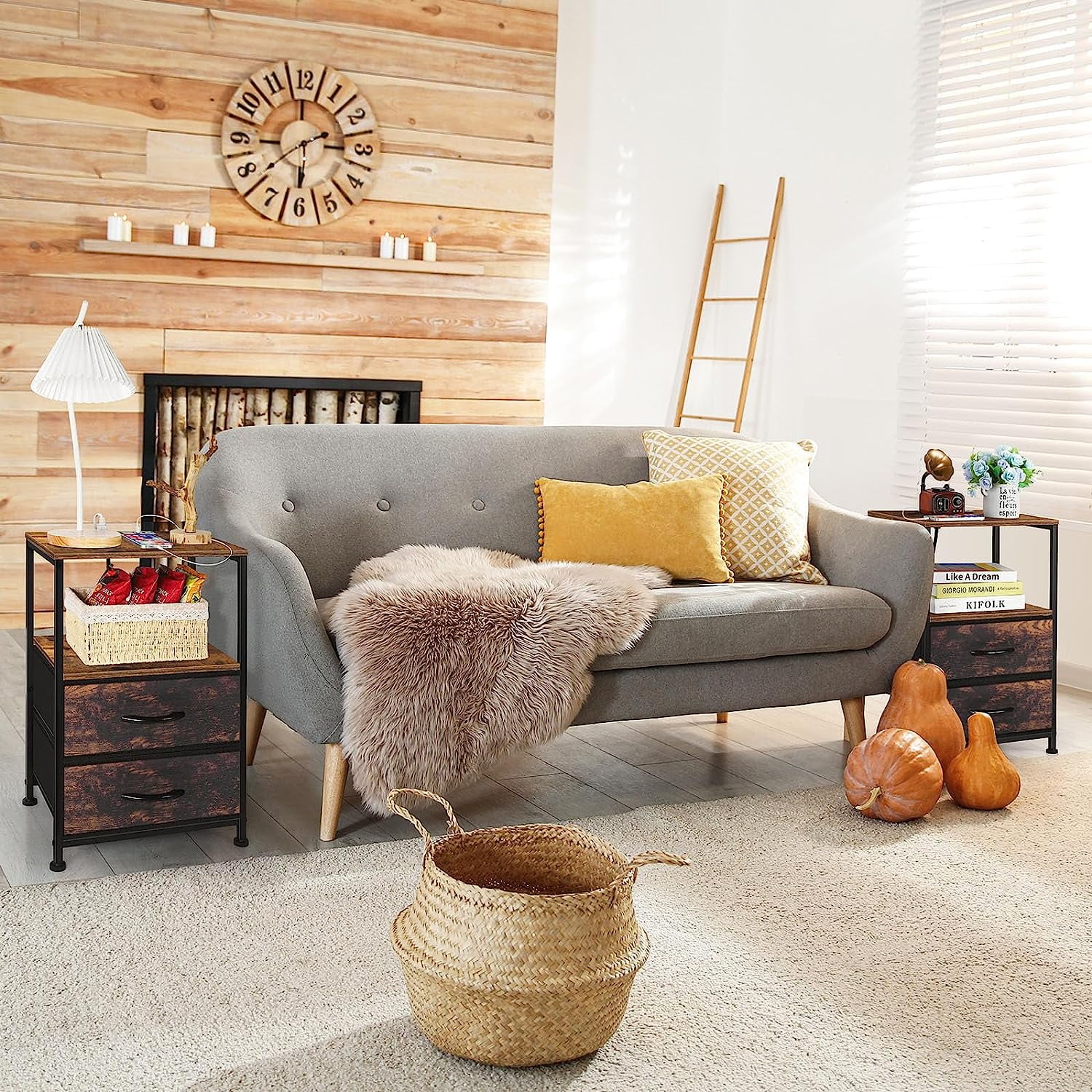 [Spacious Storage Space]: If you’re on the hunt for something chic, timeless, and budget-friendly, this is your guy. The bedside table’s size is 15.75″L x 11.8″W x 23.8″H, it’s a good decoration for your home. And this nightstand can be used as a side table, sofa table, nightstand, and small coffee table. [Charging Station]: Are you still worried about charging your mobile phone or laptop? This side table has 2 outlets and 2 USB ports to satisfy your charging needs and solve your charging problem. No need to look around, It can easily charge your mobile phone, tablet, lamp, or laptop, and get everything you need within reach. [2 Large Fabrics Drawers]: This nightstand set of 2 has 2 large fabric drawers, which are set on smooth sliding rails to provide convenience for customers and also avoid product noise. At the same time, the front side of the drawer is printed in rustic brown, combined with the black metal frame, the end table create a new industrial style. [Easy to Assemble and Clean]: This side table comes with numbered parts and clear instructions to help you finish the assembly easily. The tabletop is waterproof heat-resistant and dust-free you just need a damp cloth to keep the table clean. Equipped with adjustable feet mats to accommodate uneven surfaces and prevent scratching the floor.