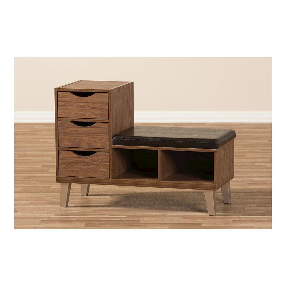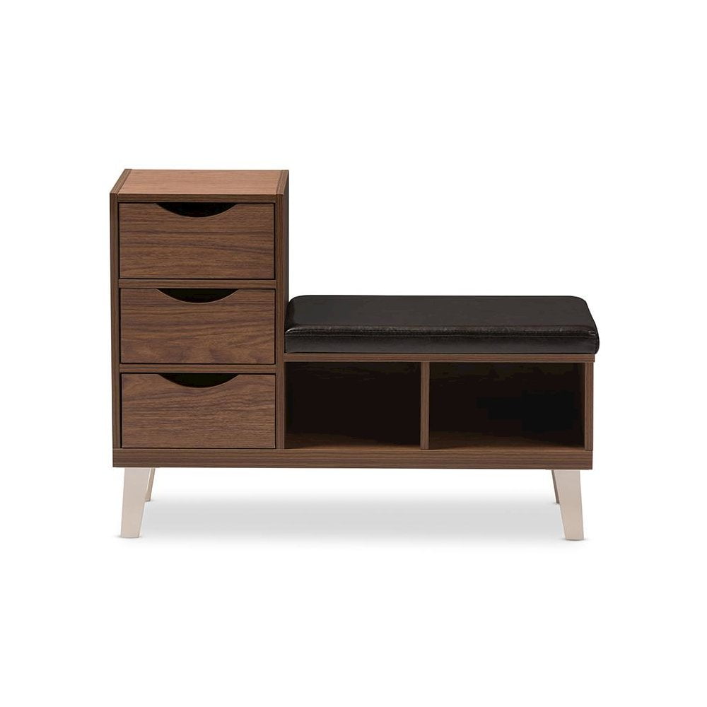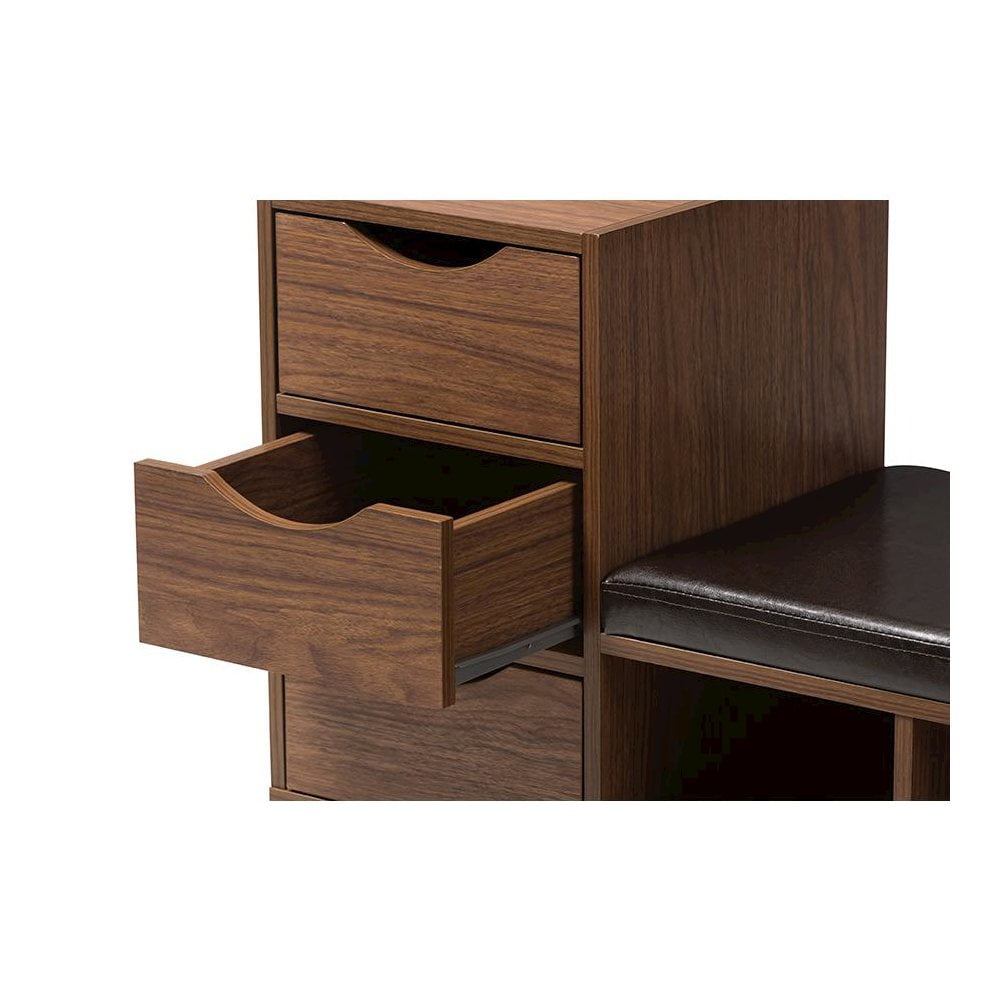 Brown Wood 3-Drawer Shoe Storage Leather- Pad Seating Bench with Two Open Shelves Simple and architectural, the Arielle 3-drawer shoe storage padded leatherette seating bench is reminiscent of modern and contemporary design. The Arielle?s clean and functional design features powder coated vinyl legs supporting the framework of the seating bench while providing storage drawers for hallway essentials. Three generous sized storage drawers and two open shelves are built in providing storage solution to keep your entryway or hallway clutter free. Crisp, clean lines and finger grooves drawers give the shoe bench an effortless character and charm. The shoe storage bench, constructed of engineered wood and finished in walnut finishing will match with your modern interior decor. The Arielle bench, padded in foam and upholstered in faux leather, could be placed in your living room or entryway as shoe storage bench or seating bench. Made in Malaysia, the Arielle requires assembly. Specifications: Modern and contemporary seating bench Materials: engineered wood Faux wood grain veneer
