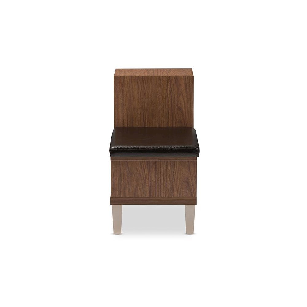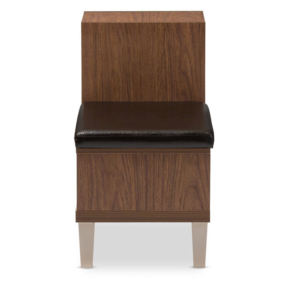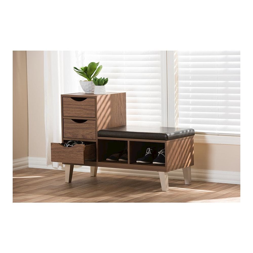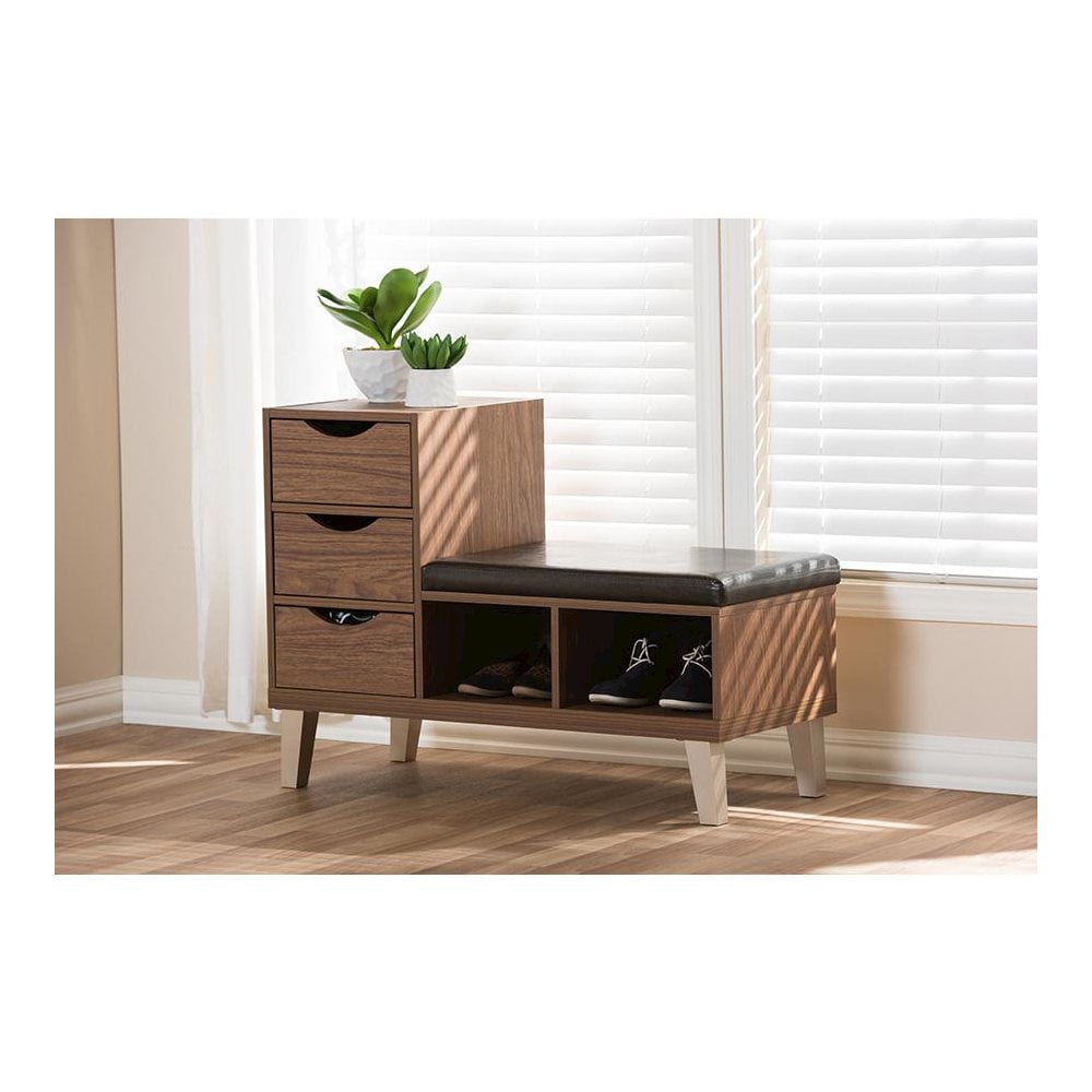 Brown Wood 3-Drawer Shoe Storage Leather- Pad Seating Bench with Two Open Shelves Simple and architectural, the Arielle 3-drawer shoe storage padded leatherette seating bench is reminiscent of modern and contemporary design. The Arielle?s clean and functional design features powder coated vinyl legs supporting the framework of the seating bench while providing storage drawers for hallway essentials. Three generous sized storage drawers and two open shelves are built in providing storage solution to keep your entryway or hallway clutter free. Crisp, clean lines and finger grooves drawers give the shoe bench an effortless character and charm. The shoe storage bench, constructed of engineered wood and finished in walnut finishing will match with your modern interior decor. The Arielle bench, padded in foam and upholstered in faux leather, could be placed in your living room or entryway as shoe storage bench or seating bench. Made in Malaysia, the Arielle requires assembly. Specifications: Modern and contemporary seating bench Materials: engineered wood Faux wood grain veneer
