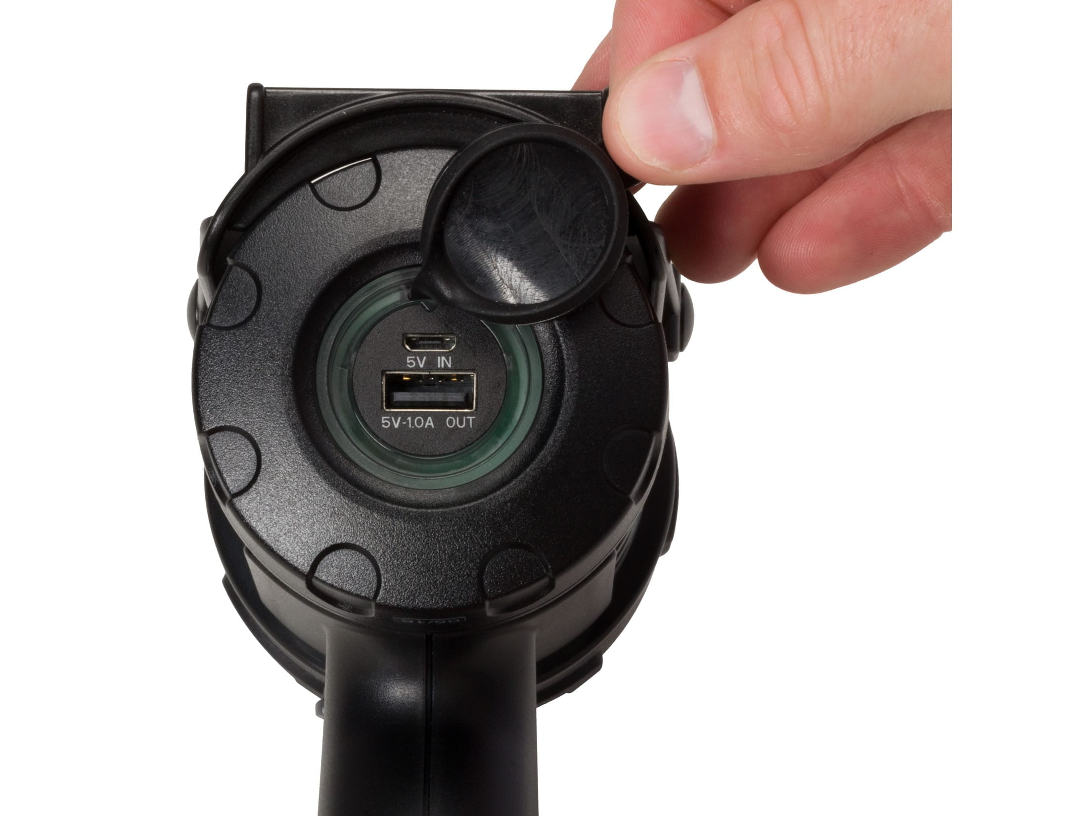 Max 915 lumens USB rechargeable spotlight with Power Bank, reaches up to 550 yards. Waterproof, submersible and floats on water, multiple lighting modes. This spotlight has it all: Lightweight, floating, USB rechargeable, multiple modes, and you can even use the Power Bank feature to keep your phone charged up in the field. Features Modes: High, low or flashing Powerful white LED that never needs replacing Power Bank: Draw power from the internal battery to charge other USB devices USB Charge: Recharge internal battery from a power source via USB cable provided Battery: 3,000 mAh Li-polymer (included) with color-coded charging and power-remaining indicator Easy, quick access to USB ports through waterproof rubber flap – Color-coded battery status and charging indicator Ultralight 14.5 ounce weight – Floats – Rubberized soft touch finish – Rugged polycarbonate housing and flexible rubber lens ring – Impact resistant to 1 meter – Built-in adjustable stand for hands-free use USB charging cable and lanyard included
