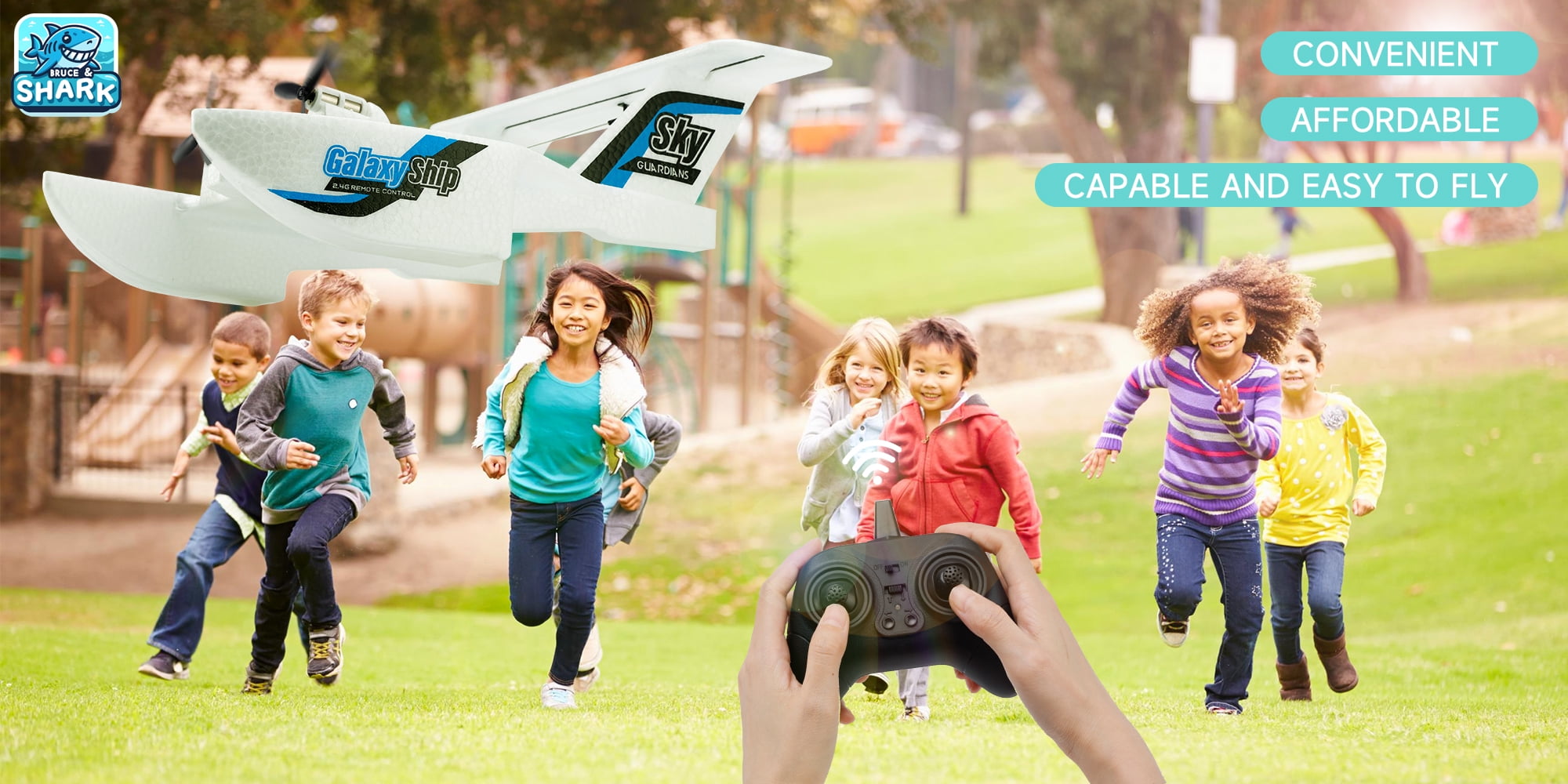 Bruce&Shark RC Plane Bruce&Shark RC Plane: Durable, Versatile, and Ready-to-Fly Fun for All Ages Experience endless fun with the Bruce&Shark Remote Control Plane! Constructed from durable EPP foam, this crash-resistant RC plane is designed to handle minor crashes and rough landings with ease. Enjoy over 20 minutes of flight time with two batteries, and choose from multiple takeoff options: from the ground, hand-tossed, or gliding from water. With 3 channels, versatile takeoff options, and two-speed modes, it’s perfect for both beginners and experienced flyers. The 2.4 GHz radio system ensures a reliable connection with safety alerts for low battery and out-of-range. Its waterproof design makes it ideal for over-water adventures. Ready-to-Fly and suitable for all ages, it’s the perfect gift for aviation enthusiasts and a great addition to any outdoor event. Product Information: Flight Time: 15-20 minutes Charging Time: 120 minutes Mode: 2.4 GHz Remote Control Distance: 492 feet (150m) Aircraft Passageway: 3 Channels Battery Capacity: 3.7V 800mAh Product Size: 11.4x10x4.5 inches (29×25.5×11.5cm) Box Size: 13.8x13x3.9 inches (35x33x10cm) Package Included: 2 x Battery 1 x Remote Control 1 x Charger 1 x Product Manual 1 x RC Airplane