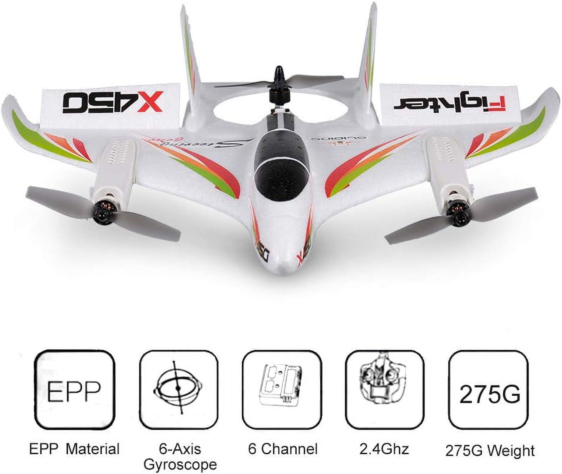 Bruce & Shark WLtoys XK X450 RC Airplane Experience exhilarating flight with the WLtoys XK X450 RC Airplane. Engineered for both durability and high performance, this airplane features impact-resistant EPO material reinforced with internal carbon fiber. It’s powered by three 1307 3000KV brushless motors and high-efficiency blades, delivering robust performance. The advanced 6-axis gyroscope ensures stability with 3D/6G mode conversion, accommodating various flying conditions and skill levels. Enjoy versatile flight capabilities including vertical takeoff/landing and multiple flight modes such as beginner and aerobatic. The high-capacity 11.1V lithium polymer battery provides up to 16 minutes of flight time. Optional features include 720P HD video transmission with adjustable camera angles and a GPS upgrade for one-key return, low-power return, and follow-me functionality. The WLtoys XK X450 is perfect for thrilling aerial adventures and versatile flying experiences. Product Specifications: Condition: Brand New Material: EPO Color: White Age Recommendation: 14+ Gyroscope: 6-axis Flight Time: Up to 16 minutes Charging Time: 50-60 minutes Frequency: 2.4GHz Motors: Three 1307 3000KV brushless motors Remote Control Distance: Over 980 feet (300m) Controller Battery: 6×AA batteries (not included) Battery: 11.1V (1000mAh) 20C lithium polymer Flying Weight: 7.4 ounces (209g) What’s Included: Remote Control Manual USB Charging Cable Battery Aircraft Accessories
