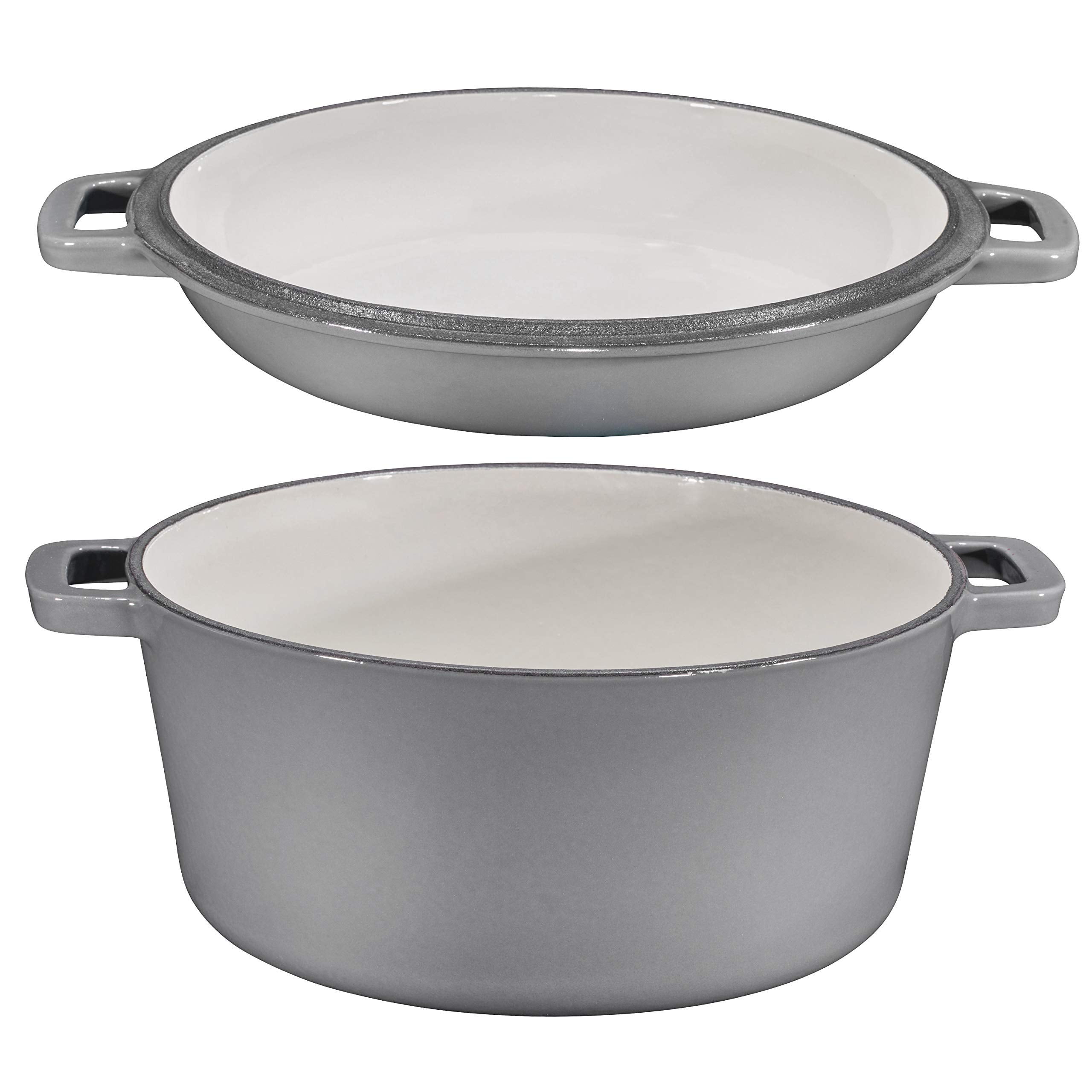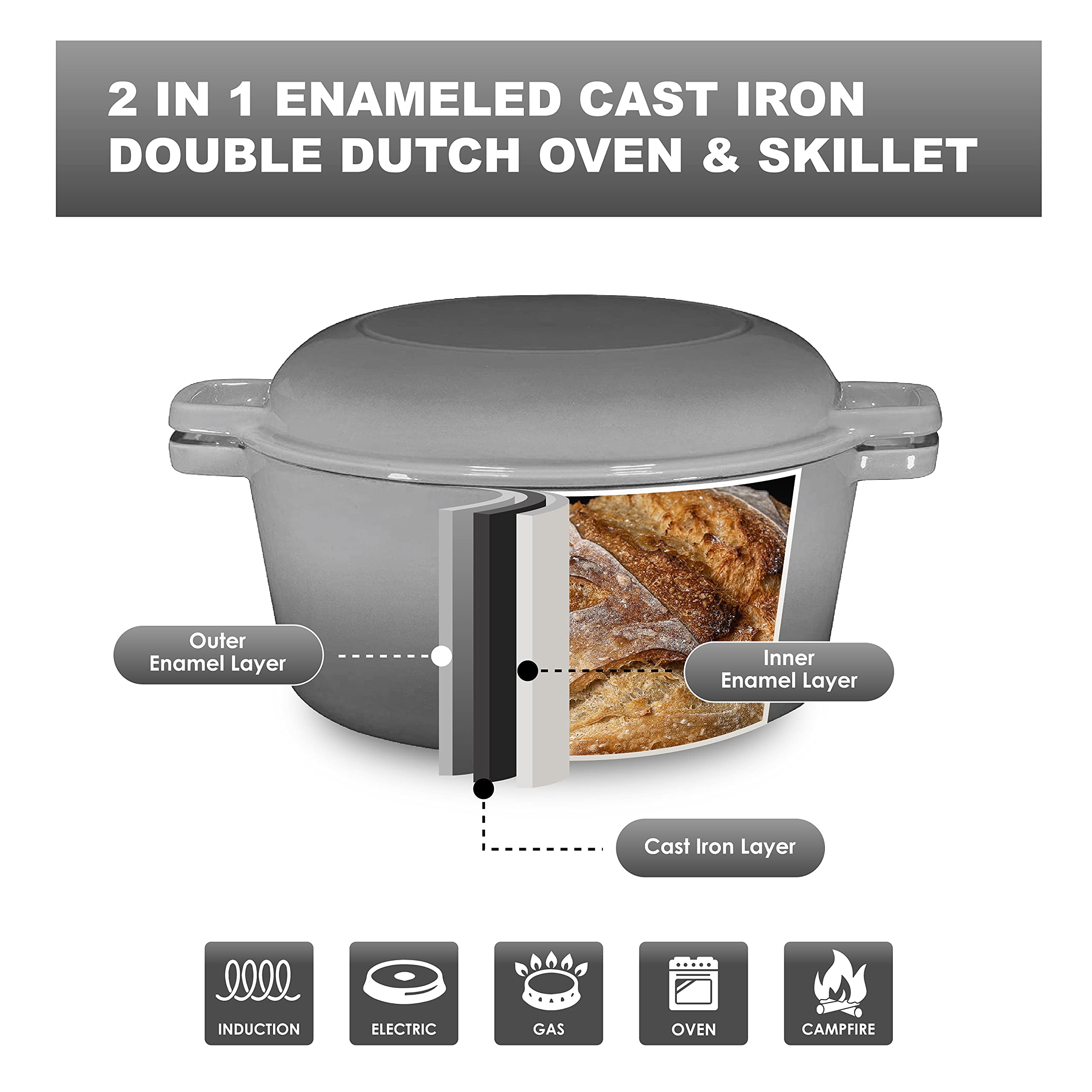 Bruntmor 2-in-1 Enamel Cast Iron Dutch Oven and Skillet – 5 Quart – Grey – Dutch Ovens – Cast Iron Cookware Clearance – Ceramic Dutch Ovens – Lodge Dutch Ovens – Enamel Dutch Ovens