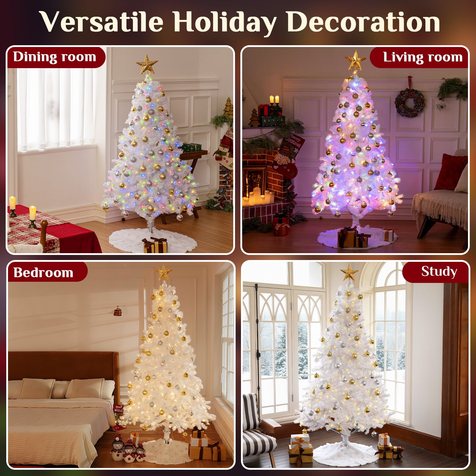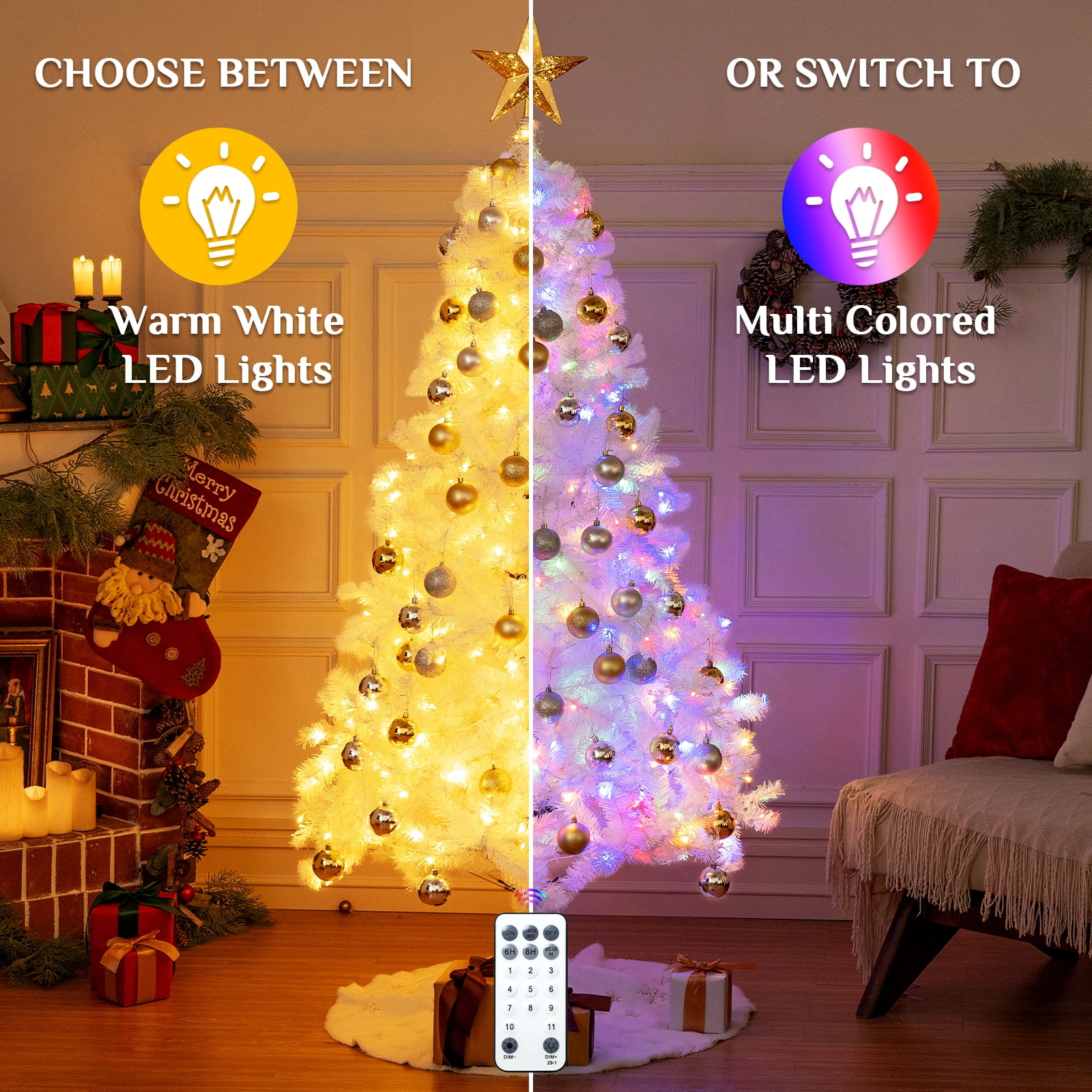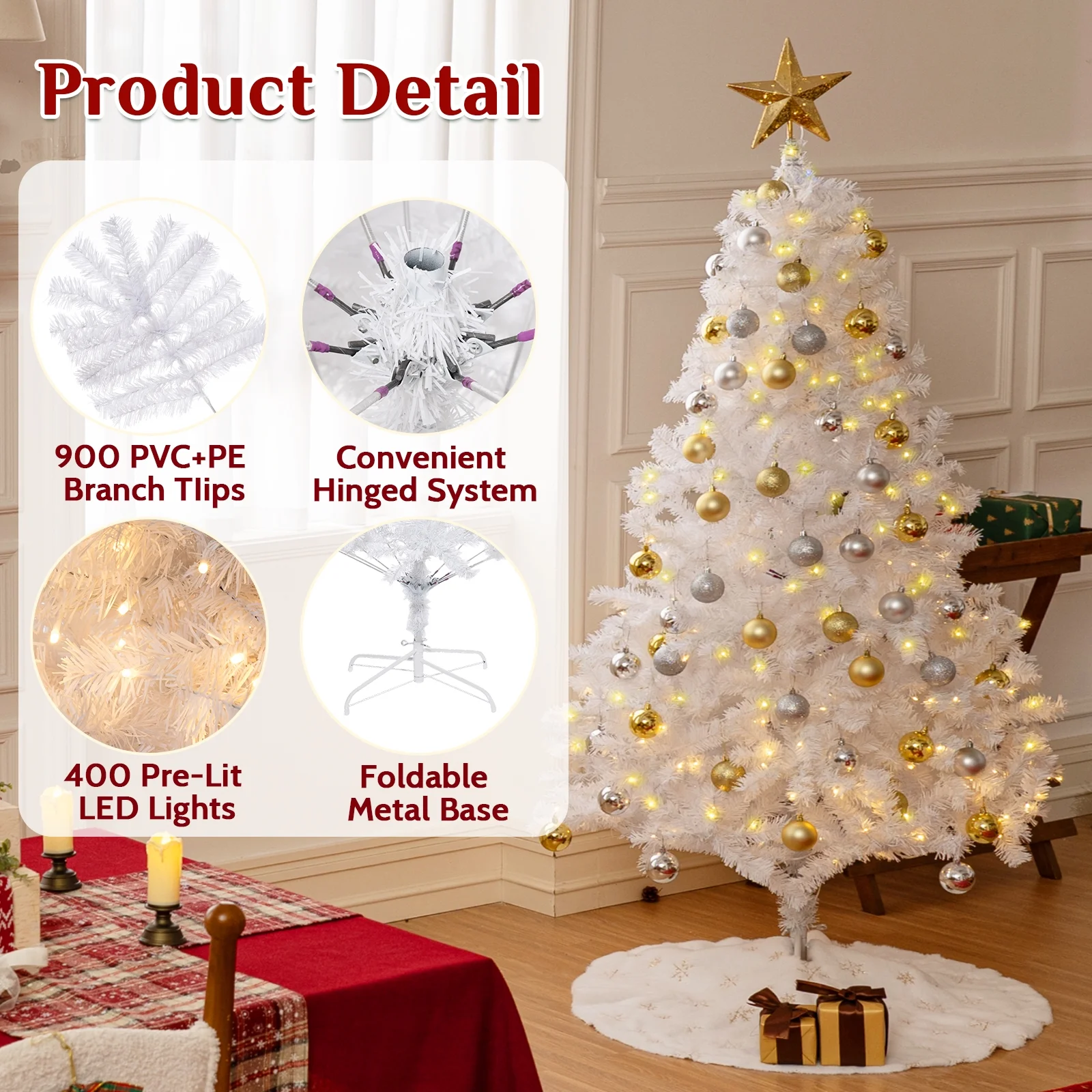 ??Radiant Illumination:Equipped with 400 pre-strung LED bulbs, this tree offers two light modes – warm light alone and a vibrant multicolor display, allowing you to create the perfect festive ambiance in your home. ??Lush Branches :Boasting an impressive count of 1000 branch tips, this tree offers a lush and full appearance, providing the perfect canvas to showcase your cherished ornaments and decorations. ??Hinged Design: The innovative hinged design allows for effortless setup, as the branches are attached to the central pole through hinges, enabling you to unfold and shape them with ease. ??PVC Leaves:Crafted with premium, flame-retardant, and non-allergenic PVC+PE materials, this tree not only ensures a lifelike appearance but also promises long-lasting durability and easy maintenance.
