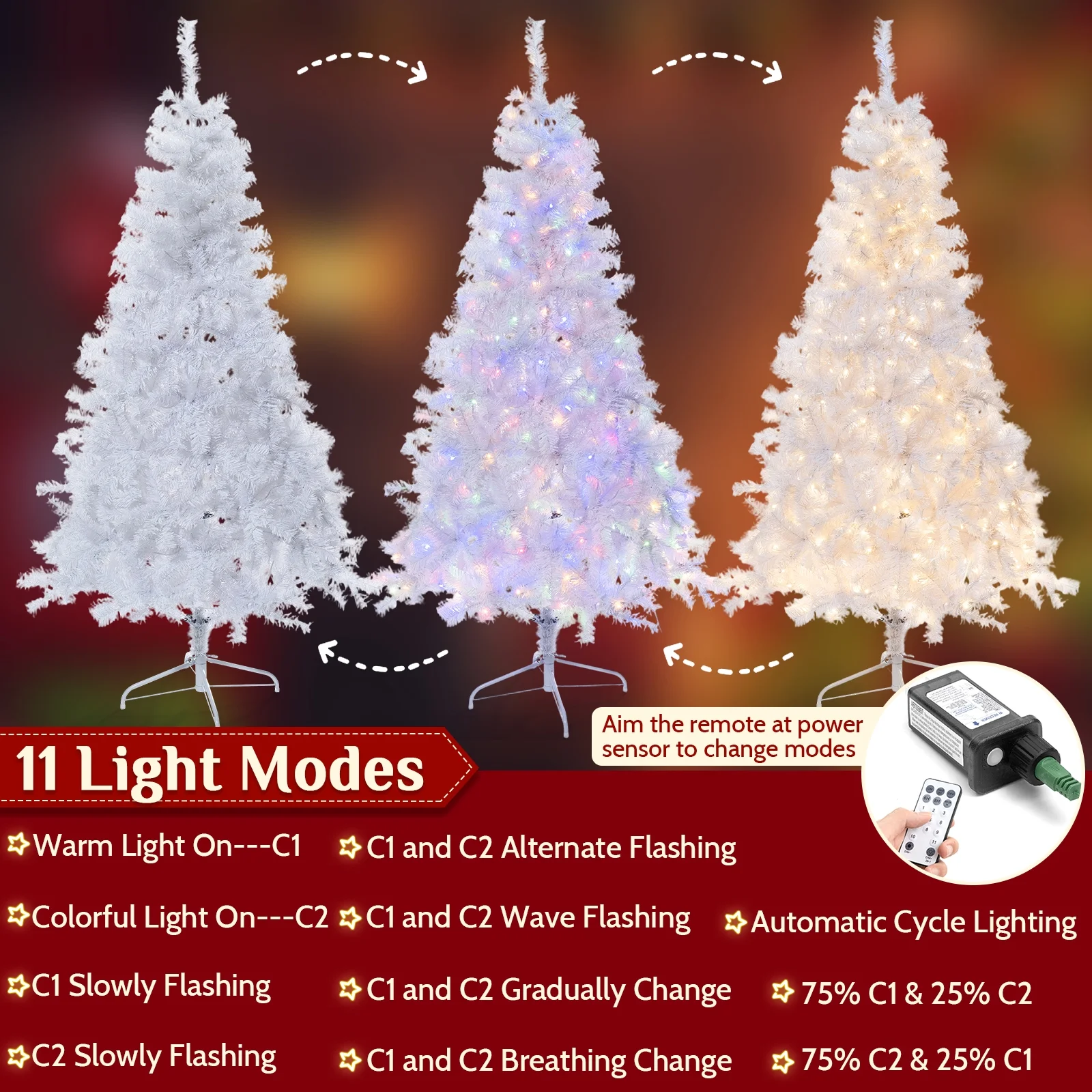 BSHAPPLUS® 6ft Pre-Lit White Christmas Tree with Remote Control,Artificial Hinged Christmas Tree with 500 LED Lights, 11 Light-Modes and 1200 Branch Tips for Home, Party Decoration