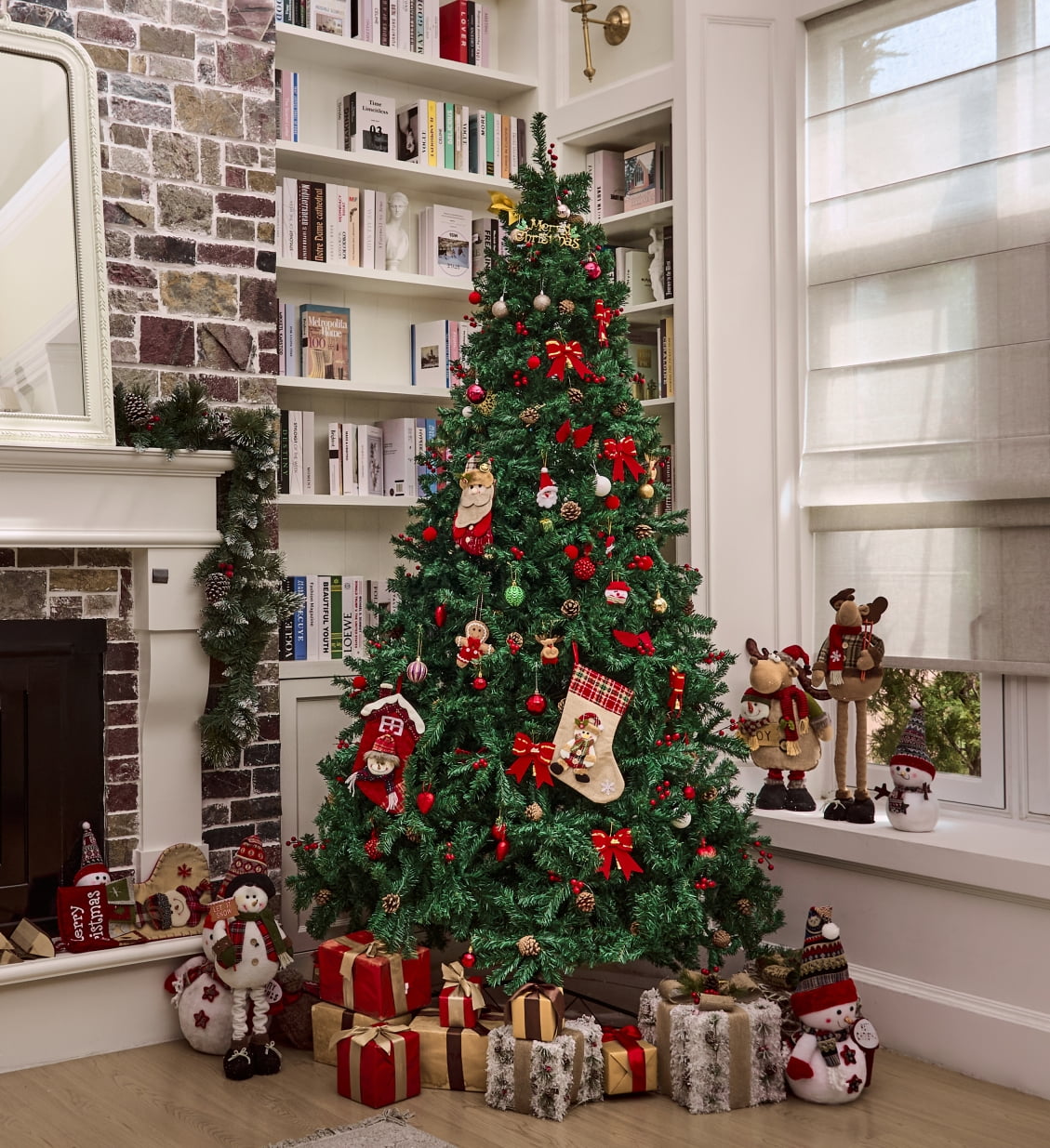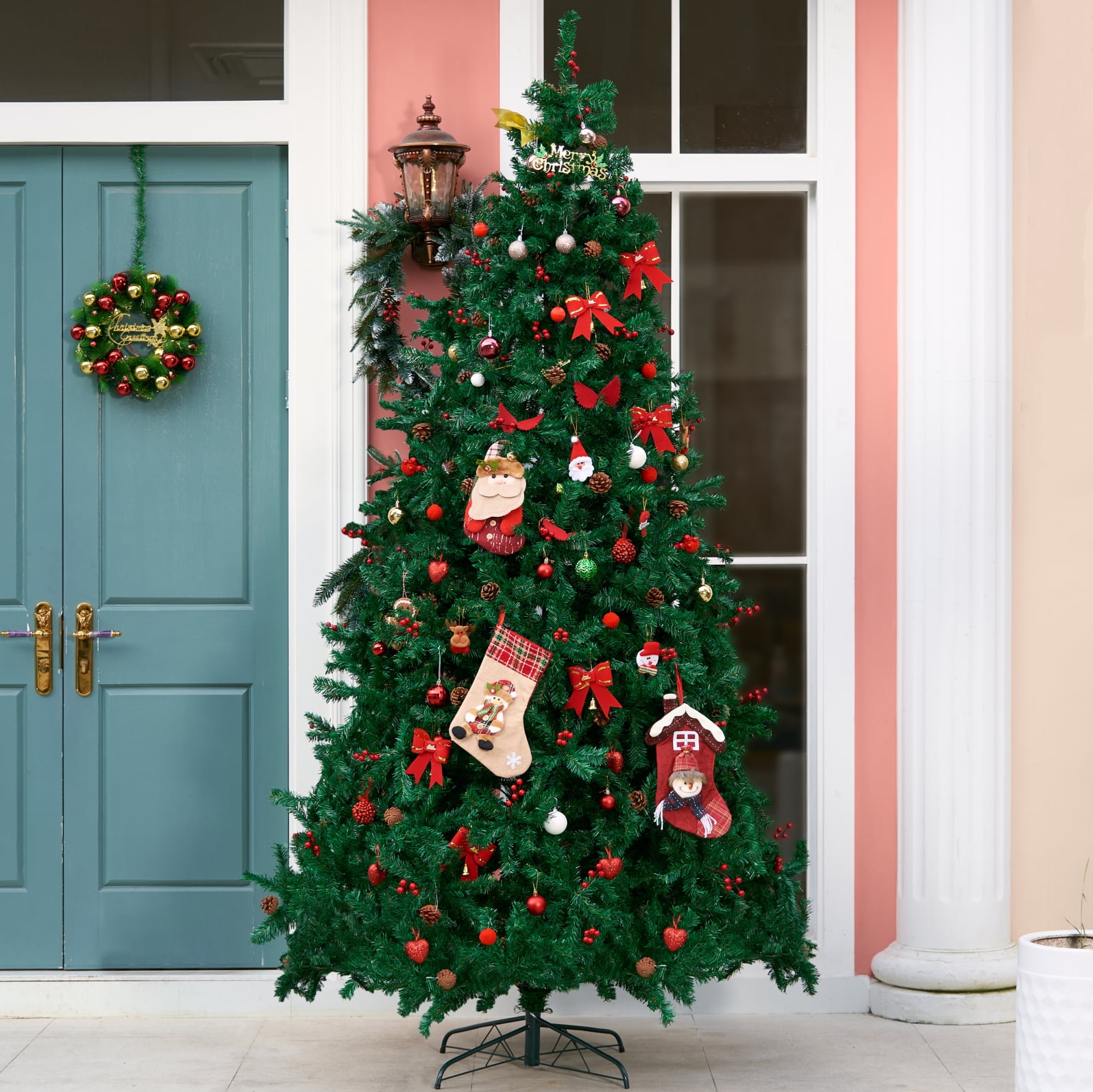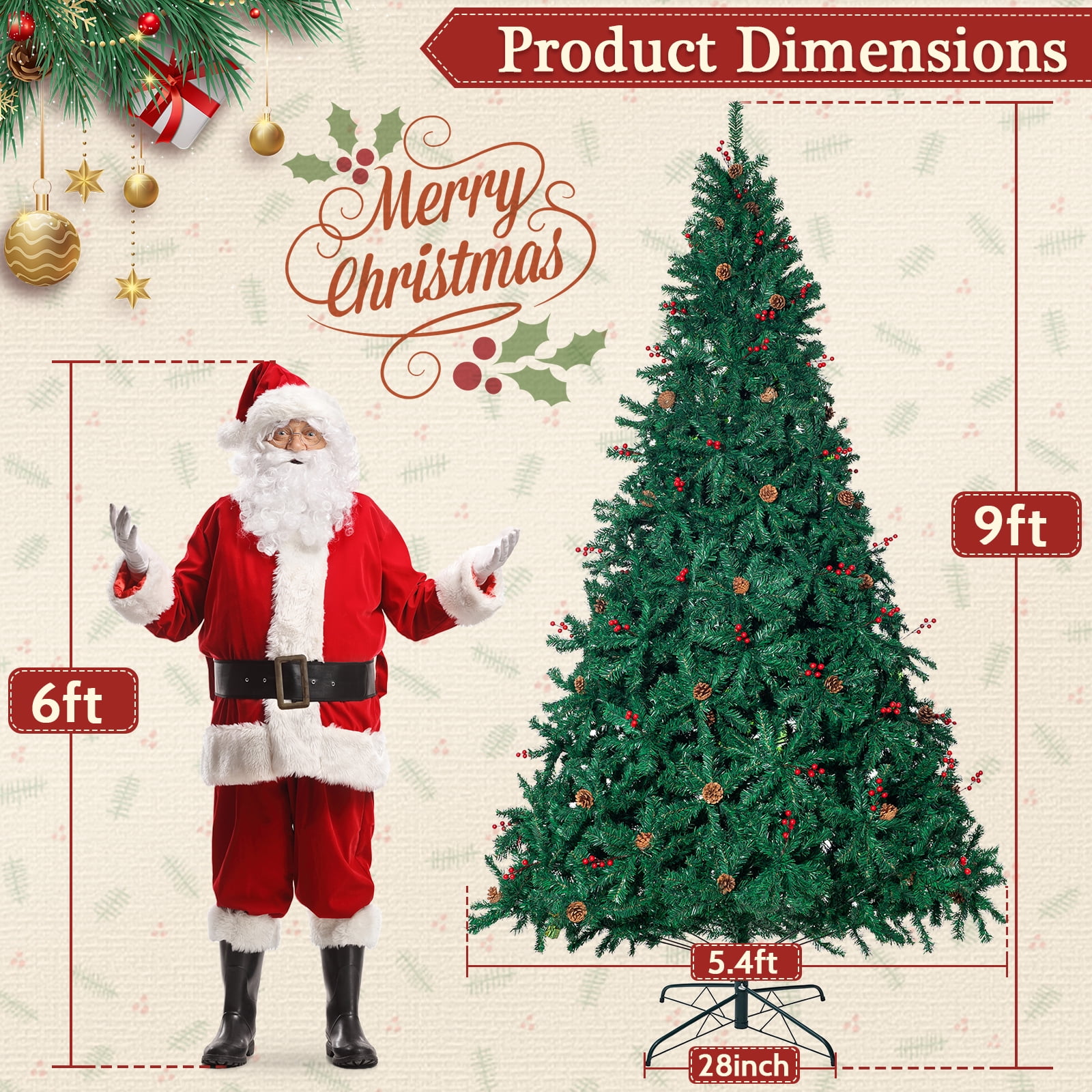 ????Lush Branches: With a remarkable count of 2800 branches, our tree boasts a lush and full appearance that captures the look of a natural fir tree. The branches are meticulously designed to hold your ornaments and decorations in style. ????Pre decorated design: Each Christmas tree is pre-decorated, lush branches decorated with plump pine cones and polished red berries, saving you the trouble of decorating the Christmas tree. ????Hinged Design: Set up your Christmas tree effortlessly with the innovative hinged design. Each branch is attached to the central pole through hinges, allowing you to unfold and shape them with ease, saving you time and effort. ????PVC Leaves: Crafted of premium materials that are flame-retardant and non-allergenic.. This material not only ensures a lifelike appearance but also promises durability and easy maintenance, so you can enjoy its beauty for years to come. Height: 9ft Diameter: 5.4ft Number of branch tips: 2800 Material: flame-retardant and non-allergenic pvc ????What’s Included: ???? 1 x 9ft green christmas tree with pine cones and berrys 1 x Hinge base ???? “O Christmas tree, O Christmas tree, with faithful leaves unchanging!”