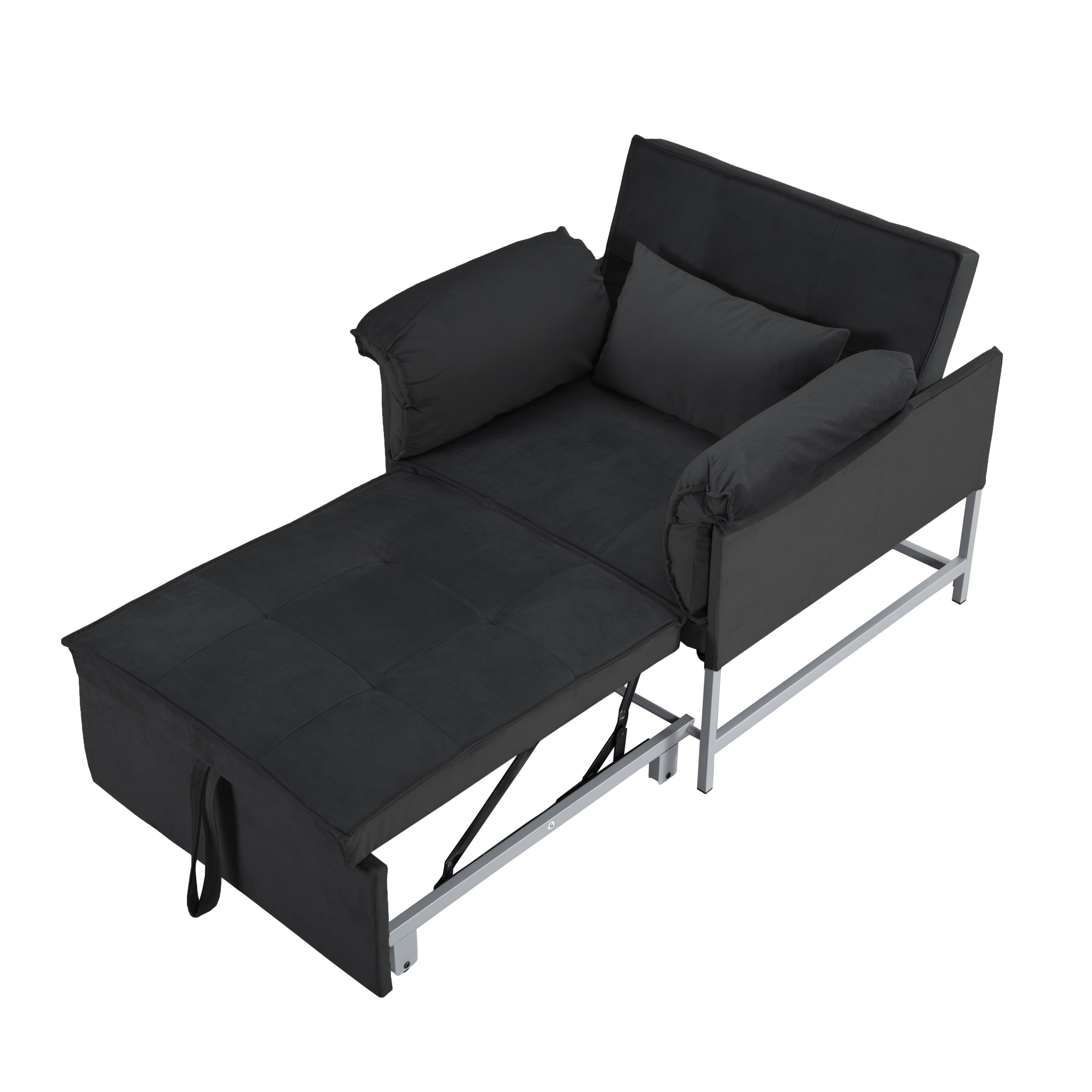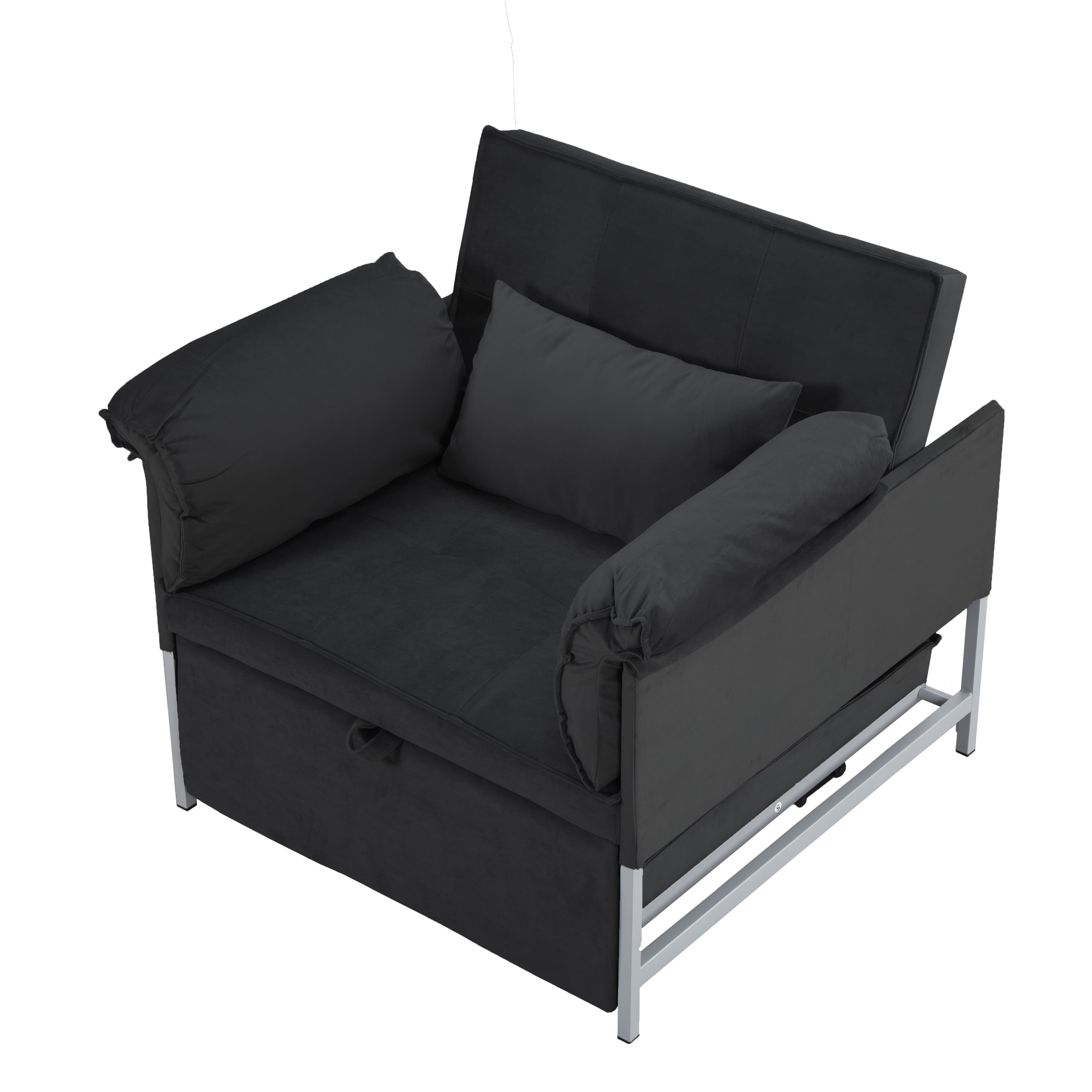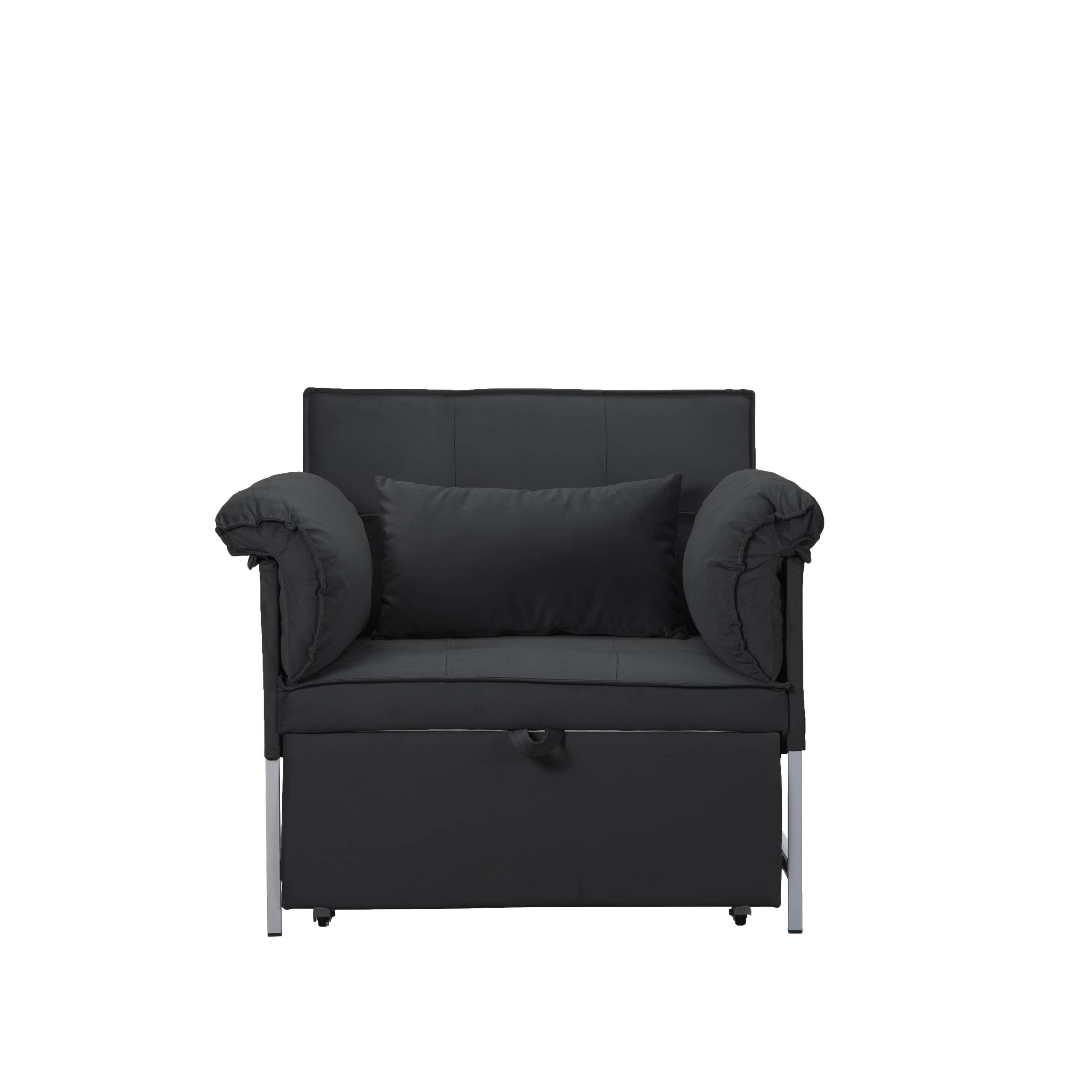 – 34.3” Convertible Pull-out Sleeper Chair, can be easily converted into a twin size bed by pulling out straps on the edge of the sofa, it’s perfect for accommodating overnight guests. – Structured in a metal frame, which it’s sturdy and durable. – Upholstered with velvet fabric, providing a soft and comfortable seating experience. 1 pillow included. – The back can be reclined in 3 angles, allowing you to find the perfect angle for sitting, reading ,watching TV or lounging. And converted into a sleeping bed in few seconds, it is an excellent option for your home, office, and guest room. Also perfect for small spaces. – Movable arm cushion. – Vacuum packing. Please press and pat the cushions after opening the package, wait to rebound after 72 hours at least for your perfect use. – This sofa is packed in one box and all tools included, please scan the QR code to get installation video, please feel free to contact us if any questions. Product Type:Chair Design:Sleeper/Sofa Bed Mechanism:Fold out Sleeper Overall – Sofa:34.3” x 34.3” x 31.5”H -Sleeper:34.3” x 68” x 25.6”H Seating Capacity:1 Seat Height:15.4” Back Height:16.9” Arm Height:25.6” Leg Height:3.1” Reclined Angle Back:110°~145°~180° Minimum door width:11” Product Weight:64.9 LBS Number of Pieces:1 Package Weight:69.67 LBS Carton size:38.98”x30.31”x10.24” / 69.67 LBS Upholstery Material:Velvet Upholstery Colour:Black, Grey Seat Fill Material:Foam Back Fill Material:Foam Frame Material:Metal + Manufactured Wood Seat Construction:Metal Leg Material:Metal Leg Color:Black Back Type:Tufted back Arm Type:Square arm Back & Seat:Not removable Toss Pillows:Yes Joinery:Brackets/clips Storage:No Weight Capacity:300 LBS each seat Product Care:Wipe clean with dry cloth, do not use strong liquid cleaners Intended Use:Residential Use Country of Origin:China Shipping:Courier Assembly Required:Yes Level of Assembly:Partial Assembly Assembly Time:40 Minutes Adult Assembly Required:Yes Suggested Number of People:2 Additional Tools Required:All tools included Please do not open the compressed packaging until your sofa frame is completely assembled, otherwise it can’t be repacked in original packing way to return. Please review the product dimension and check if it’s suitable for your living room. It might be have color difference due to photograph lighting, or computer monitor displayed. It’s not quality issue.