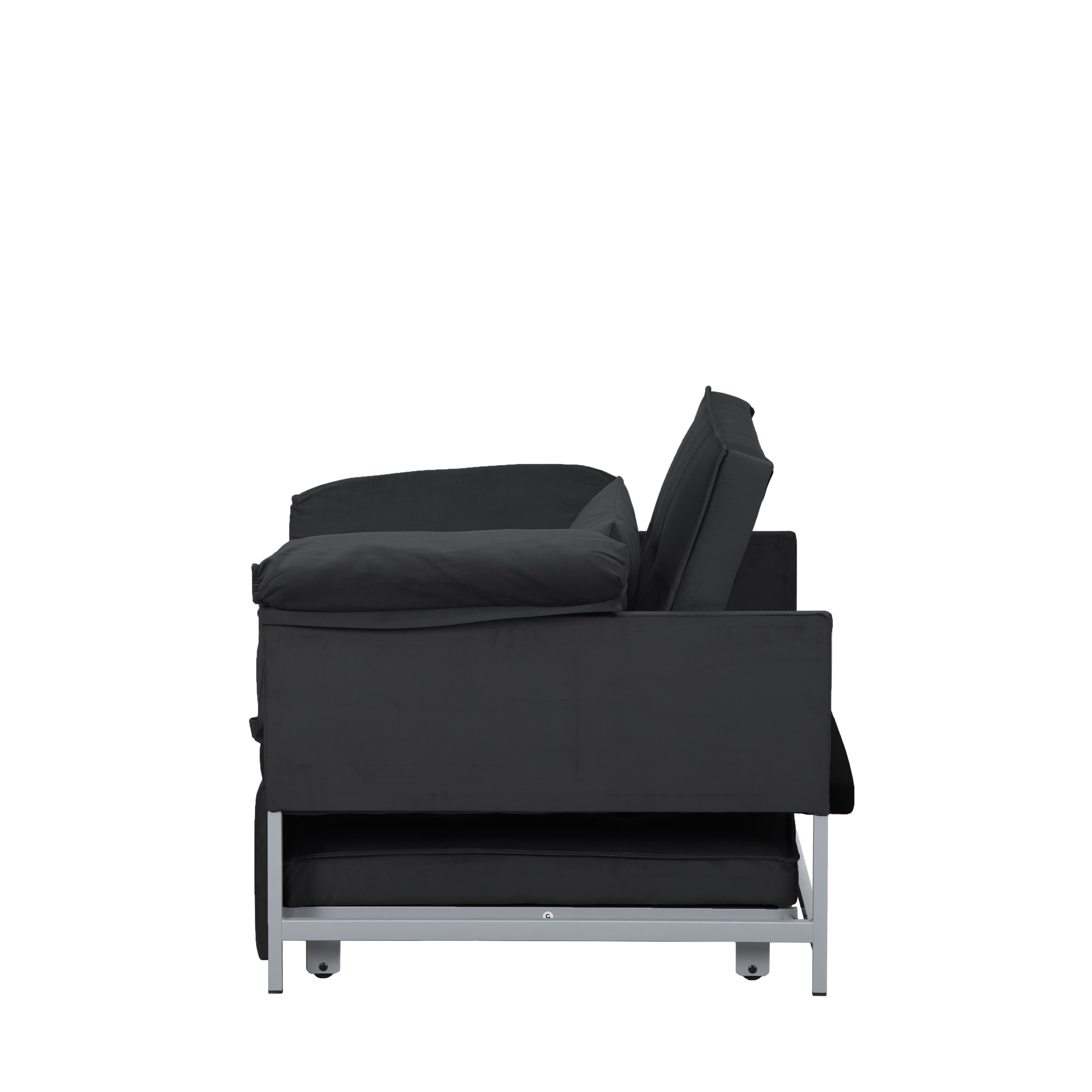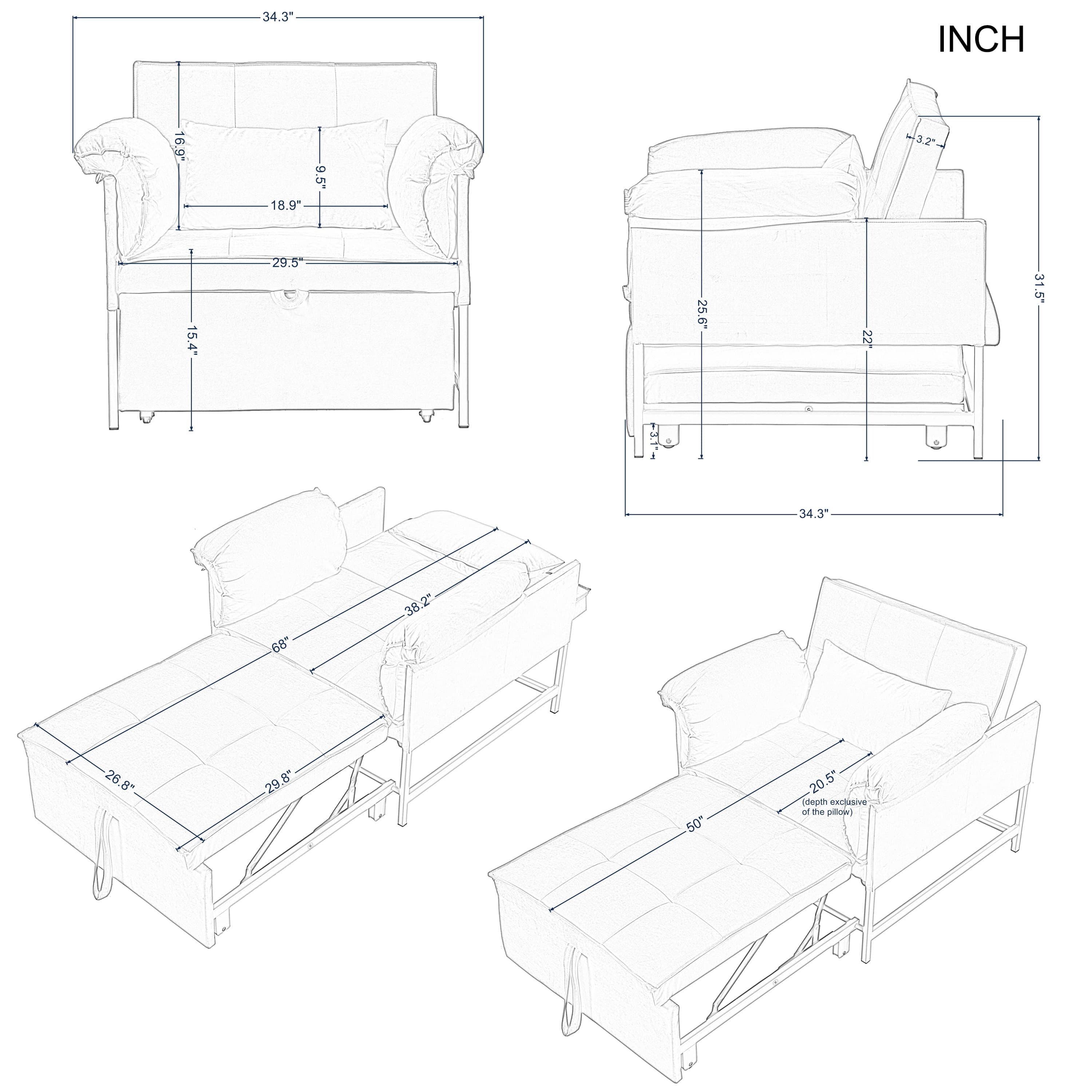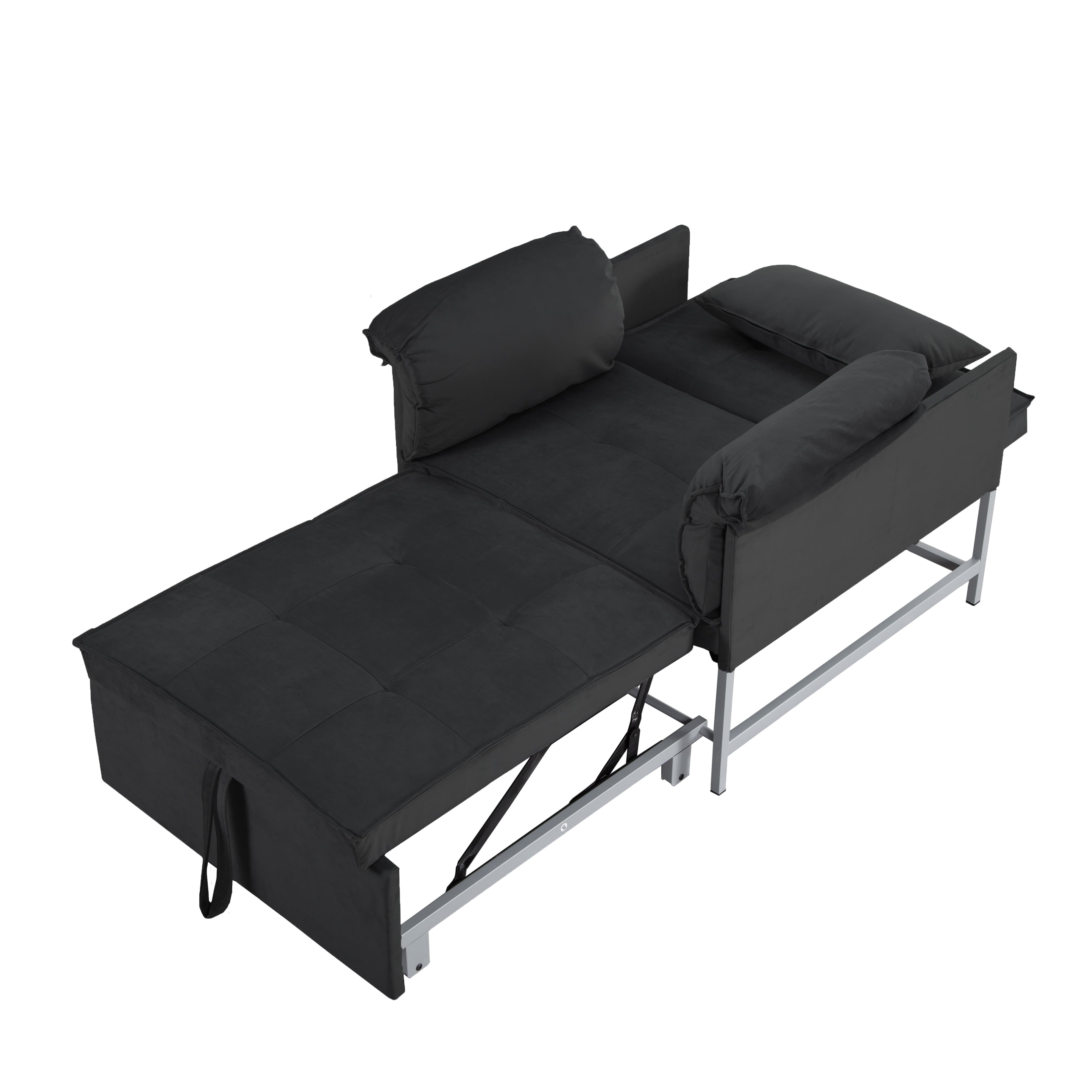 – 34.3” Convertible Pull-out Sleeper Chair, can be easily converted into a twin size bed by pulling out straps on the edge of the sofa, it’s perfect for accommodating overnight guests. – Structured in a metal frame, which it’s sturdy and durable. – Upholstered with velvet fabric, providing a soft and comfortable seating experience. 1 pillow included. – The back can be reclined in 3 angles, allowing you to find the perfect angle for sitting, reading ,watching TV or lounging. And converted into a sleeping bed in few seconds, it is an excellent option for your home, office, and guest room. Also perfect for small spaces. – Movable arm cushion. – Vacuum packing. Please press and pat the cushions after opening the package, wait to rebound after 72 hours at least for your perfect use. – This sofa is packed in one box and all tools included, please scan the QR code to get installation video, please feel free to contact us if any questions. Product Type:Chair Design:Sleeper/Sofa Bed Mechanism:Fold out Sleeper Overall – Sofa:34.3” x 34.3” x 31.5”H -Sleeper:34.3” x 68” x 25.6”H Seating Capacity:1 Seat Height:15.4” Back Height:16.9” Arm Height:25.6” Leg Height:3.1” Reclined Angle Back:110°~145°~180° Minimum door width:11” Product Weight:64.9 LBS Number of Pieces:1 Package Weight:69.67 LBS Carton size:38.98”x30.31”x10.24” / 69.67 LBS Upholstery Material:Velvet Upholstery Colour:Black, Grey Seat Fill Material:Foam Back Fill Material:Foam Frame Material:Metal + Manufactured Wood Seat Construction:Metal Leg Material:Metal Leg Color:Black Back Type:Tufted back Arm Type:Square arm Back & Seat:Not removable Toss Pillows:Yes Joinery:Brackets/clips Storage:No Weight Capacity:300 LBS each seat Product Care:Wipe clean with dry cloth, do not use strong liquid cleaners Intended Use:Residential Use Country of Origin:China Shipping:Courier Assembly Required:Yes Level of Assembly:Partial Assembly Assembly Time:40 Minutes Adult Assembly Required:Yes Suggested Number of People:2 Additional Tools Required:All tools included Please do not open the compressed packaging until your sofa frame is completely assembled, otherwise it can’t be repacked in original packing way to return. Please review the product dimension and check if it’s suitable for your living room. It might be have color difference due to photograph lighting, or computer monitor displayed. It’s not quality issue.