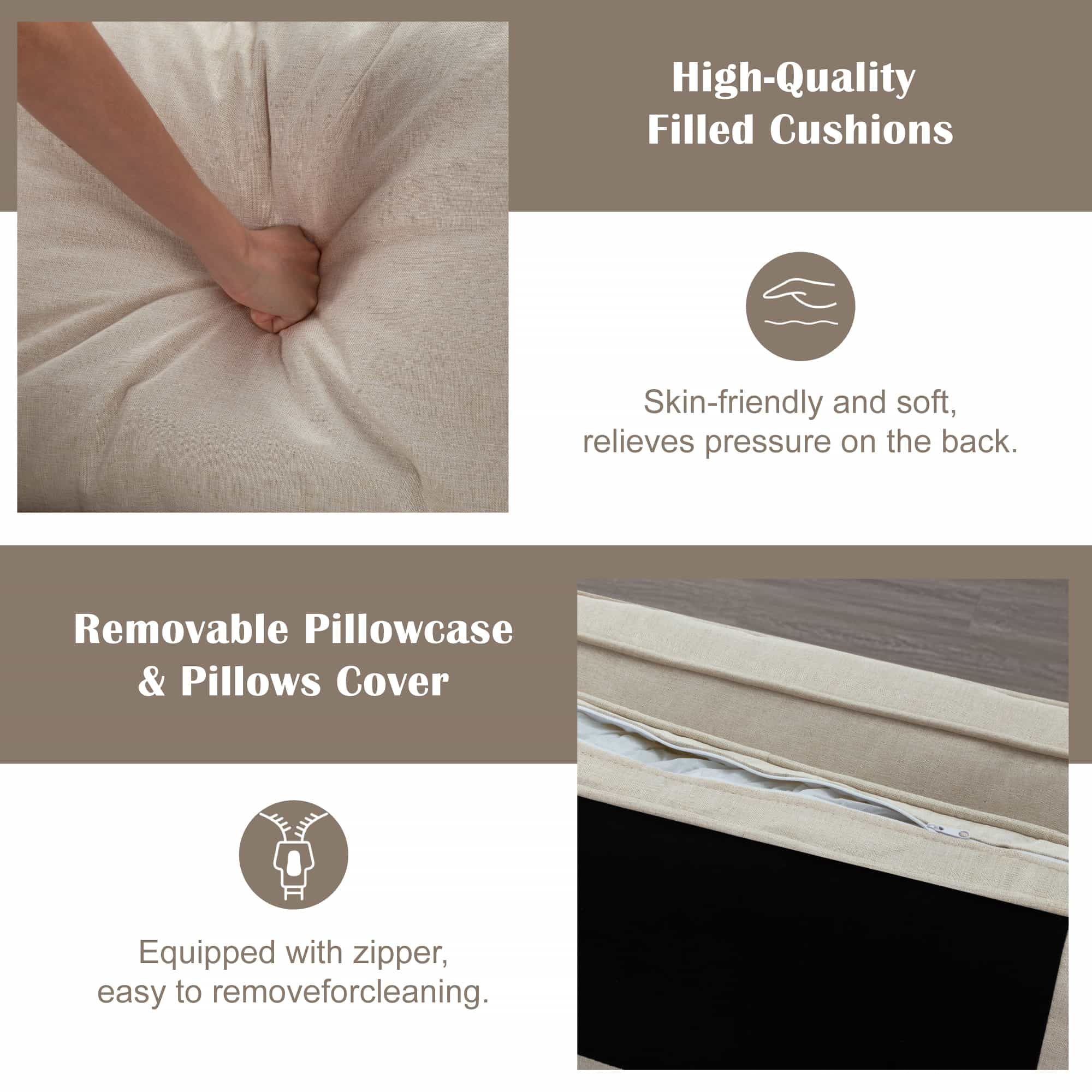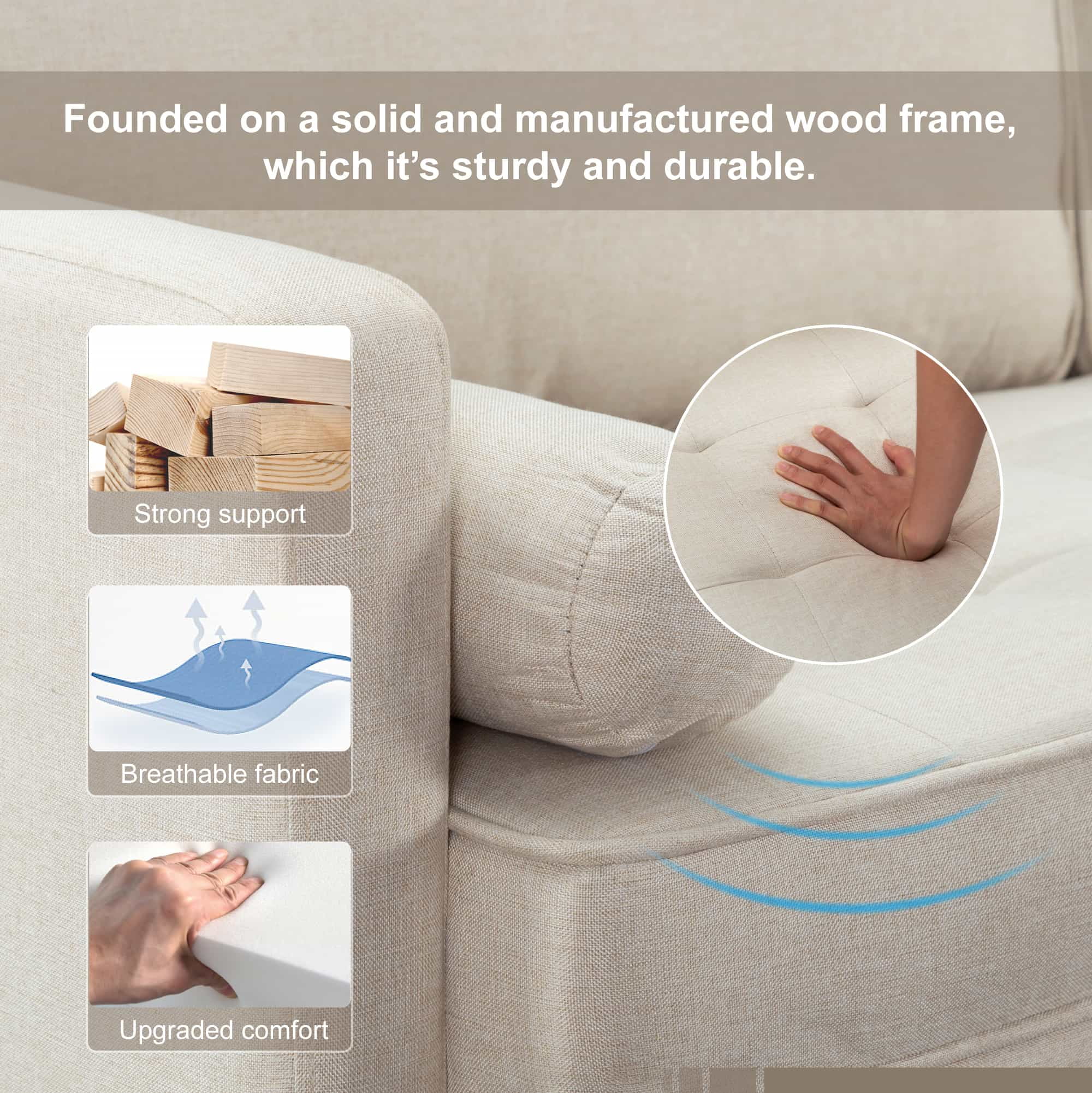 65” Modern Couch/Loveseat. This sophisticated, chic, and minimalist design is a perfect addition to any living space, including living rooms, home offices, bedrooms, and more. Constructed on a robust and durable manufactured wood frame, ensuring sturdiness and longevity. Features a detachable backrest and removable back cushion for easy cleaning, maintaining a tidy appearance. Equipped with solid tapered wood legs that include non-slip pads to prevent scratching floors while ensuring stability. Comes with two matching color bolster pillows. The package includes hidden components and hardware stored underneath the sofa; please inspect before assembly. Vacuum-packed for protection. Press and pat the cushions upon unpacking, allowing them to fully rebound over 72 hours for optimal use. The sofa is packed in one box with all necessary tools included. Should you have any questions, please contact us for an installation video. Caution *** Please do not open the compressed packaging until your sofa frame is completely assembled, otherwise it can’t be repacked in original packing way to return. *** Please review the product dimension and check if it’s suitable for your room. *** It might be have color difference due to photograph lighting, or computer monitor displayed. It’s not quality issue.