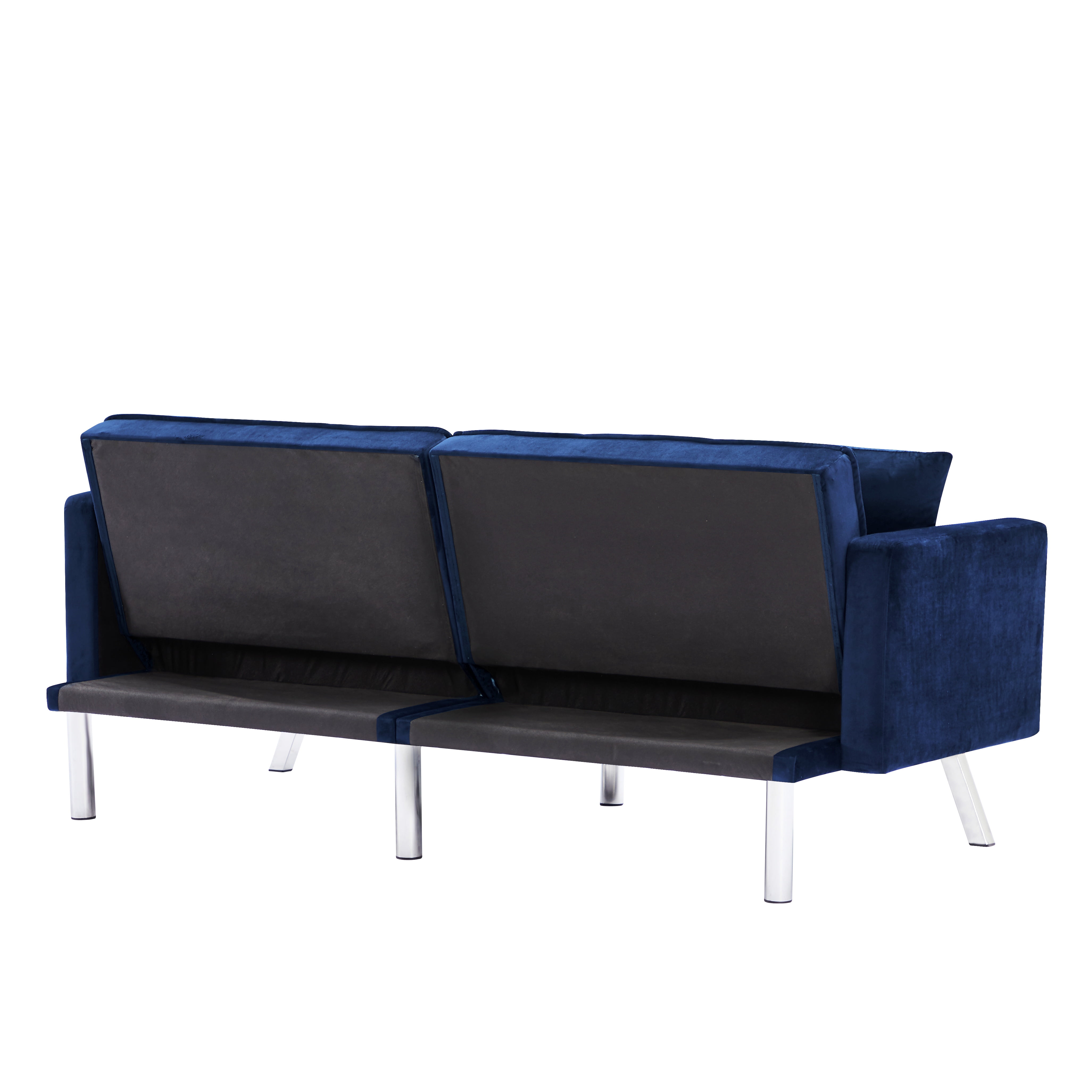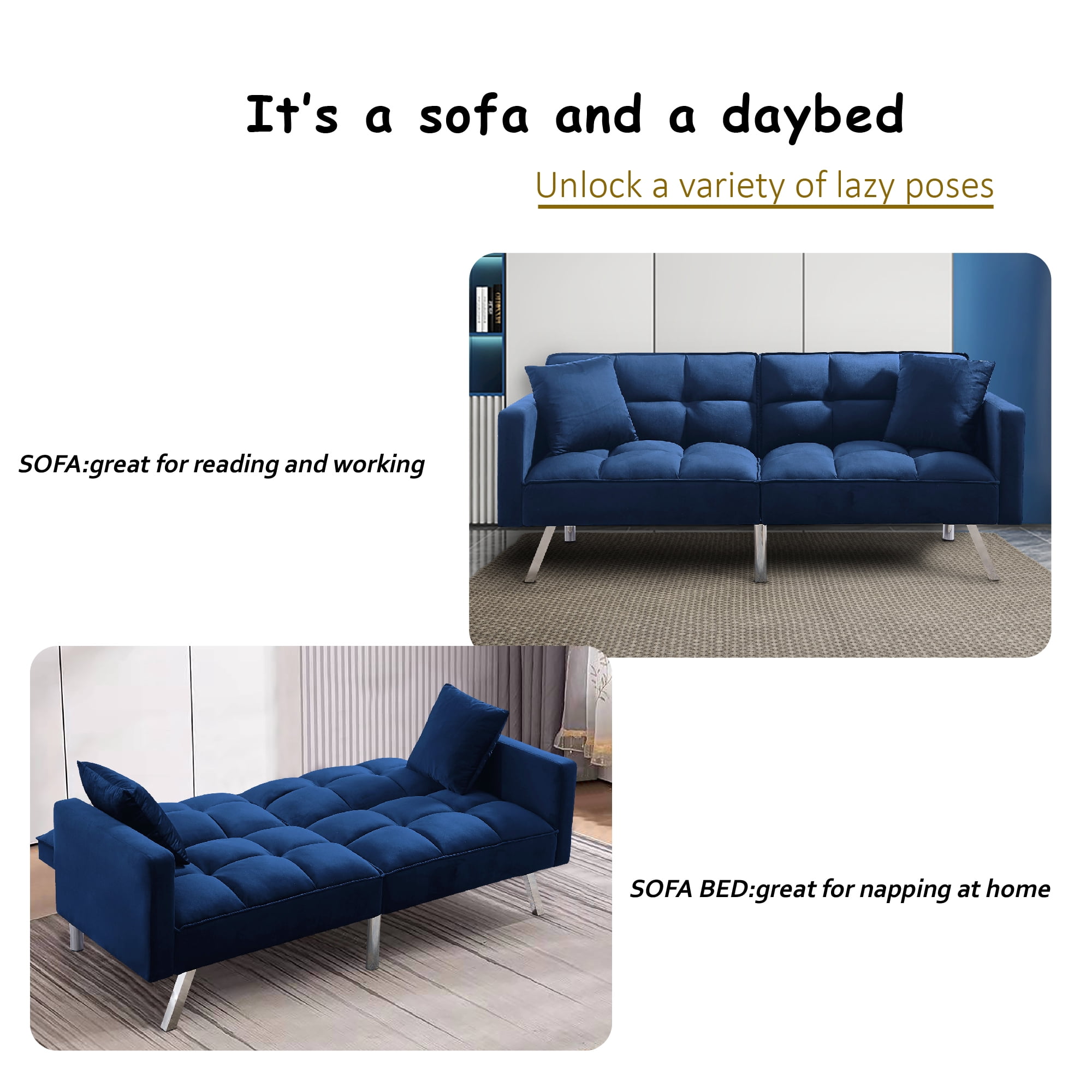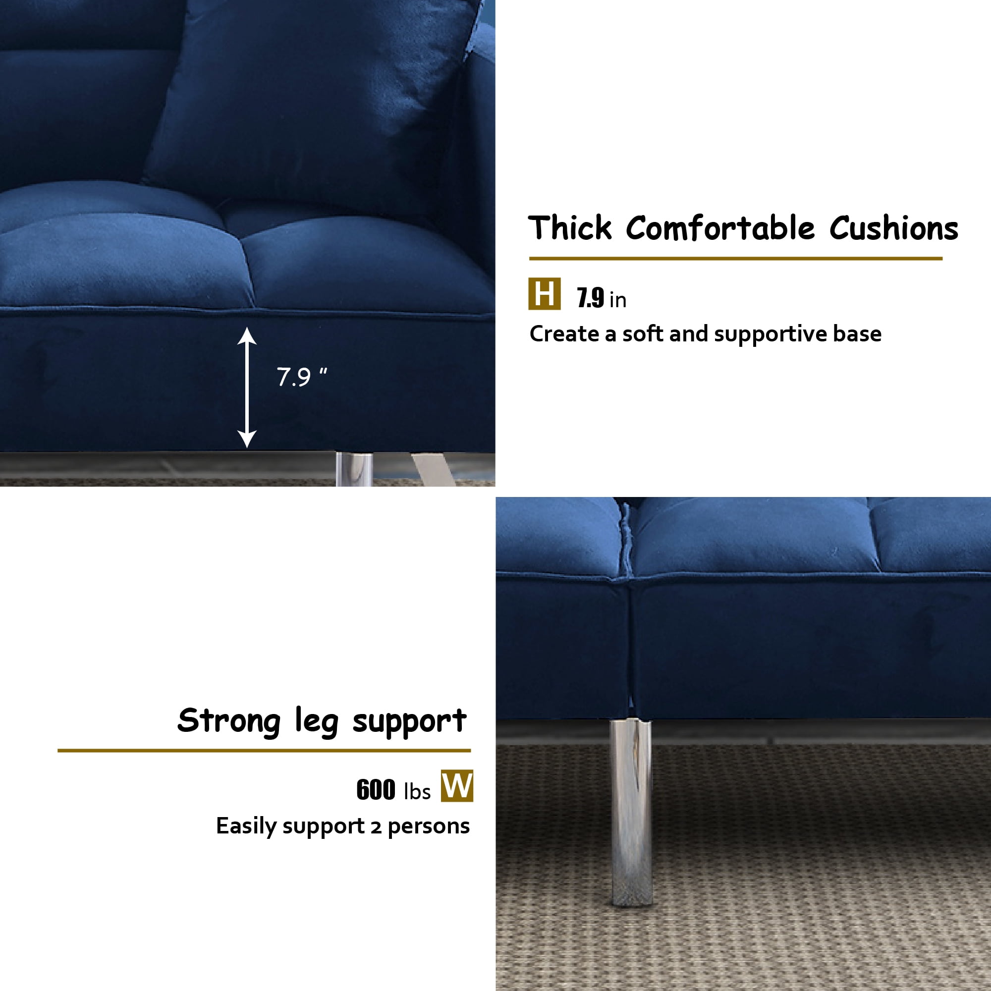 Overall – sofa 74 x 31.9 x 29.1″H—– sleeper 74 x 38.2x 24″H Back Cushion 18.9”H Seat Width 65” Seat Depth 18.9” Seat Height 16.5” Arm Height 24” Leg Height 8.6” Product Weight 81.4 LBS Gross Weight 94.8 LBS Carton size 39.37”x34.25”x8.46”(1),39.37”x34.25”x8.46”(2) Product Type Sleeper Sofa Sleeper Size Twin Seating Capacity 2 Upholstery Material 100% Velvet Upholstery Color White, Black, Light gray, Navy blue Leg Material / Color Silver metal Seat Fill Material Foam Back Fill Material Foam Frame Material Solid + Manufactured Wood Seat Construction Solid wood + Sinuous Spring Arm Type Square Arm Seat Style Tufted Seat Back Type Tufted back Pillows 2 included Back & Seat Not removable Minimum Door width 10” Weight Capacity 600 LBS Product Care Wipe with dry cloth Intended Use Residential Use Country of Origin China Shipping Courier Assembly Required Yes Level of Assembly Partial Assembly 【Comfortable Sofa Bed】 The sleeper couch is filled with thick foam with built-in springs to make your upholstered sofa comfortable and stretchy. The sofa cover is made of velvet fabric, which is soft to the touch. Give you the most comfortable experience. 【Upscale Material】This Futon sofa bed is covered with velvet,which is very soft and comfortable to touch,like baby skin.It’s very easy to care and will not wrinkle or fade.Contemporary design for your office or living room. 【Futon Design】This futon sofa bed’s backrest supports two angles,meet your different needs easily. 【perfect Structure】The frame of this futon sofa bed is solid wood and manufactured wood.Weight capacity reaches 600 LBS.Perfect additional for your home and office. 【Convertible Sofa Bed Features】 This multi-function sofa couch is designed with a folding backrest and has two adjustable positions, which can easily convert for lounging, where you can lie down to enjoy a movie or watching TV , or convert into a sleeper that is comfortable and gives extra sleeping space for sleepovers. The convertible sofa bed is made of solid manufactured wood and metal legs, making it sturdy and durable.Weight capacity can be up to 600 lbs 【Easy for assembling】:open the zipper on bottom of the sofa,take out the arms,legs,and hardware,then takes few minutes to assemble the sofa. Notes: two parcels may deliver separately on different days. Age Group:Adult. – Due to production design issues, there may be some slight deviation in the actual size of the product, but it will not affect your normal use.Please review the product dimension and check if it’s suitable for your living room. – It might be have color difference due to photograph lighting, or computer monitor displayed. It’s not quality issue.