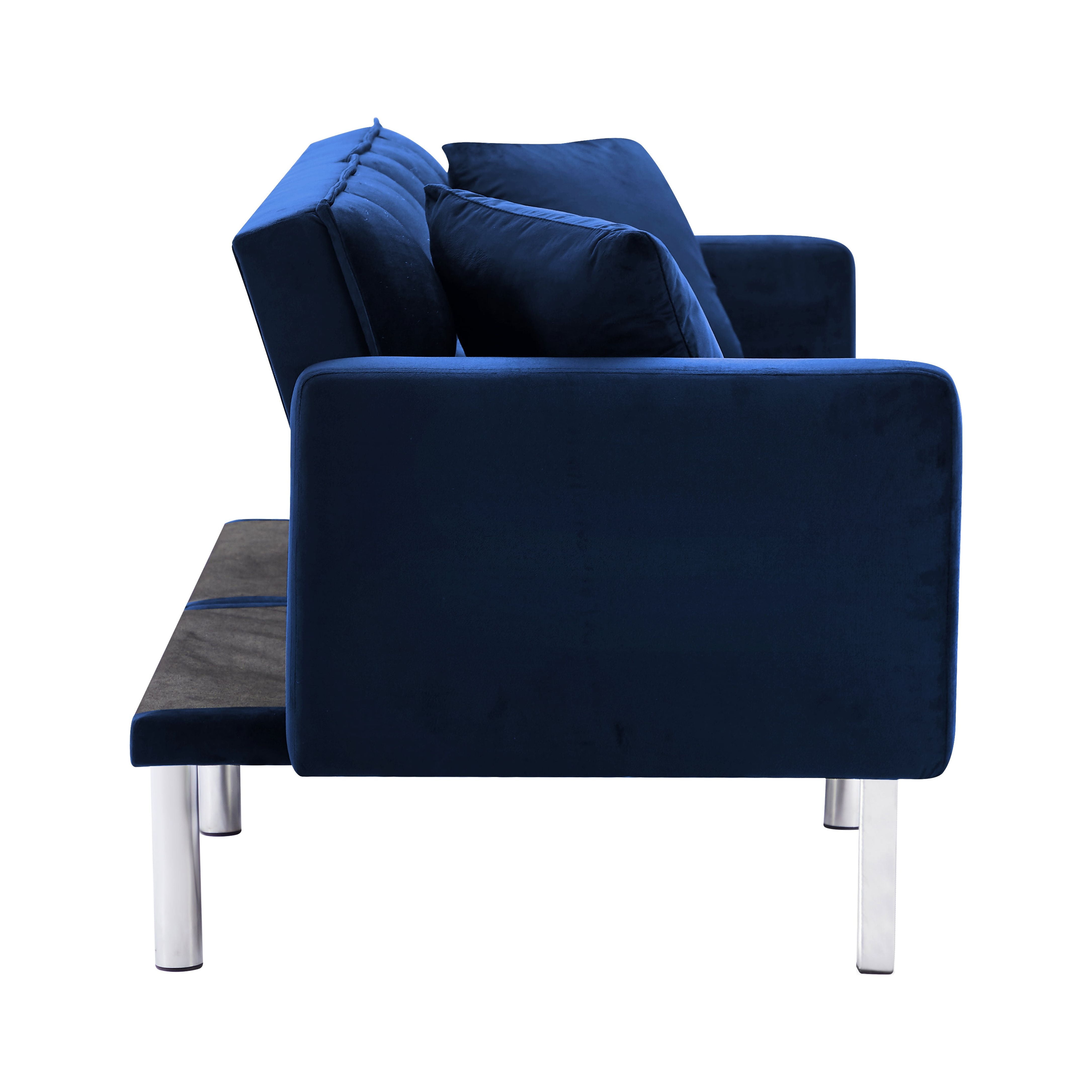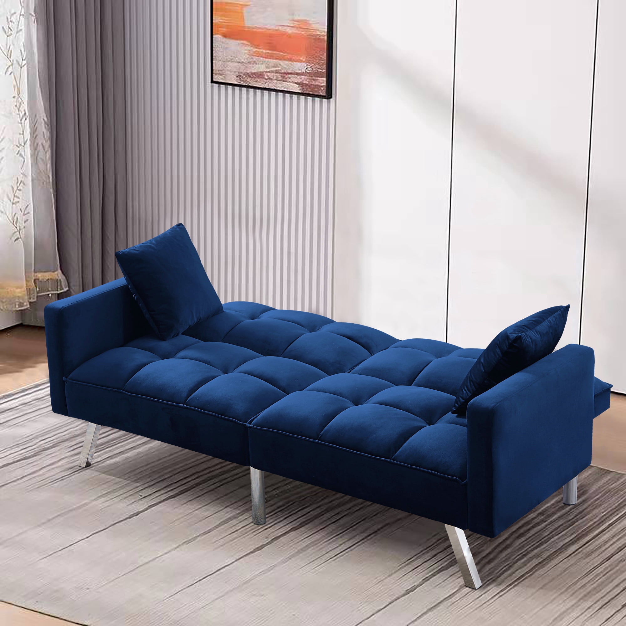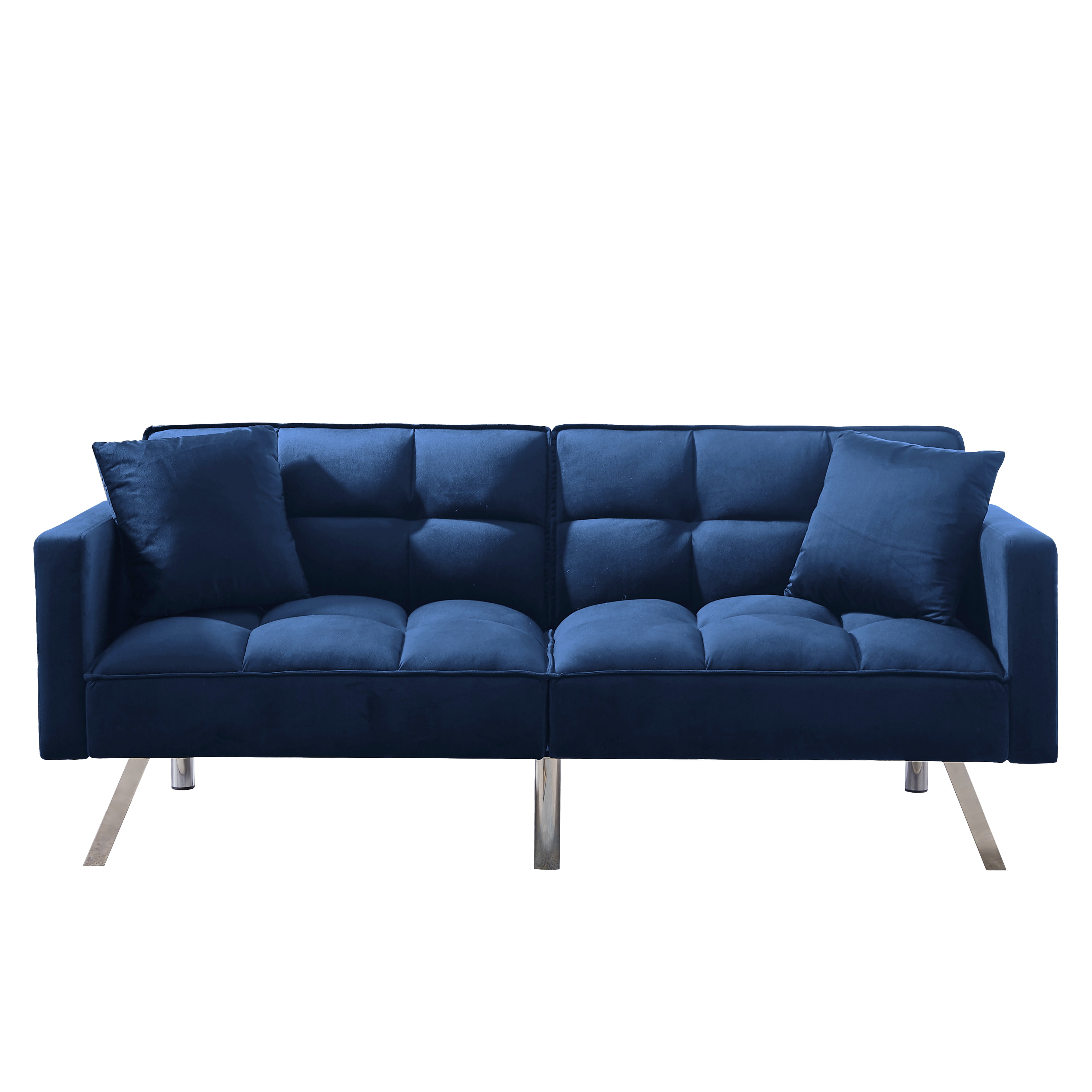 Overall – sofa 74 x 31.9 x 29.1″H—– sleeper 74 x 38.2x 24″H Back Cushion 18.9”H Seat Width 65” Seat Depth 18.9” Seat Height 16.5” Arm Height 24” Leg Height 8.6” Product Weight 81.4 LBS Gross Weight 94.8 LBS Carton size 39.37”x34.25”x8.46”(1),39.37”x34.25”x8.46”(2) Product Type Sleeper Sofa Sleeper Size Twin Seating Capacity 2 Upholstery Material 100% Velvet Upholstery Color White, Black, Light gray, Navy blue Leg Material / Color Silver metal Seat Fill Material Foam Back Fill Material Foam Frame Material Solid + Manufactured Wood Seat Construction Solid wood + Sinuous Spring Arm Type Square Arm Seat Style Tufted Seat Back Type Tufted back Pillows 2 included Back & Seat Not removable Minimum Door width 10” Weight Capacity 600 LBS Product Care Wipe with dry cloth Intended Use Residential Use Country of Origin China Shipping Courier Assembly Required Yes Level of Assembly Partial Assembly 【Comfortable Sofa Bed】 The sleeper couch is filled with thick foam with built-in springs to make your upholstered sofa comfortable and stretchy. The sofa cover is made of velvet fabric, which is soft to the touch. Give you the most comfortable experience. 【Upscale Material】This Futon sofa bed is covered with velvet,which is very soft and comfortable to touch,like baby skin.It’s very easy to care and will not wrinkle or fade.Contemporary design for your office or living room. 【Futon Design】This futon sofa bed’s backrest supports two angles,meet your different needs easily. 【perfect Structure】The frame of this futon sofa bed is solid wood and manufactured wood.Weight capacity reaches 600 LBS.Perfect additional for your home and office. 【Convertible Sofa Bed Features】 This multi-function sofa couch is designed with a folding backrest and has two adjustable positions, which can easily convert for lounging, where you can lie down to enjoy a movie or watching TV , or convert into a sleeper that is comfortable and gives extra sleeping space for sleepovers. The convertible sofa bed is made of solid manufactured wood and metal legs, making it sturdy and durable.Weight capacity can be up to 600 lbs 【Easy for assembling】:open the zipper on bottom of the sofa,take out the arms,legs,and hardware,then takes few minutes to assemble the sofa. Notes: two parcels may deliver separately on different days. Age Group:Adult. – Due to production design issues, there may be some slight deviation in the actual size of the product, but it will not affect your normal use.Please review the product dimension and check if it’s suitable for your living room. – It might be have color difference due to photograph lighting, or computer monitor displayed. It’s not quality issue.
