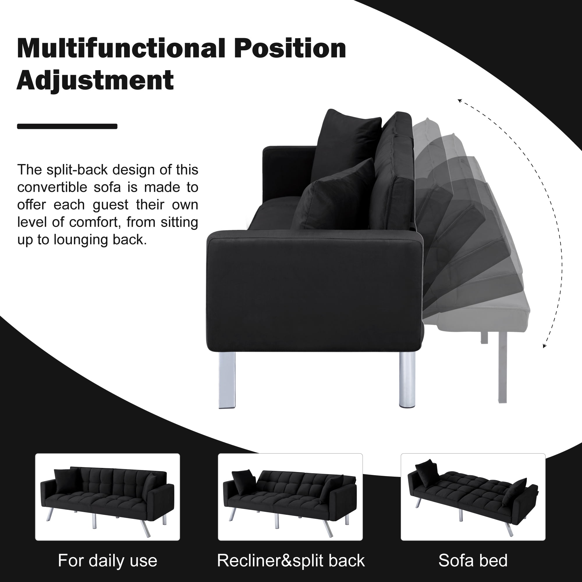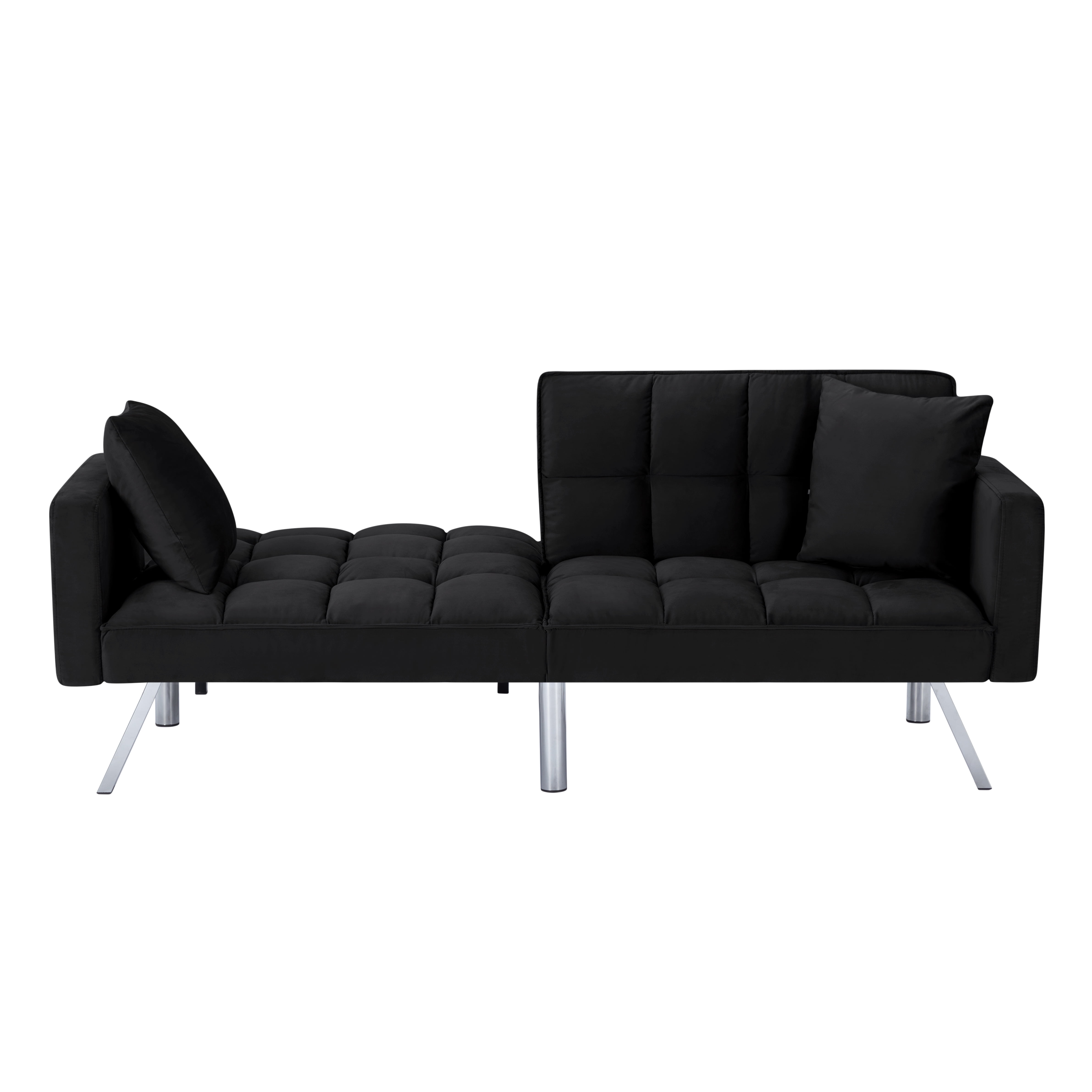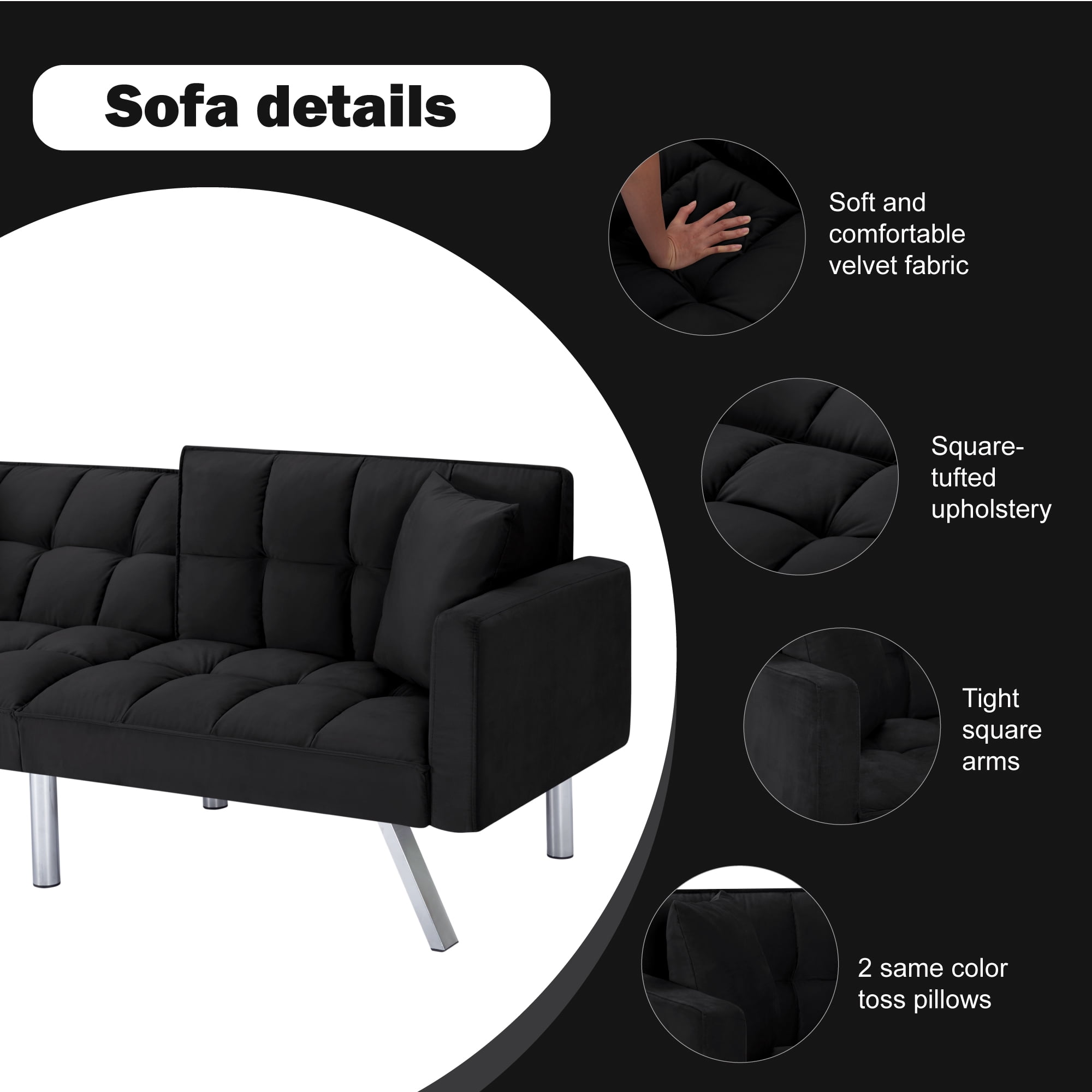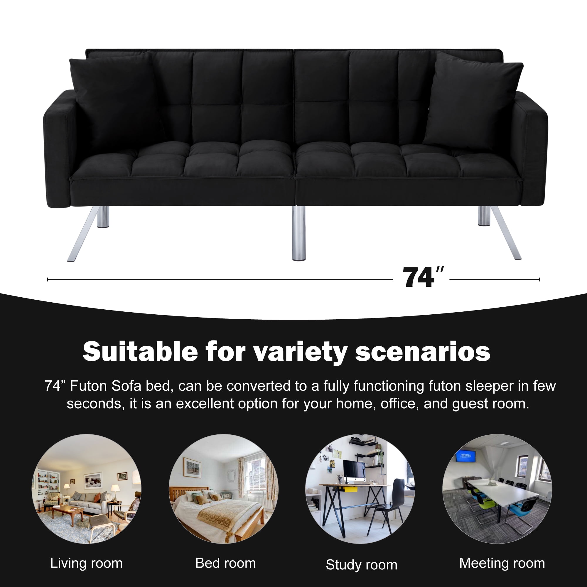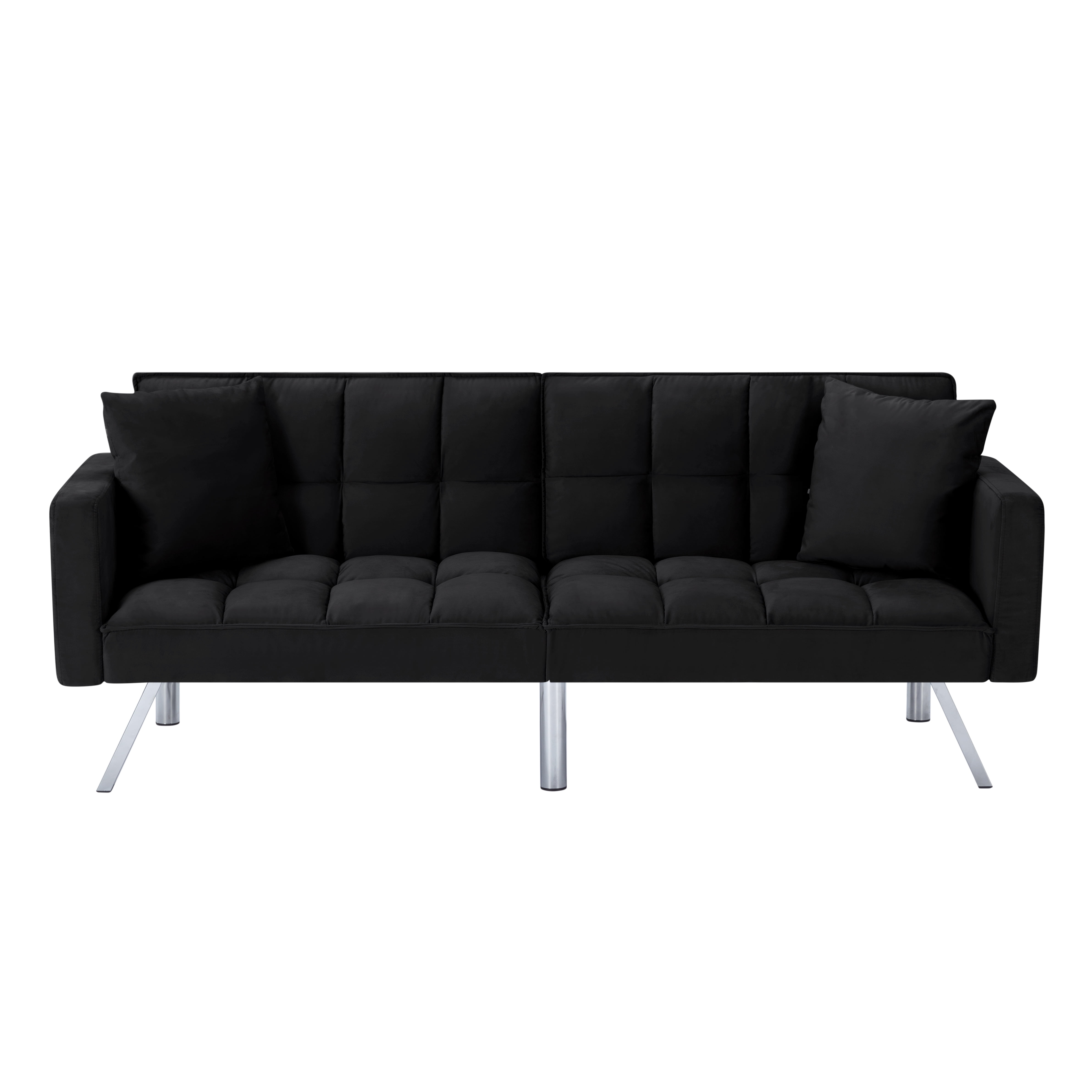 Description / Features – 74” Futon Sofa bed, can be converted to a fully functioning futon sleeper in few seconds, it is an excellent option for your home, office, and guest room. – Founded on a solid and manufactured wood frame with metal mechanisms, clean-lined silhouette with an angled backrest, tight square arms, and metal legs, enveloped in tailored velvet upholstery, – Square-tufted upholstery. – Soft and comfortable velvet fabric. – The backrest has 3 angles for adjusting to meet various requirements. The split-back design of this convertible sofa is made to offer each guest their own level of comfort, from sitting up to lounging back. You can even lay flat both the seat and back cushions to create a comfortable place. – 2 same color toss pillows included. – Take out the arms, legs, and hardware from bottom of the sofa , then takes few minutes to assemble the sofa. *** Please do not open the compressed packaging until your sofa frame is completely assembled, otherwise it can’t be repacked in original packing way to return. *** Please review the product dimension and check if it’s suitable for your room. *** It might be have color difference due to photograph lighting, or computer monitor displayed. It’s not quality issue. Thanks for your kindly understanding. Any questions, please feel free to contact us.