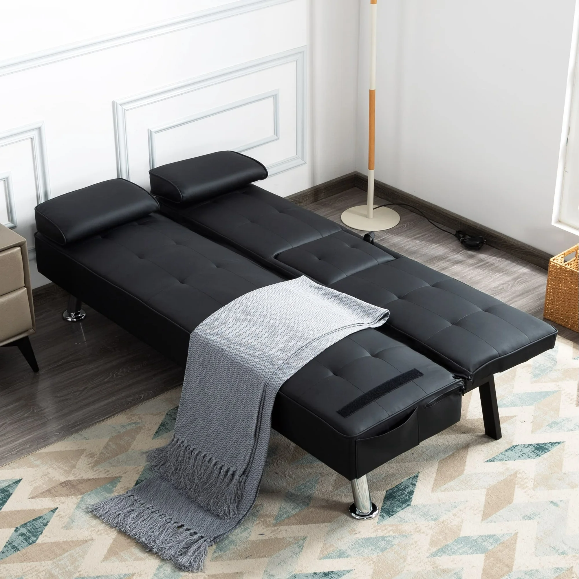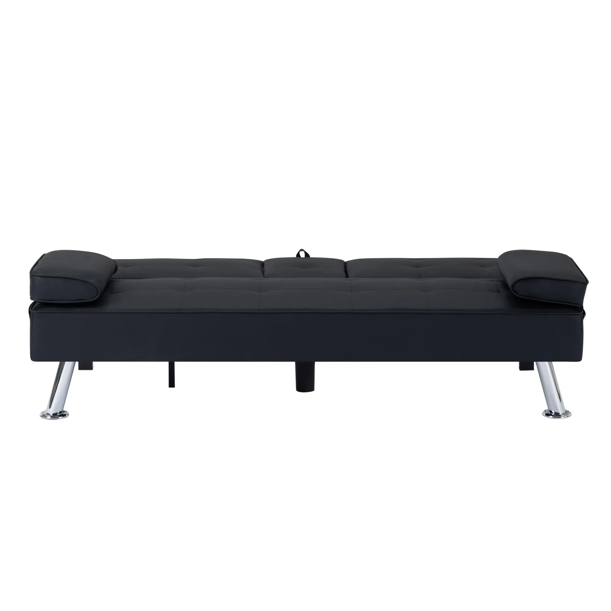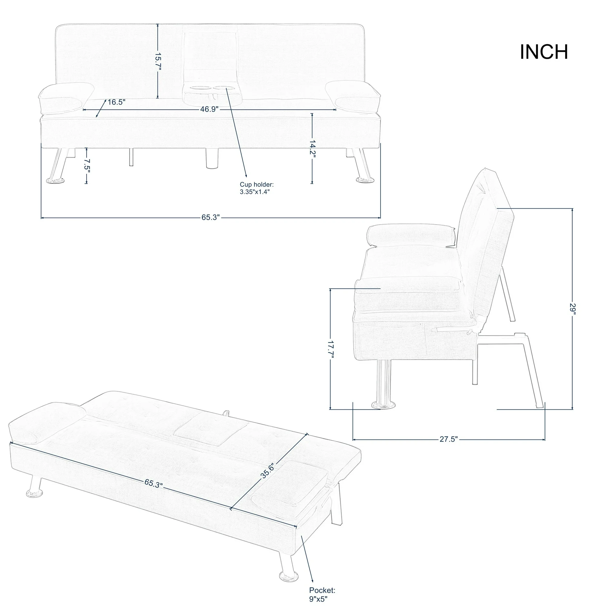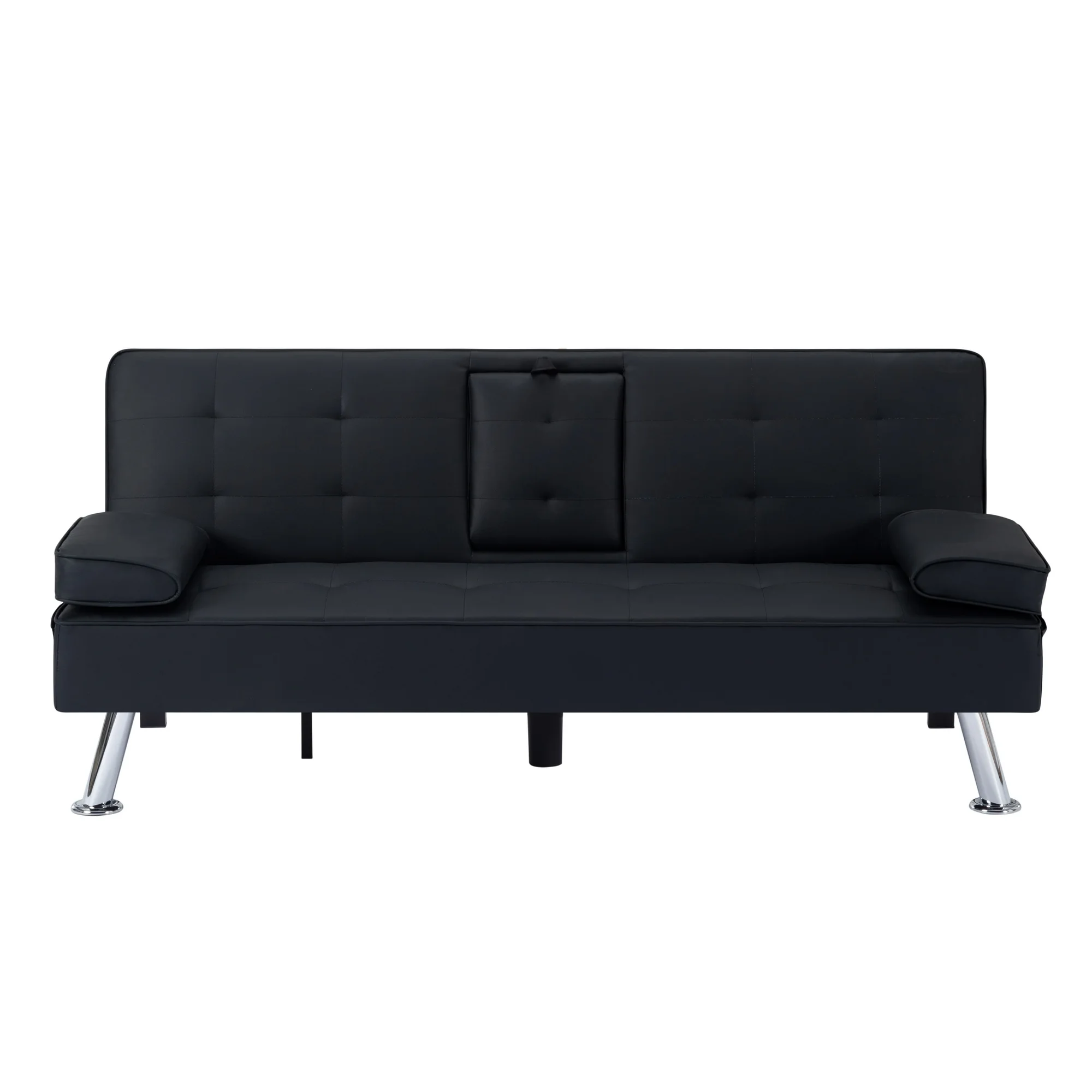 The 65.3” Futon Sleeper Sofa Bed is the perfect solution for small apartments, home offices, guest rooms, or any space where versatility and comfort are key. Combining sleek design with practical features, making it an ideal choice for those who value both form and function. Sophisticated Design Meets Sturdy Construction: Built on a solid wood and manufactured wood frame, reinforced with high-quality metal mechanisms to ensure long-lasting support. The clean-lined silhouette features an angled backrest, tight square arms, and elegant chrome metal legs, giving it a modern yet timeless aesthetic. Upholstered in tailored linen fabric, complements any décor, from contemporary to minimalist. Adjustable Comfort for Every Need: It’s 3-position adjustable backrest, allowing you to customize your seating or lounging experience, Whether you want to sit upright for reading, TV watching, or lay flat for a quick nap. The drop-down middle back includes two convenient cup holders, perfect for keeping drinks within easy reach while relaxing. Effortless Conversion from Sofa to Bed: The sturdy metal mechanisms ensure smooth operation, allowing you to convert it into a fully functional futon sleeper in seconds. Making it an excellent choice for overnight guests or small-space living. Smart Storage and Added Convenience: Includes a side storage pocket, perfect for stashing small essentials like remote controls, or mobile devices. Additionally, the two removable arm cushions double as lumbar pillows, offering extra support when needed. Product Type: Sleeper Sofa Sleeper Size: Twin Overall – sofa: 65.3” x 27.5” x 29”H Open size- sleeper: 65.3” x 35.6” x 17.7”H Back Cushion: 15.7”H Seat Height: 14.2” Arm Height: 17.7” Product Weight: 46.2 LBS Gross Weight: 53.37 LBS Carton size: 65.75 x 17.72 x 7.48” Colour: Black, White, Dark Grey, Light Grey, Purple, Navy Blue Upholstery Material: PU: Black, White, Polyester: Dark Grey, Light Grey, Purple, Navy Blue Leg Color: Silver color Leg Material: Metal Chrome Seat Fill Material: Foam Back Fill Material: Foam Frame Material: Solid + Manufactured Wood Seat Construction: Solid wood + Sinuous Spring Arm Type: Pillow Arm Seat Style: Tight Seat Back Type: Tufted back Back & Seat: Not Removable Joinery: Corner-block-reinforced Main Wood Joinery Method: Basic Butt Kiln-Dried Wood: Yes Weight Capacity: 300 LBS each seat Product Care: Wipe clean with dry cloth, do not use strong liquid cleaners Assembly Required: Yes Level of Assembly: Partial Assembly Assembly Time: 5 Minutes Adult Assembly Required: Yes Suggested Number of People: 2 Additional Tools Required: All tools included *** Please review the product dimension and check if it’s suitable for your living room *** It might be have color difference due to photograph lighting, or computer monitor displayed. It’s not quality issue.