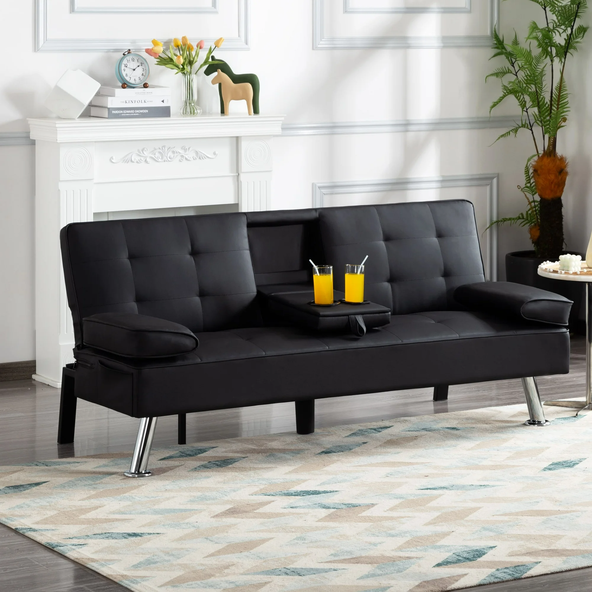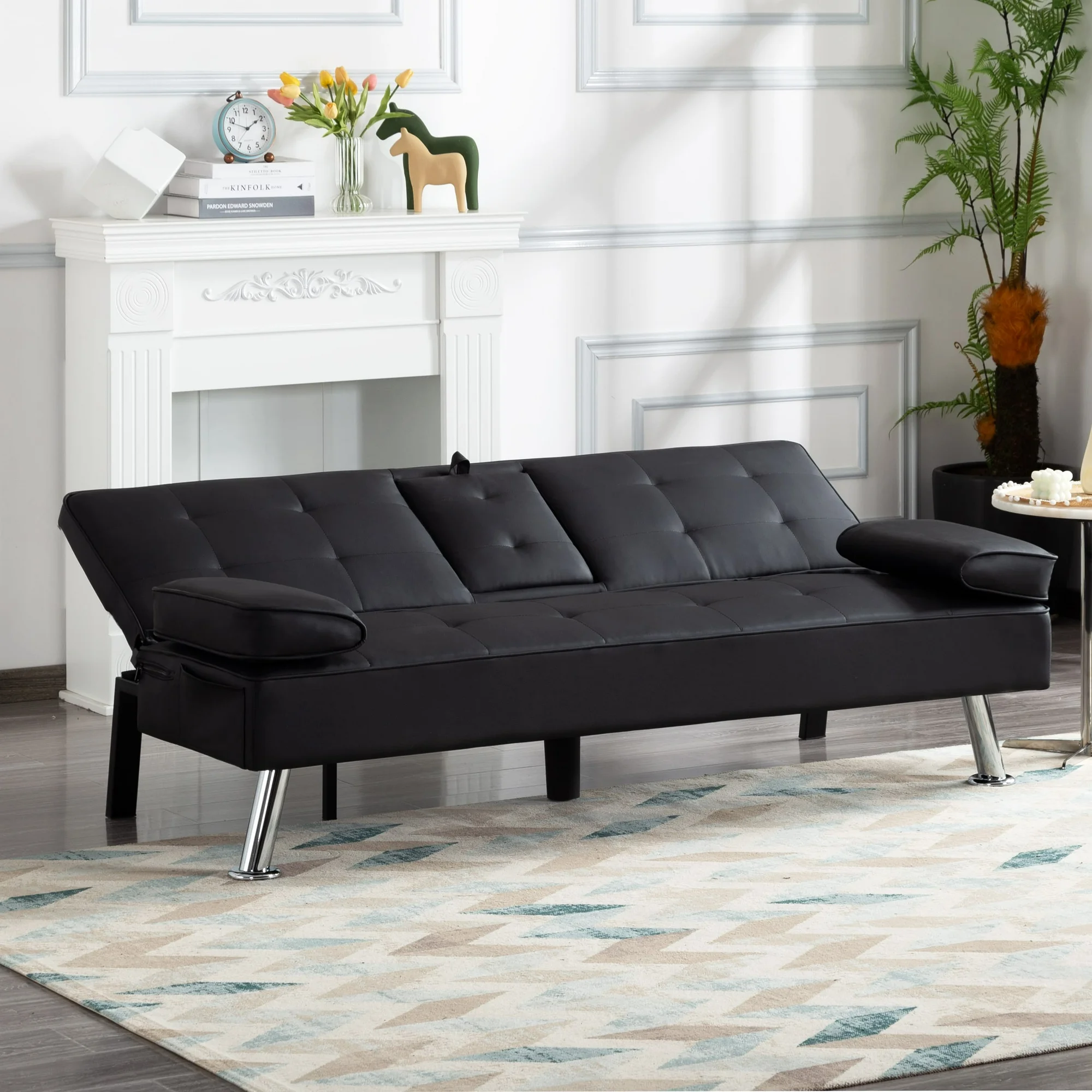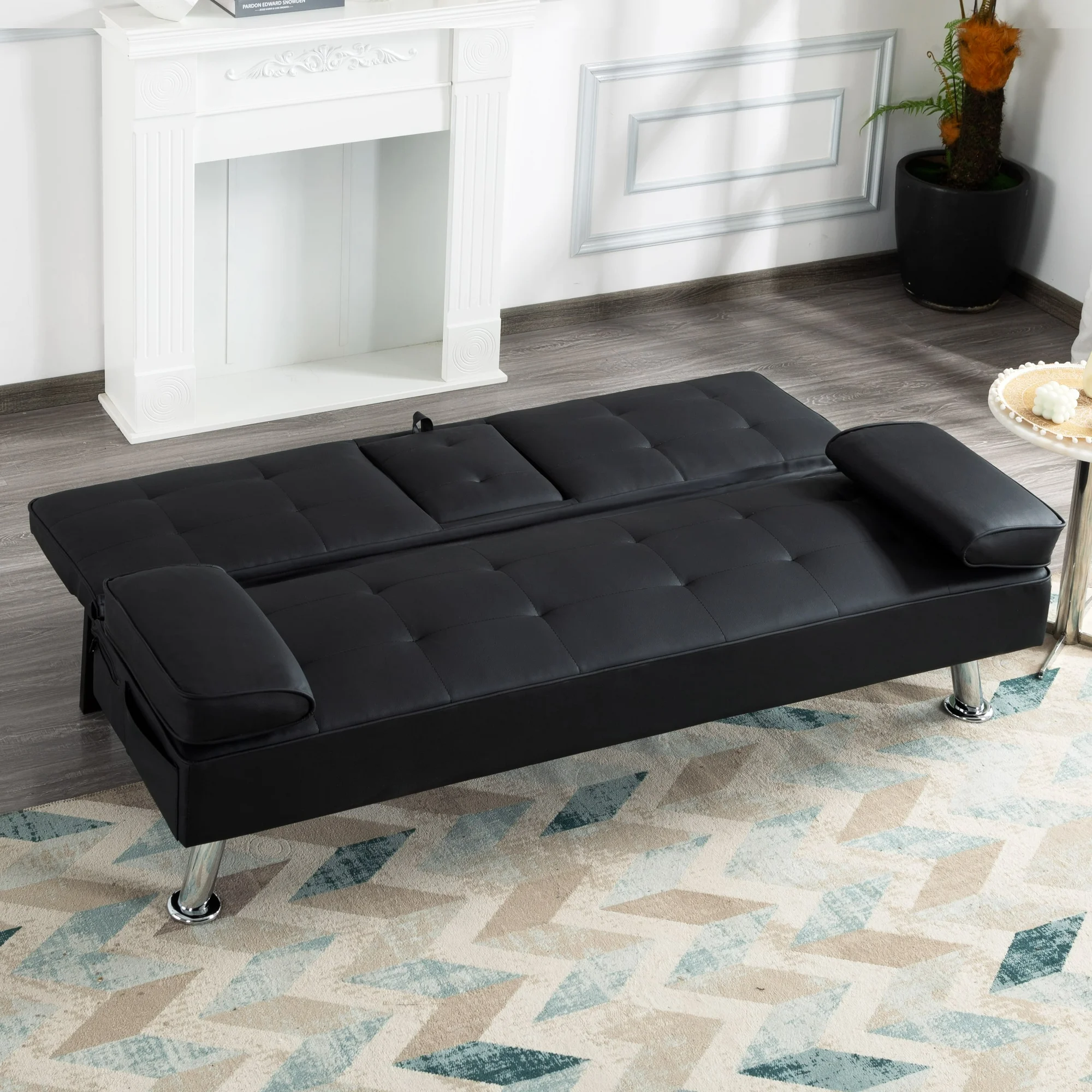 BSHTI Futon Convertible Sleeper Sofa Bed,With 3-Position Adjustable Backrest,Upholstered in PU Fabric,a Side Storage Pocket,Twin-Size Sleeper Sofa,Black