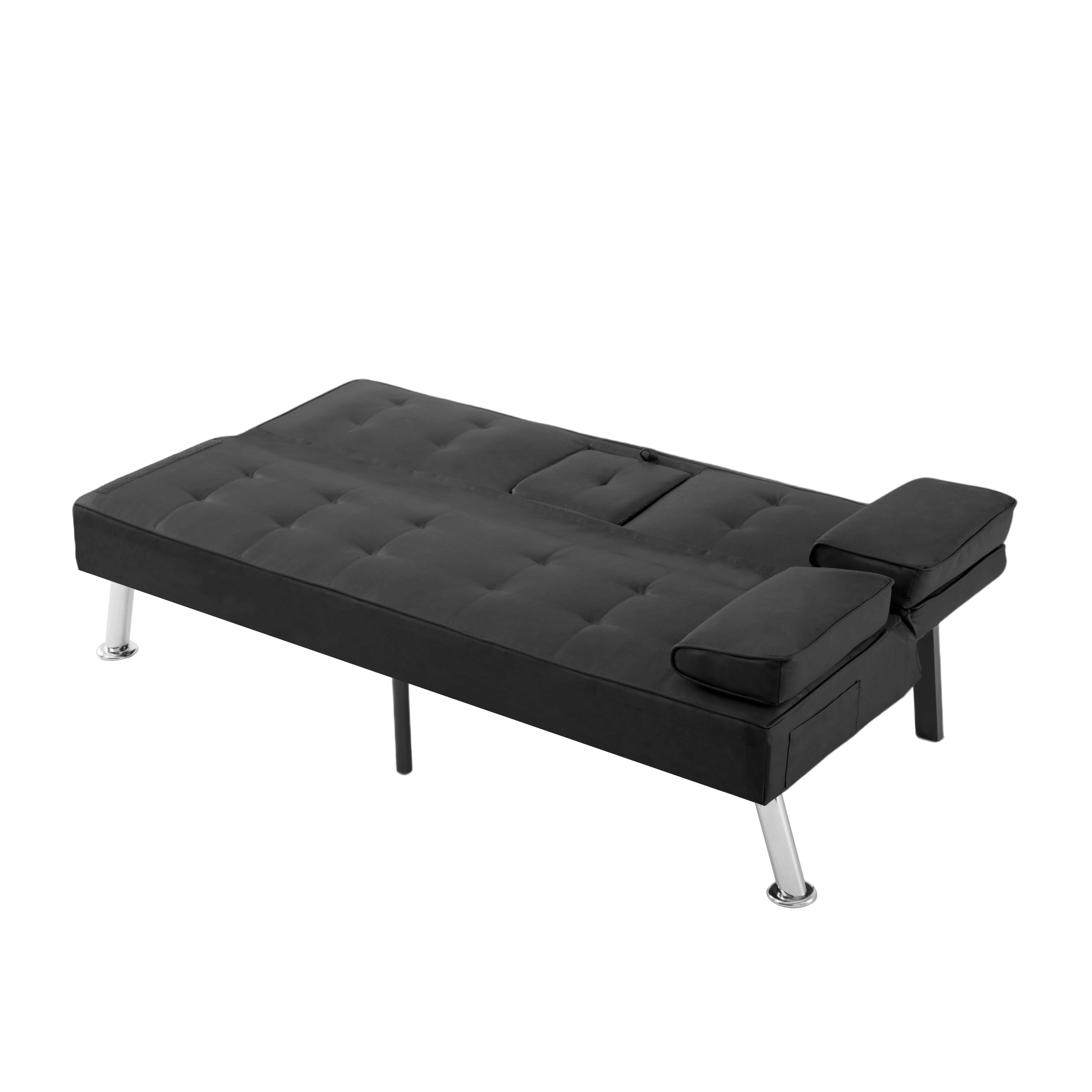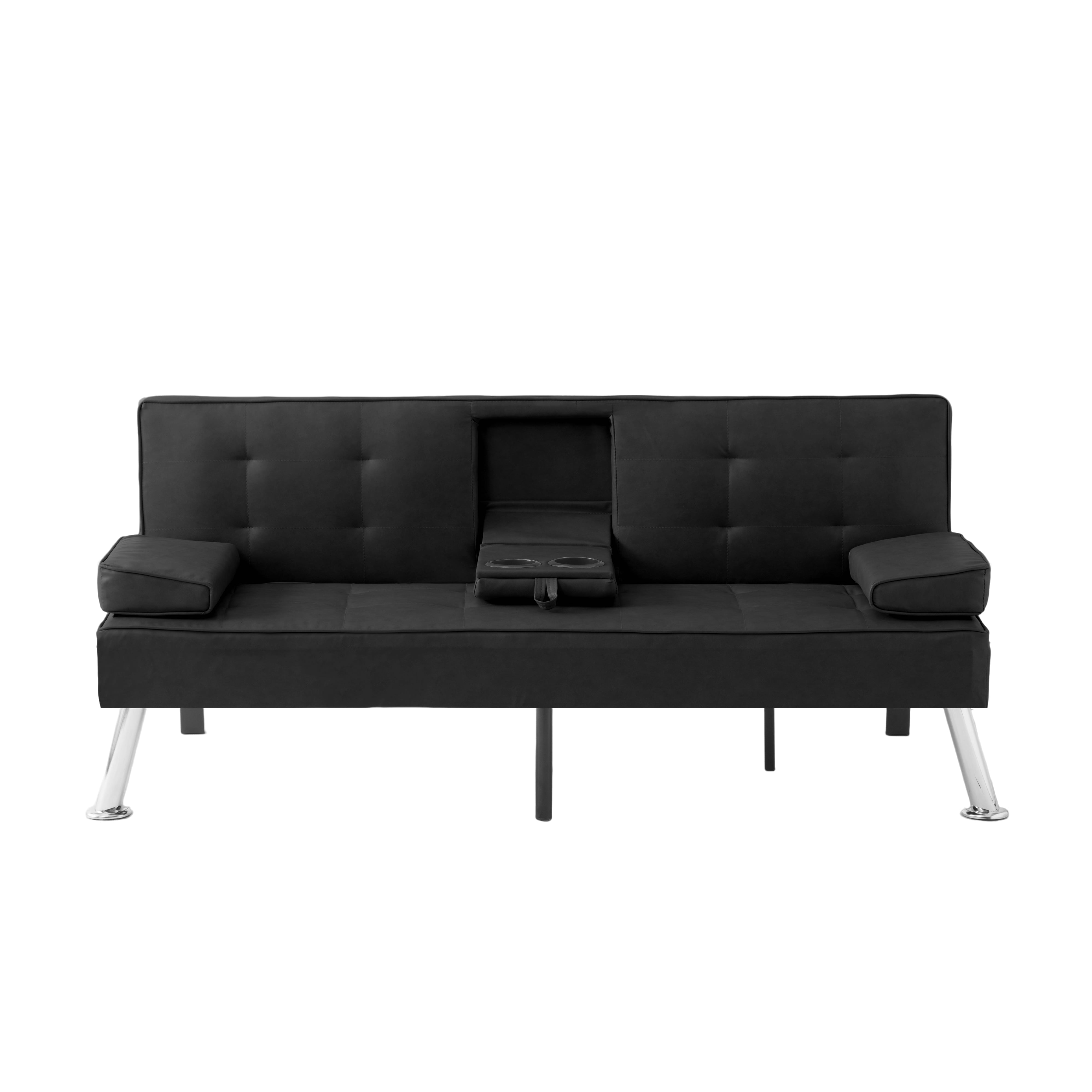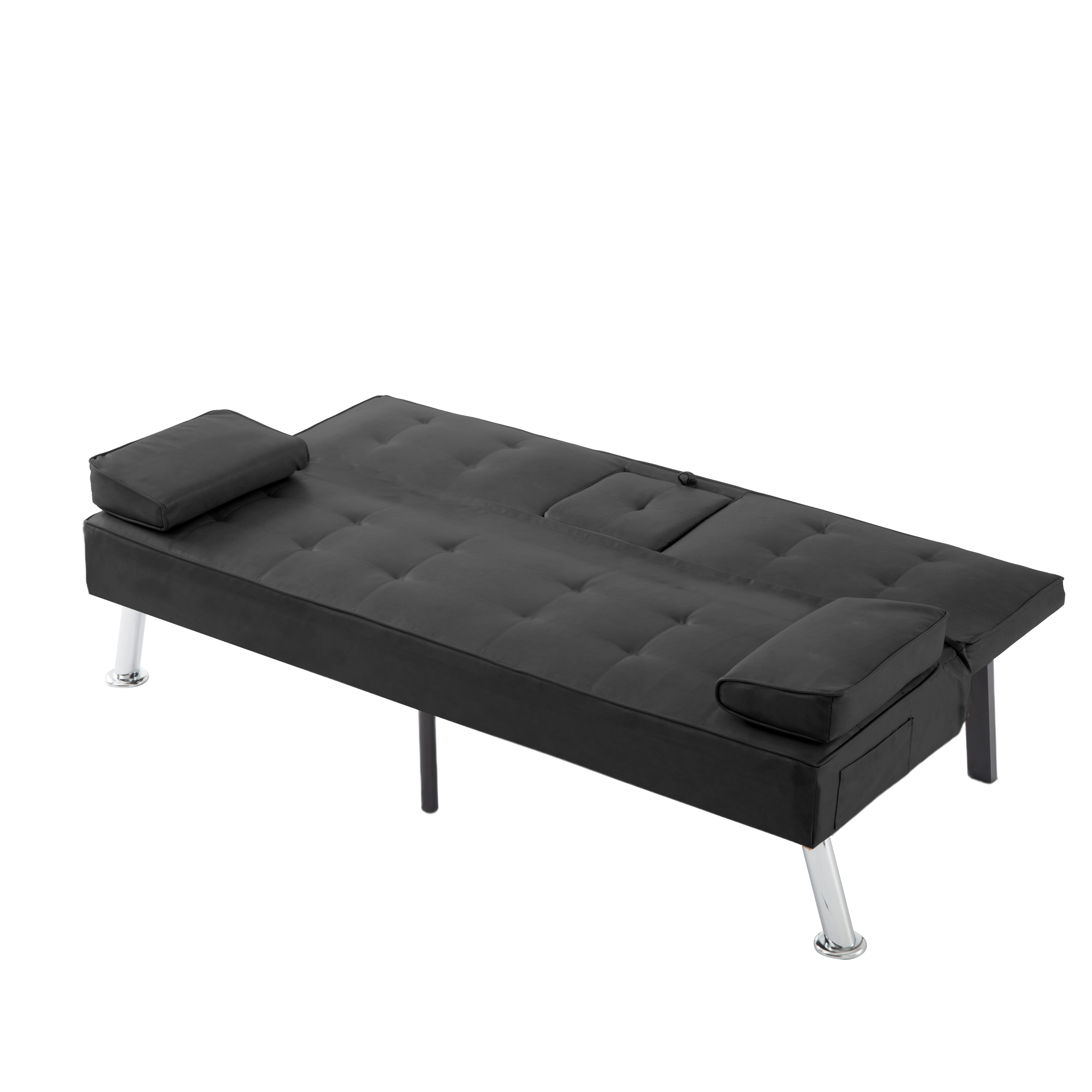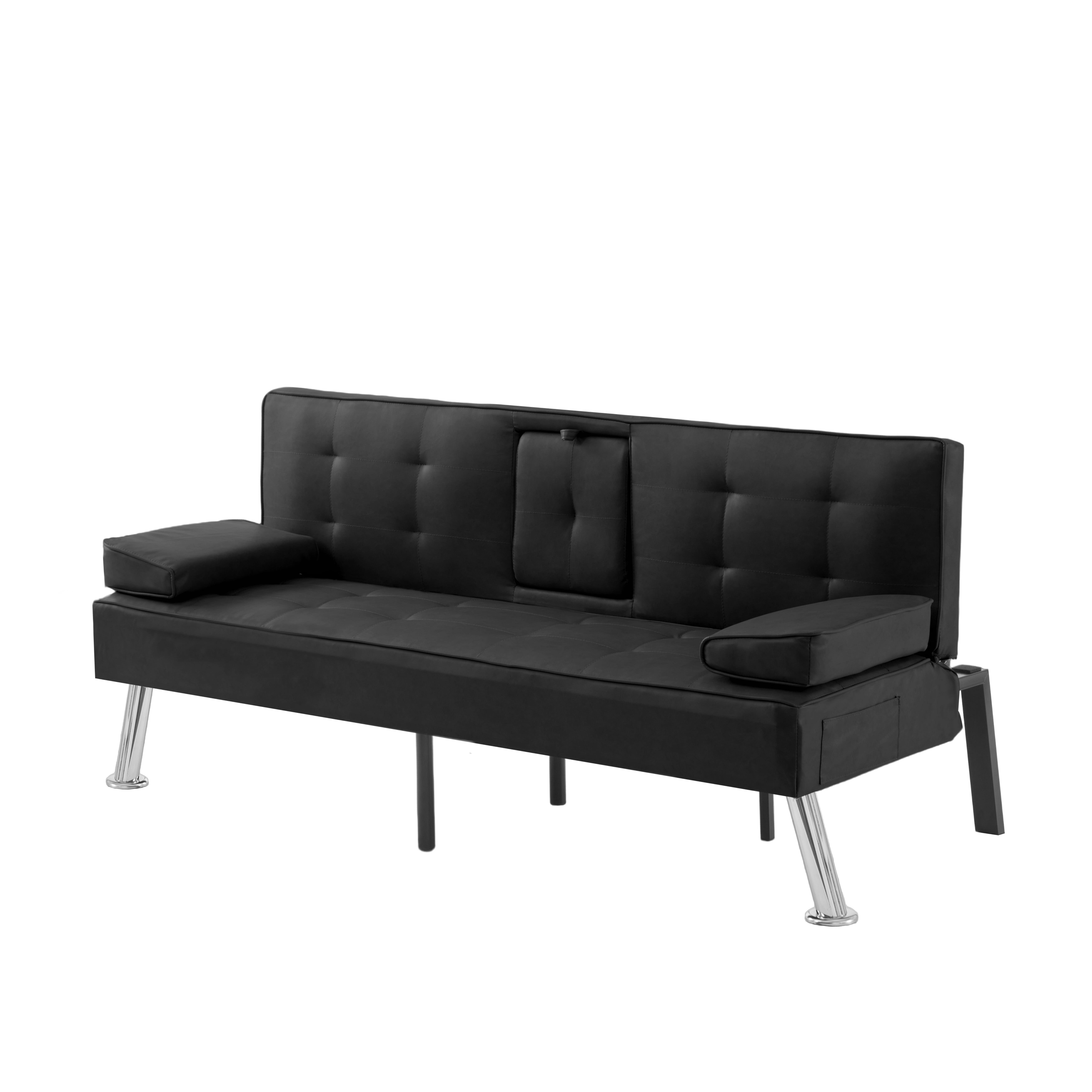 The 65.3” Futon Sleeper Sofa Bed is the perfect solution for small apartments, home offices, guest rooms, or any space where versatility and comfort are key. Combining sleek design with practical features, making it an ideal choice for those who value both form and function. Sophisticated Design Meets Sturdy Construction: Built on a solid wood and manufactured wood frame, reinforced with high-quality metal mechanisms to ensure long-lasting support. The clean-lined silhouette features an angled backrest, tight square arms, and elegant chrome metal legs, giving it a modern yet timeless aesthetic. Upholstered in tailored PU fabric, complements any décor, from contemporary to minimalist. Adjustable Comfort for Every Need: It’s 3-position adjustable backrest, allowing you to customize your seating or lounging experience, Whether you want to sit upright for reading, TV watching, or lay flat for a quick nap. The drop-down middle back includes two convenient cup holders, perfect for keeping drinks within easy reach while relaxing. Effortless Conversion from Sofa to Bed: The sturdy metal mechanisms ensure smooth operation, allowing you to convert it into a fully functional futon sleeper in seconds. Making it an excellent choice for overnight guests or small-space living. Smart Storage and Added Convenience: Includes a side storage pocket, perfect for stashing small essentials like remote controls, or mobile devices. Additionally, the two removable arm cushions double as lumbar pillows, offering extra support when needed.